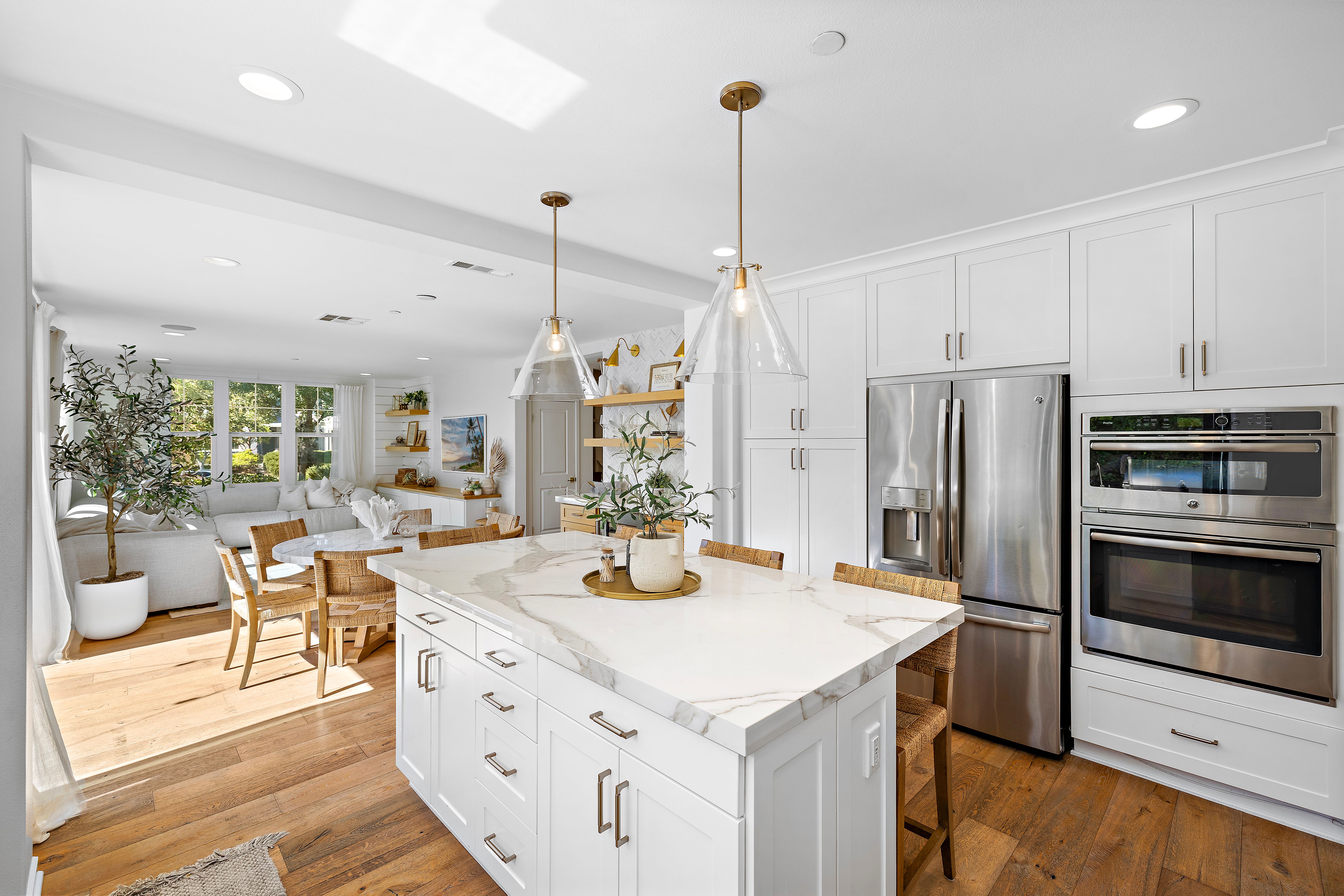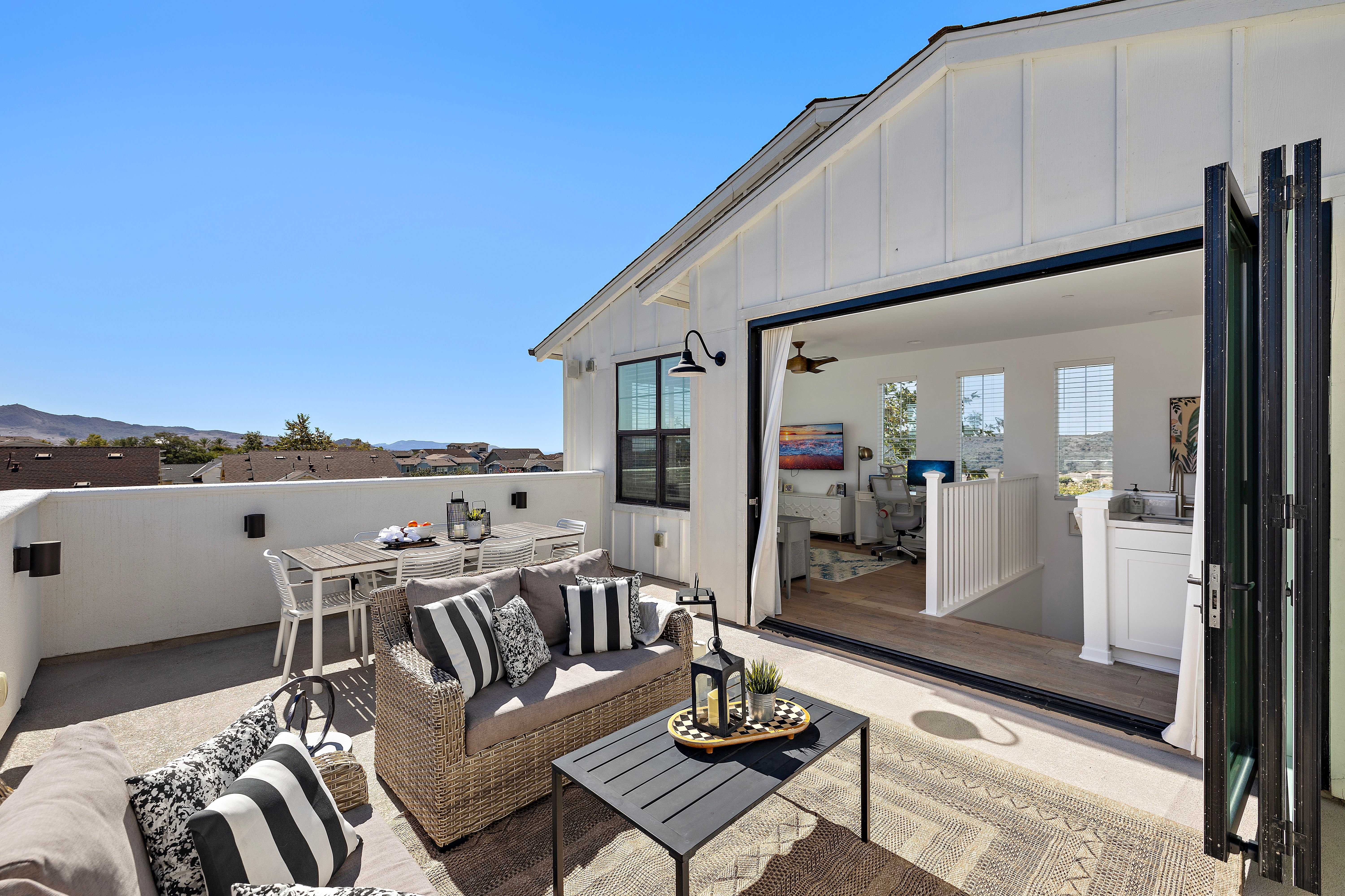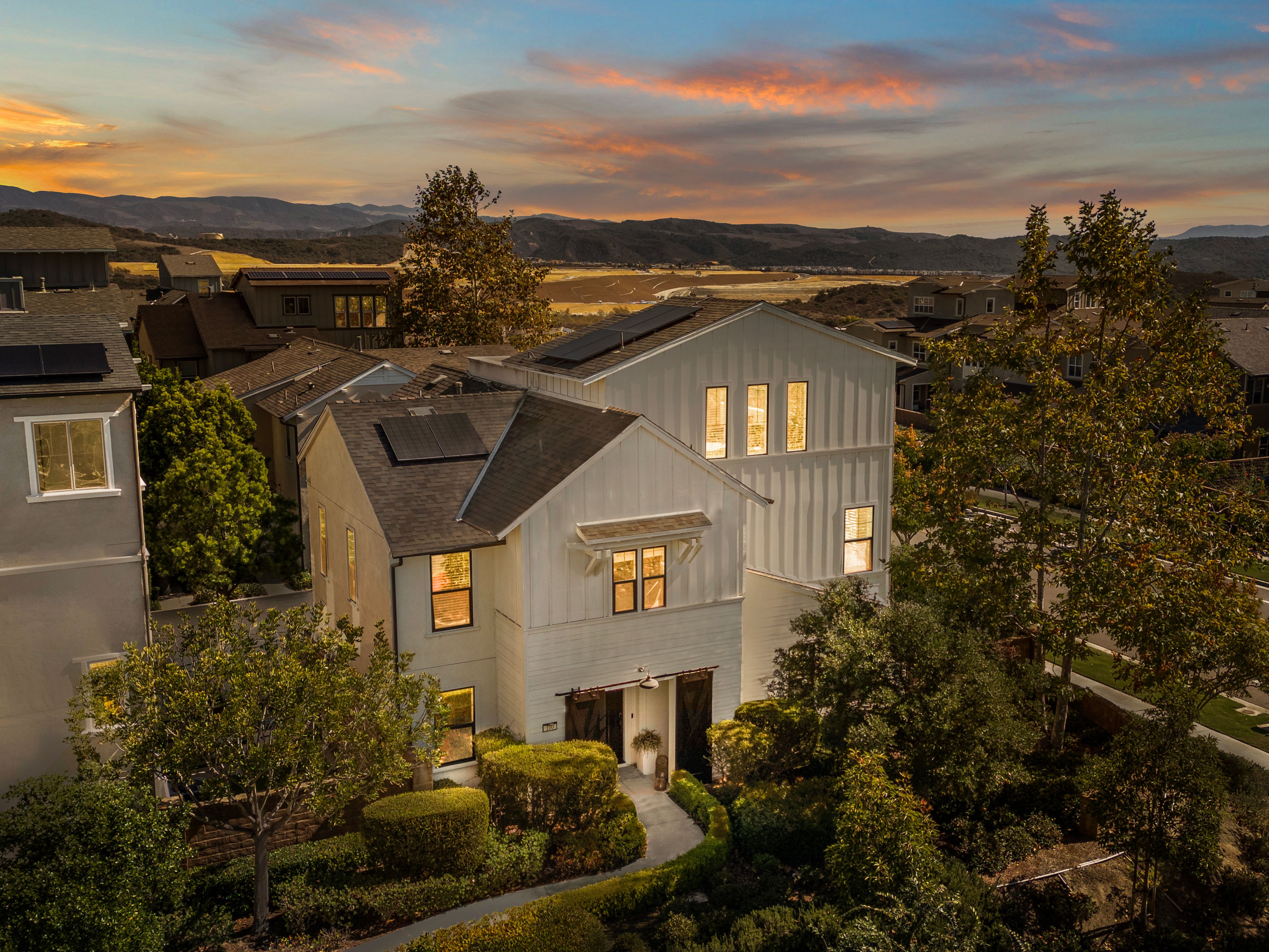 100 Vasto Street – Model Perfection, Elevated Beyond Compare! There’s something magical about model homes, and this former Robert Hidey Architects Canopy 3X model captures that spirit beautifully. Perfectly set at the end of a quiet street near the top of the hill, this modern farmhouse radiates warmth, light, and effortless indoor-outdoor living, all just steps from Rancho Mission Viejo’s premier amenities. Reimagined in 2022 with over $100K in thoughtful, high-end upgrades, including fresh Benjamin Moore paint throughout (ceilings included), high-end porcelain counters with extended island and full backsplash, custom bar with wine rack, designer fixtures, and garage recreation studio with recessed lighting, floating floors, cabinetry, Monster Racks hidden behind beautiful curtains, and dual EV charging. The entry flex room features custom iron and glass doors and a pocket door creating private en suite bath access. The chef’s kitchen shines with GE professional appliances, a Kohler Ripple Farm sink, and crisp white cabinetry opening to lush landscaping, Fire Magic BBQ, and bi-fold serving windows for seamless entertaining. Set within Rancho Mission Viejo, where resort-style pools, fitness centers, farms, and trails create a true sense of community. Life here feels like a daily retreat. Welcome home!