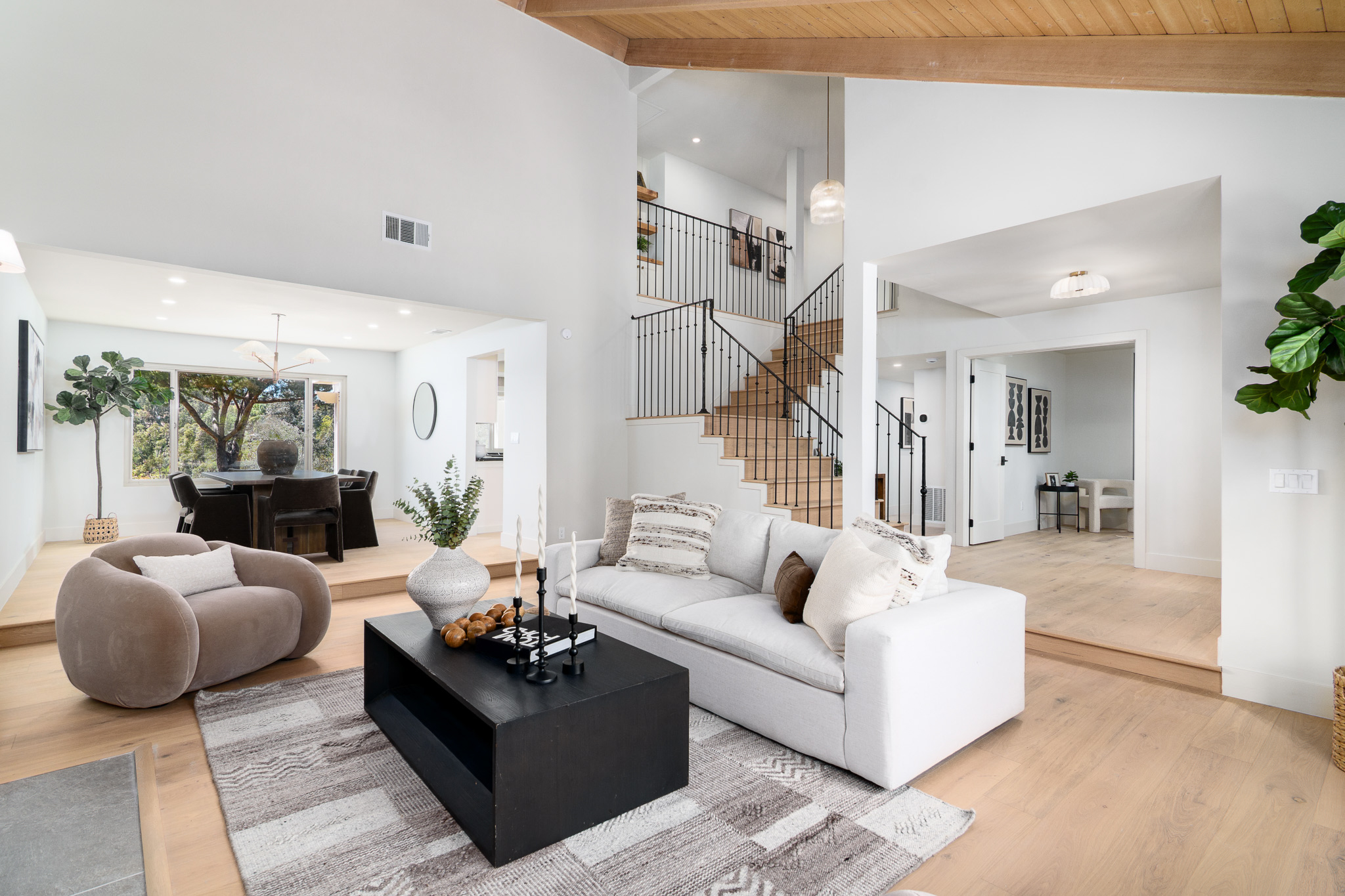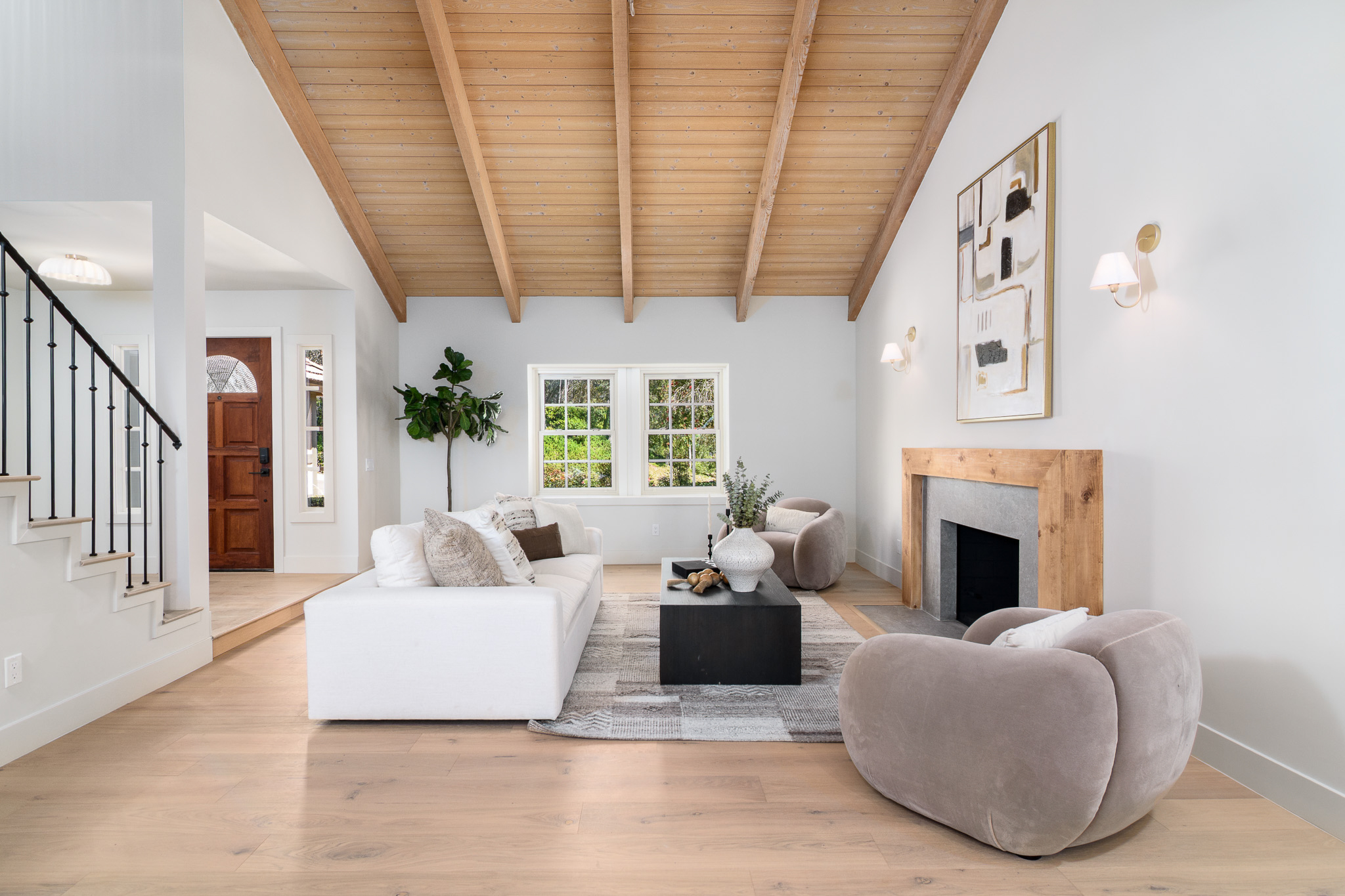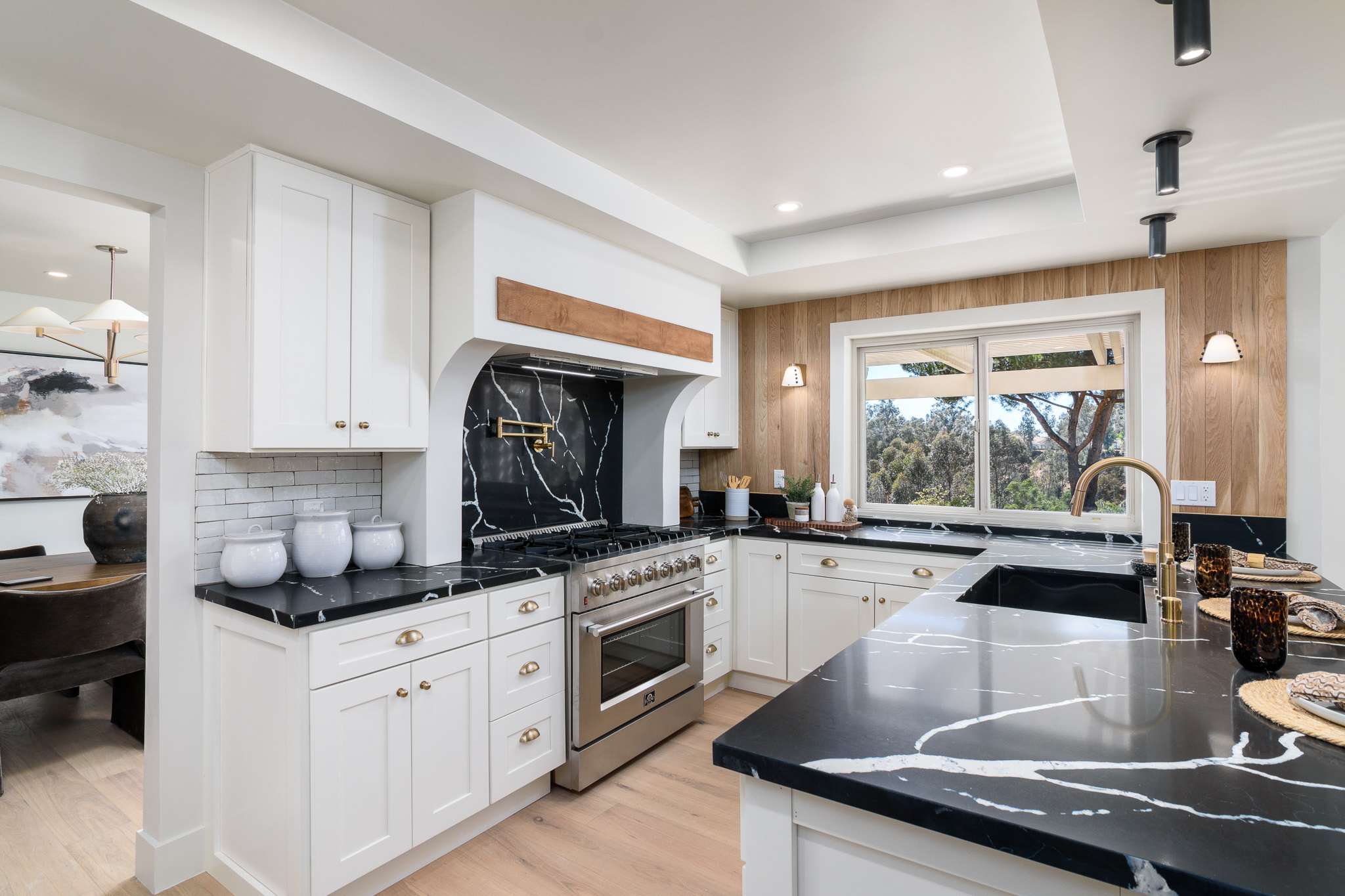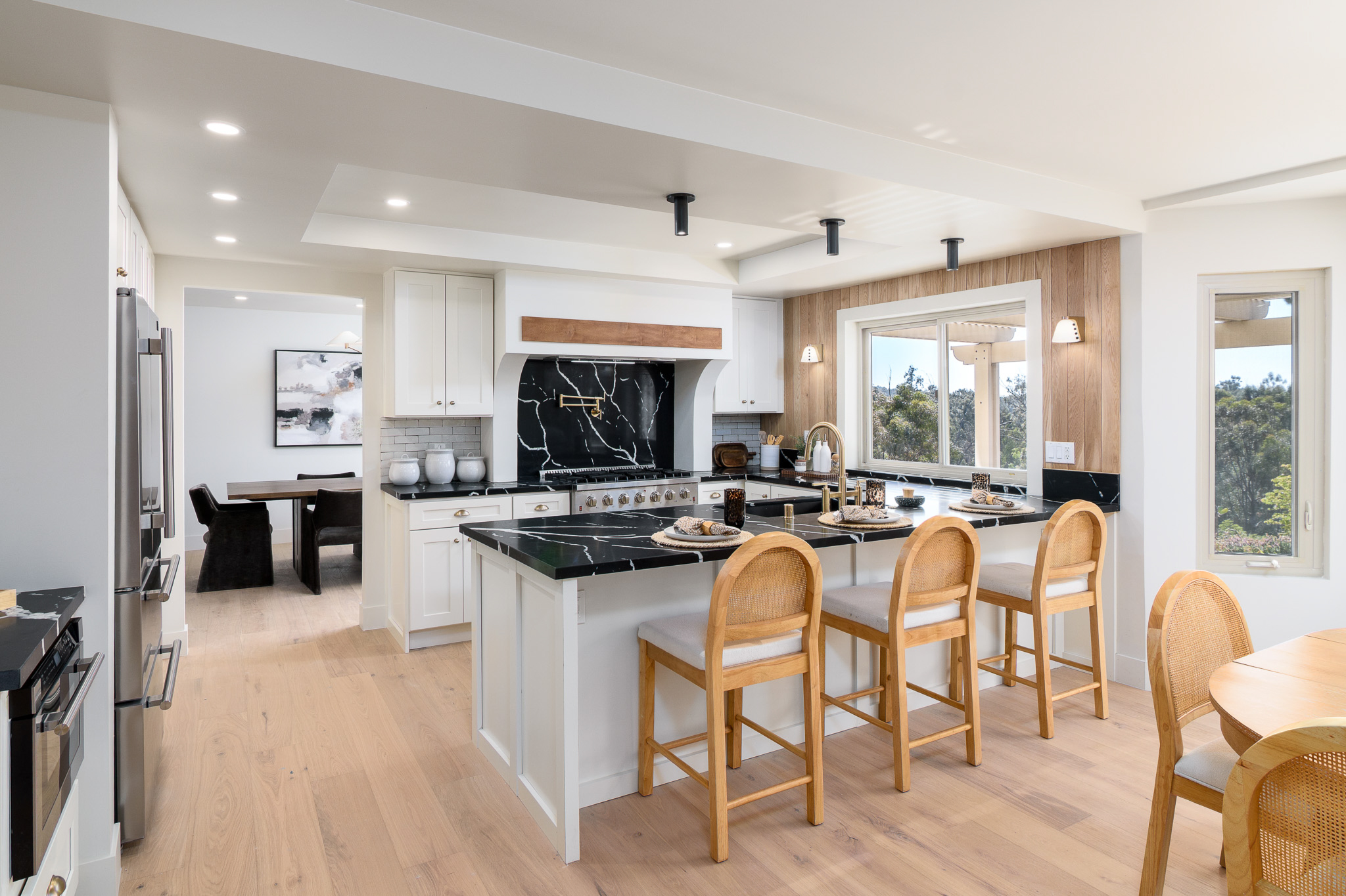 Tucked into a coveted Scripps Ranch corner lot with no neighbors on one side or directly behind, this fully renovated retreat opens to a private nature trail and protected open spacea rare slice of quiet just steps from your door. A grand foyer with iron-railing staircase sets the tone, opening to soaring vaulted wood-beam ceilings, wide-plank engineered hardwood, and a stone fireplace crowned with a striking live-edge wood surround. The chef's kitchen is pure showstopper: dramatic black quartz with bold white veining, crisp white shaker cabinetry, a glinting gold pot filler, an arched stone range hood, and a professional-grade Forno range made for slow Sunday cooking. The adjoining family room invites lingering with a second fireplace, custom white oak built-ins, shiplap accents, and sliders that pull the outdoors in. Upstairs, the primary suite is its own little hideawayvaulted ceilings, a third fireplace, and a spa-inspired bath layered in warm oak, honed stone, matte black, globe sconces, a freestanding soaking tub, and a fluted-tile walk-in shower. A deep-blue glossy tile hall bath with walnut vanity and brass pulls adds a jewel-box moment, while a checkered marble laundry room with gold faucet brings charm to the everyday. A main-level bedroom doubles as study or guest retreat. Outside, mature trees, towering palms, and a pergola-shaded patio create a botanical escape. Owned Tesla solar with Powerwall and a three-car garage with epoxy round it all out.