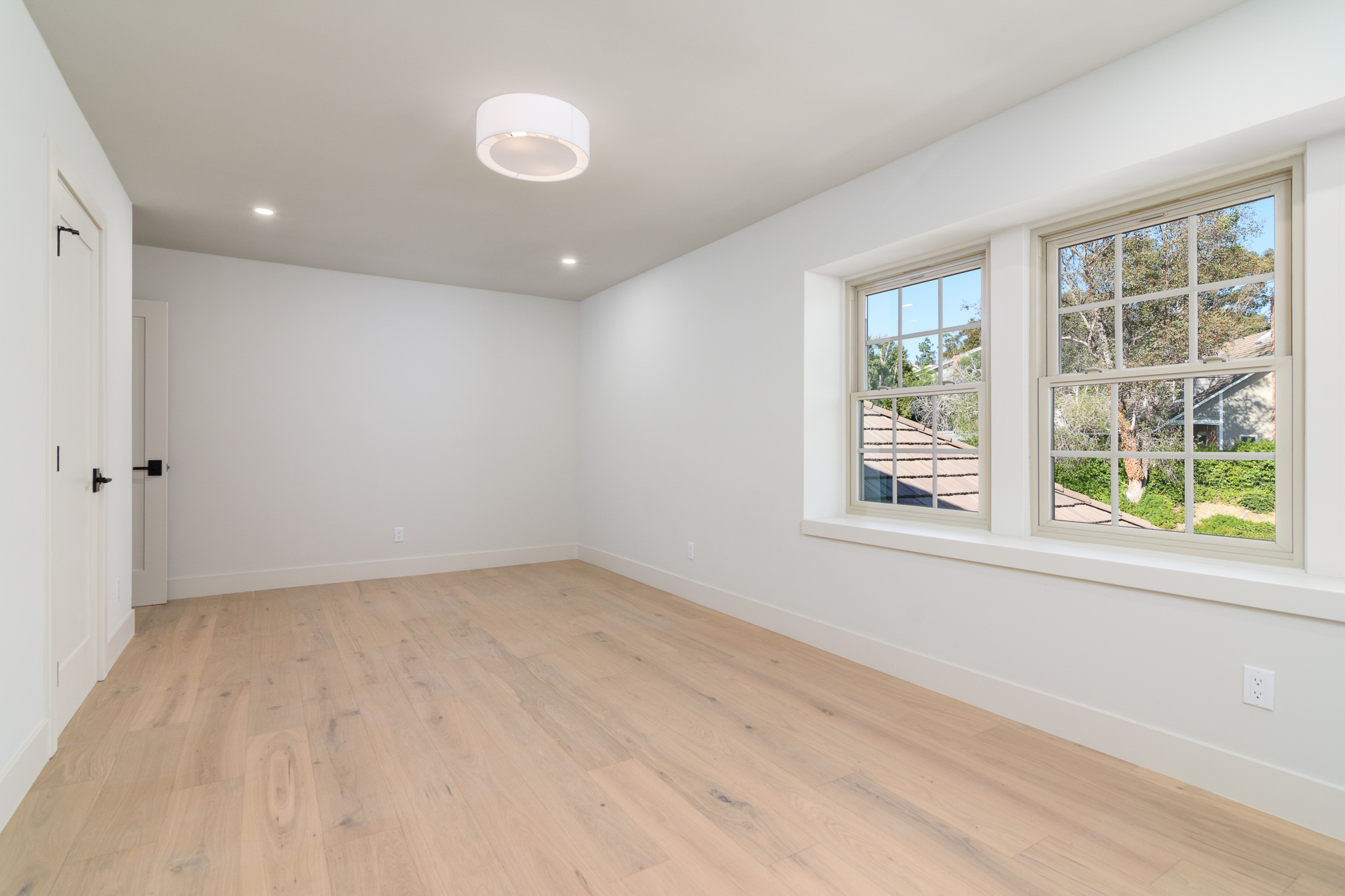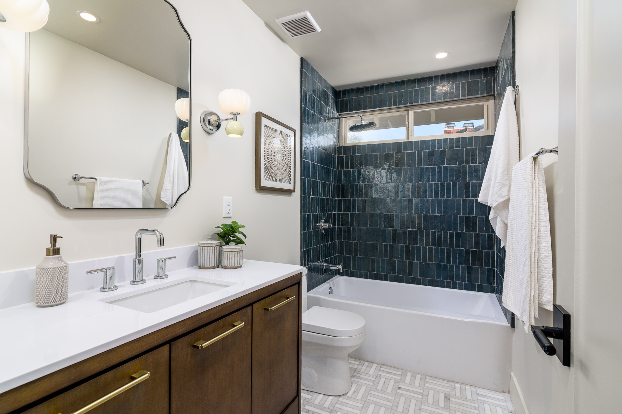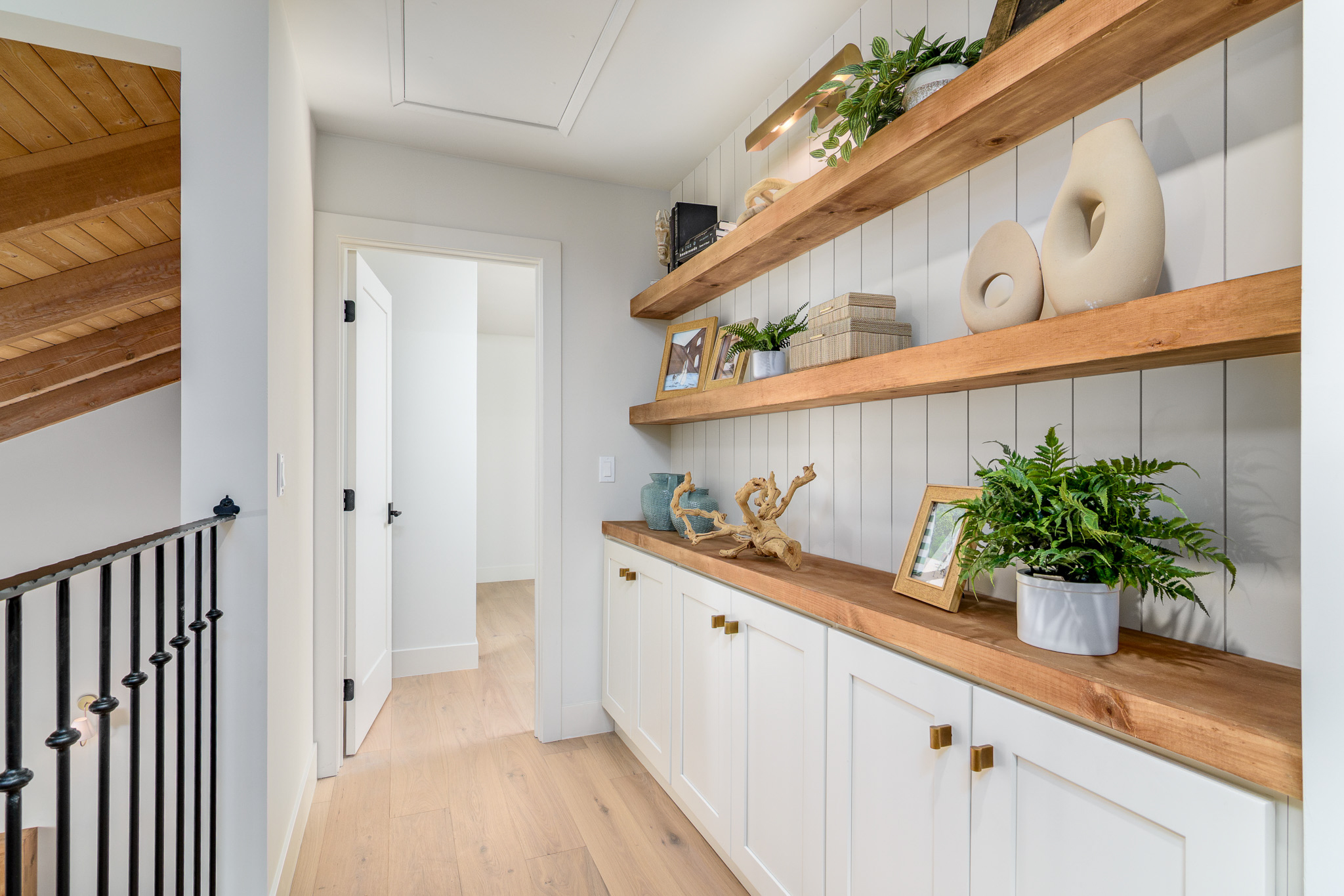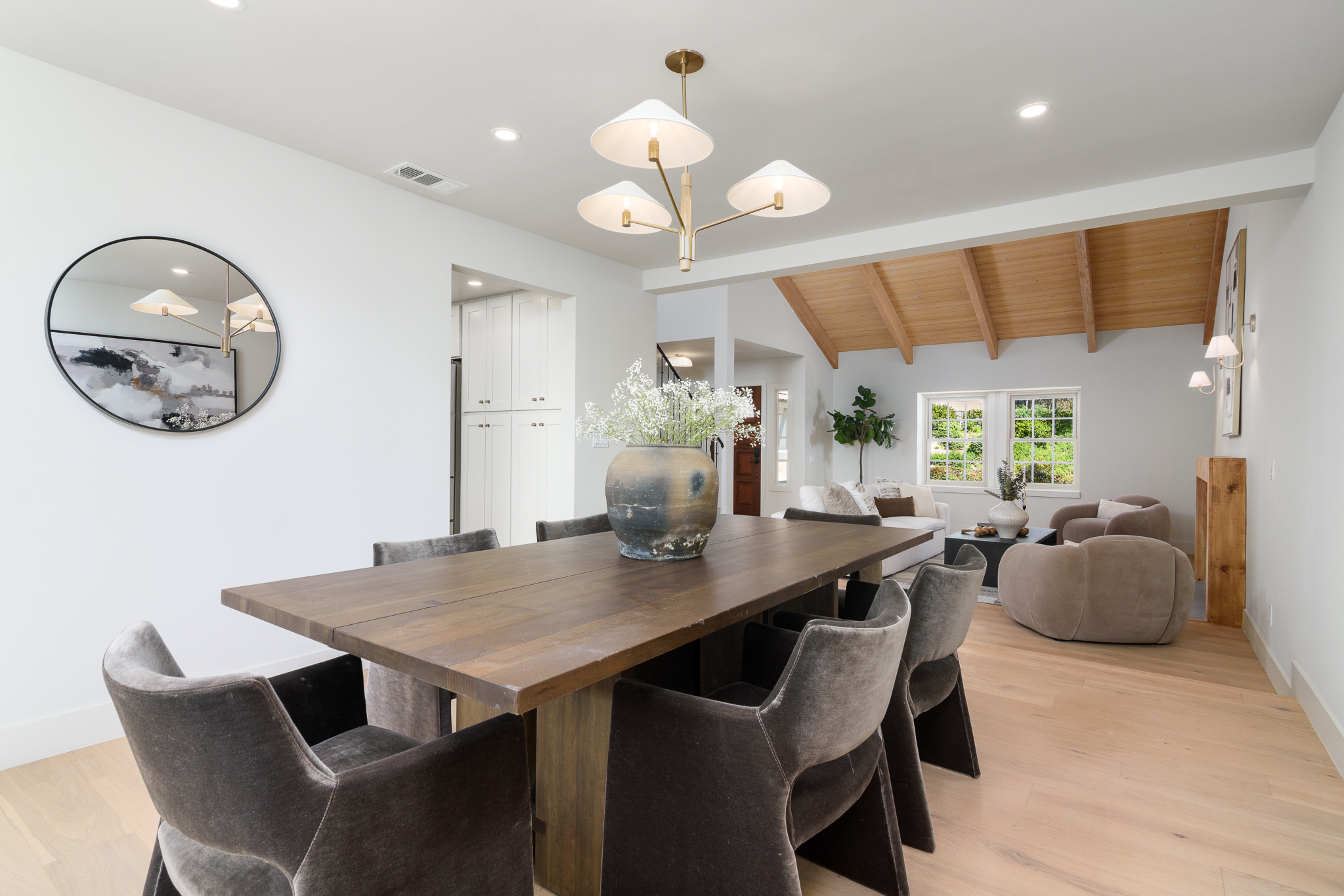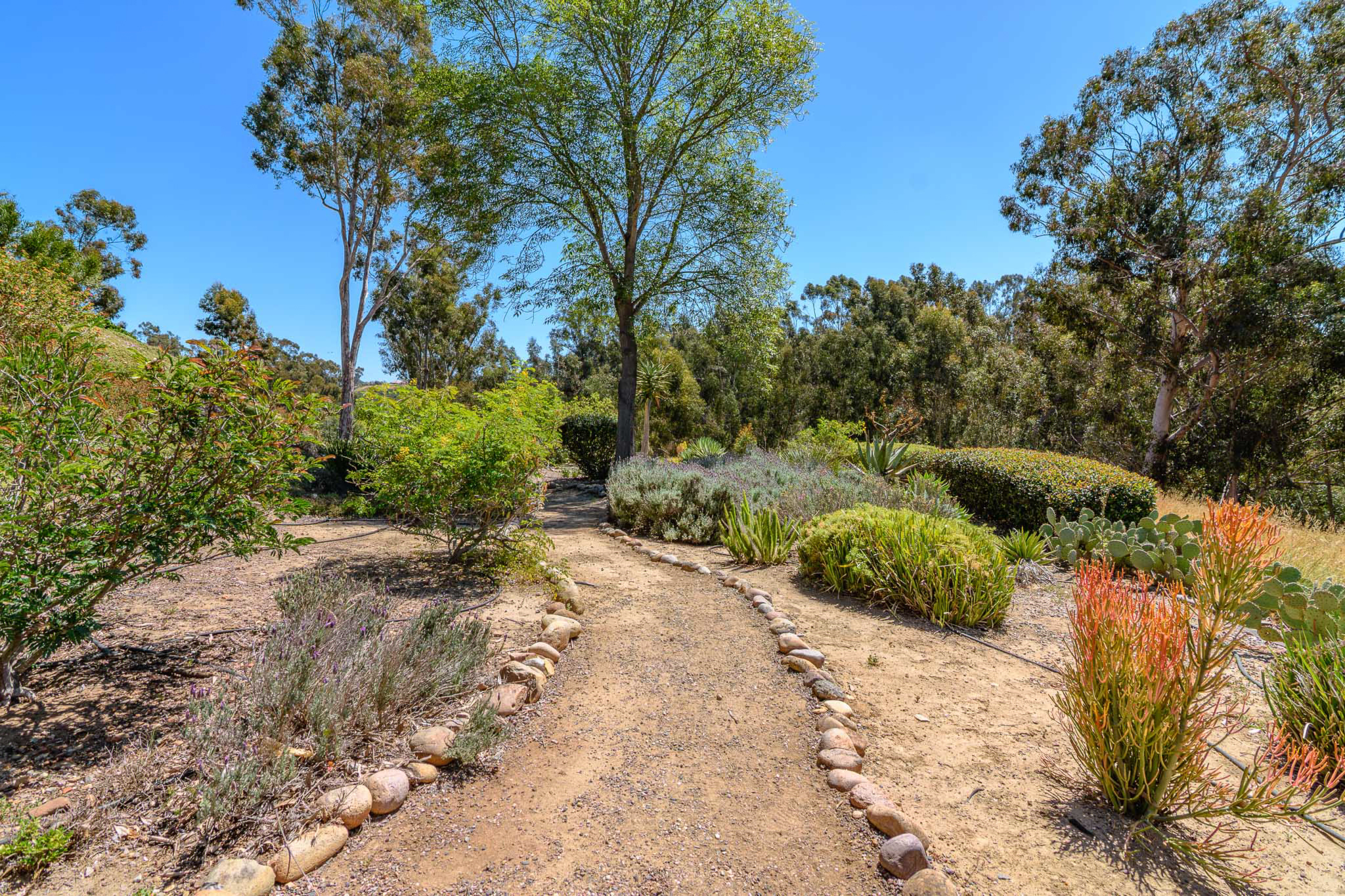 Tucked into a coveted Scripps Ranch corner lot with no neighbors on one side or directly behind, this fully renovated retreat opens to a private nature trail and protected open spacea rare slice of quiet just steps from your door. A grand foyer with iron-railing staircase sets the tone, opening to soaring vaulted wood-beam ceilings, wide-plank engineered hardwood, and a stone fireplace crowned with a striking live-edge wood surround. The chef's kitchen is pure showstopper: dramatic black quartz with bold white veining, crisp white shaker cabinetry, a glinting gold pot filler, an arched stone range hood, and a professional-grade Forno range made for slow Sunday cooking. The adjoining family room invites lingering with a second fireplace, custom white oak built-ins, shiplap accents, and sliders that pull the outdoors in. Upstairs, the primary suite is its own little hideawayvaulted ceilings, a third fireplace, and a spa-inspired bath layered in warm oak, honed stone, matte black, globe sconces, a freestanding soaking tub, and a fluted-tile walk-in shower. A deep-blue glossy tile hall bath with walnut vanity and brass pulls adds a jewel-box moment, while a checkered marble laundry room with gold faucet brings charm to the everyday. A main-level bedroom doubles as study or guest retreat. Outside, mature trees, towering palms, and a pergola-shaded patio create a botanical escape. Owned Tesla solar with Powerwall and a three-car garage with epoxy round it all out.