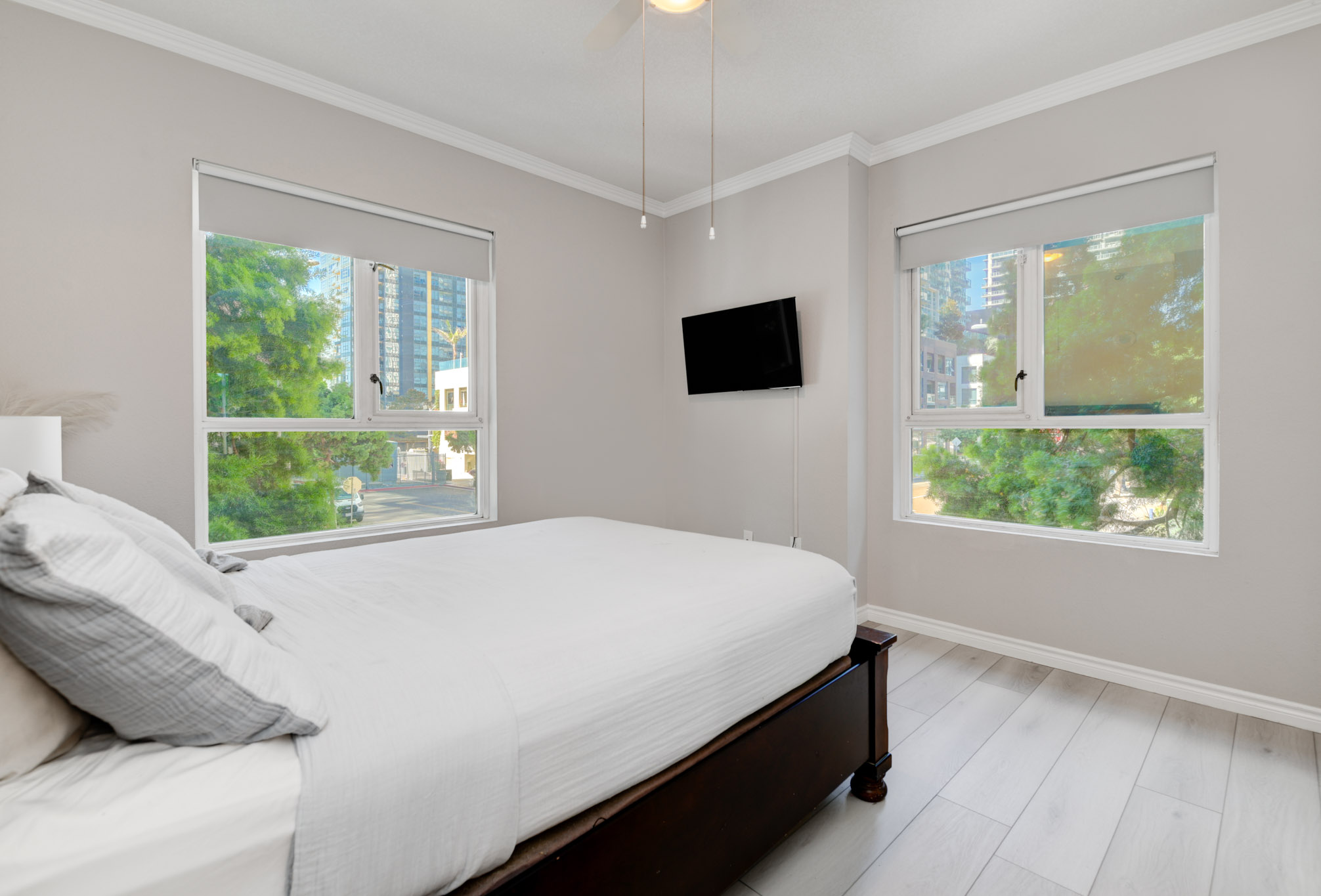 Discover this truly rare corner townhome unit in the sought-after Treo community! This private and rarely available corner unit offers convenience, privacy, and charm. With only one shared neighbor and extra windows throughout, this unit lives like a detached residence. Enjoy the ease of private walk-up access through your own street-level gated patio — perfect for pet owners and guests! Inside, soaring ceilings welcome you into a thoughtfully designed open floorplan. The main level features a modern kitchen with updated cabinetry, new stainless-steel appliances, fresh paint, stylish light fixtures, and a spacious island that flows into a dedicated dining area and private patio. The living room is warm and inviting with a cozy gas fireplace, there's a convenient half bath and plus ample under-staircase storage. Upstairs, you'll find two generously sized bedrooms with ceiling fans and each has its own en-suite bathroom, plus an in-unit stacked washer/dryer. The home includes one assigned parking space and a private storage unit, with easy access to rent a second parking space if needed. Treo residents enjoy an array of amenities including a pool, spa, fitness center, clubhouse, BBQ areas, and lushly landscaped courtyards. The community is pet-friendly with low HOA dues and an unbeatable walkable location. Located in the Columbia District, you’re just moments from the Trolley, Santa Fe Train Station, Seaport Village, Waterfront Park, and just steps from the vibrant neighborhood of Little Italy.