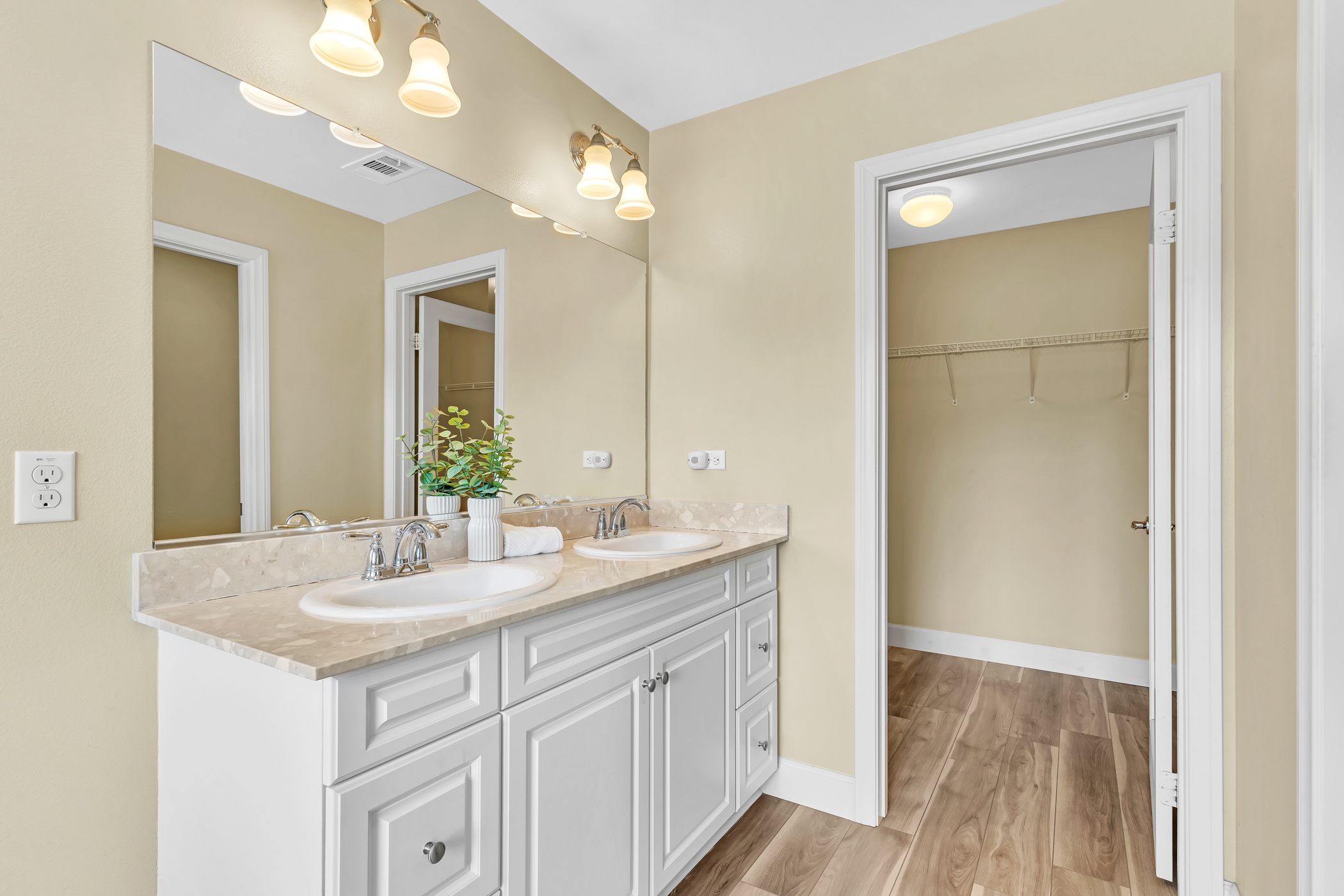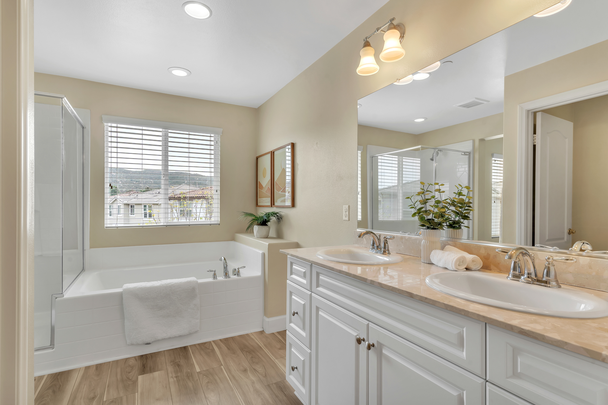 Beautiful, immaculate, and upgraded 4BD/2.5BA energy-efficient townhome/duplex located in Boulder Point community. Features the LARGEST available floor plan with a 2-car attached garage, views of mountains from second floor, dual-pane Low-E windows, tankless water heater, and dual thermostats. Interior highlights include custom granite countertops with glass mosaic backsplash, raised panel white cabinetry and doors, stainless steel appliances, new downstairs flooring, white faux blinds, and recessed lighting throughout.
