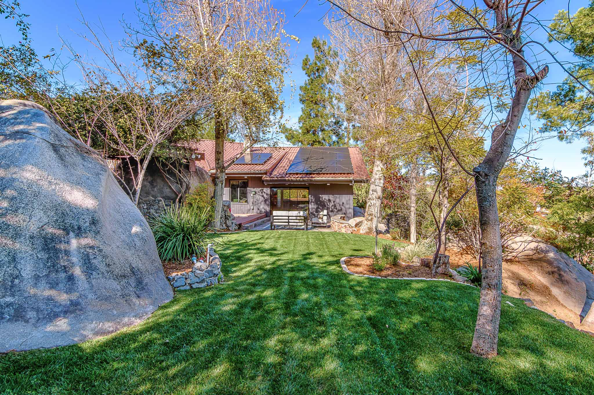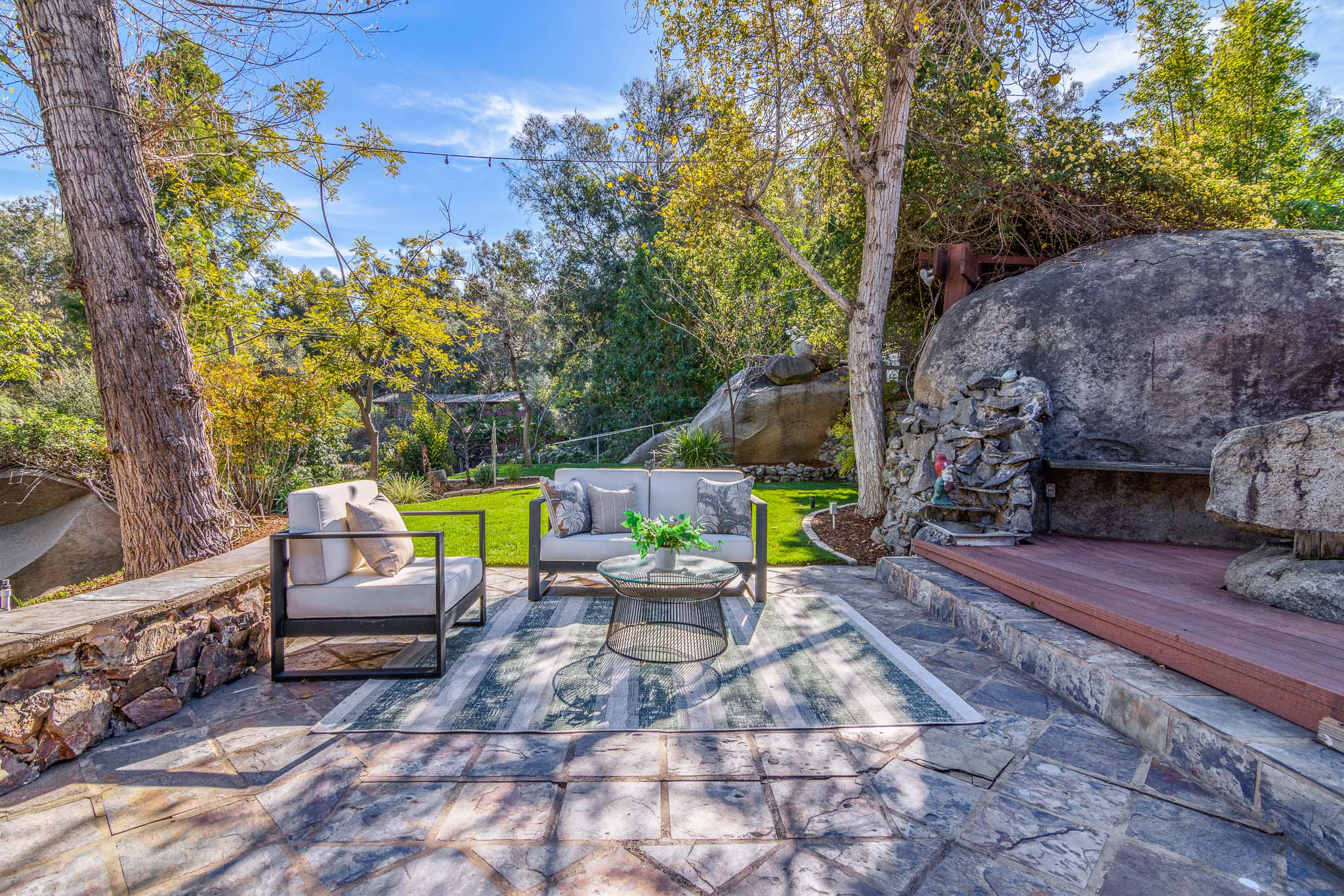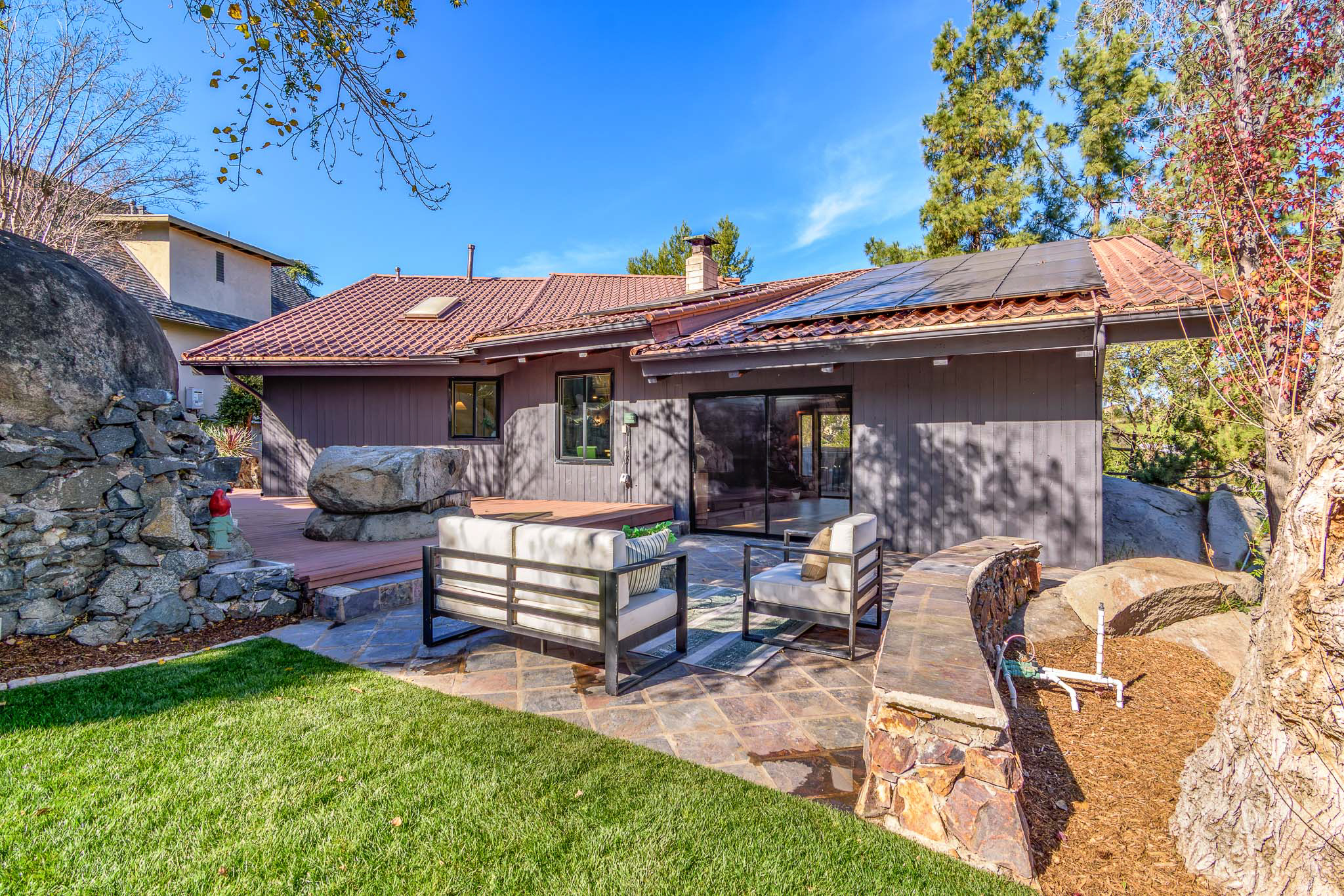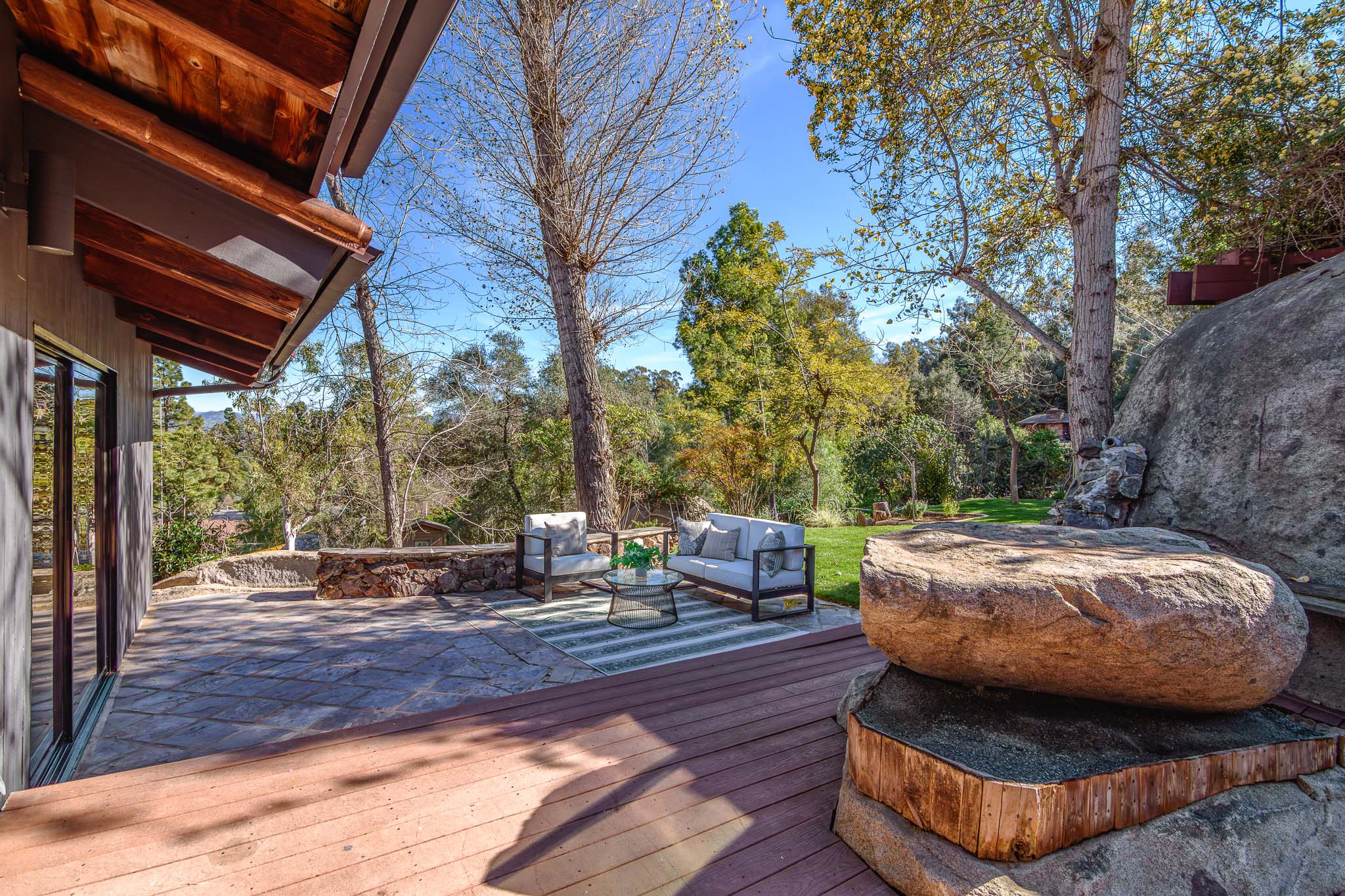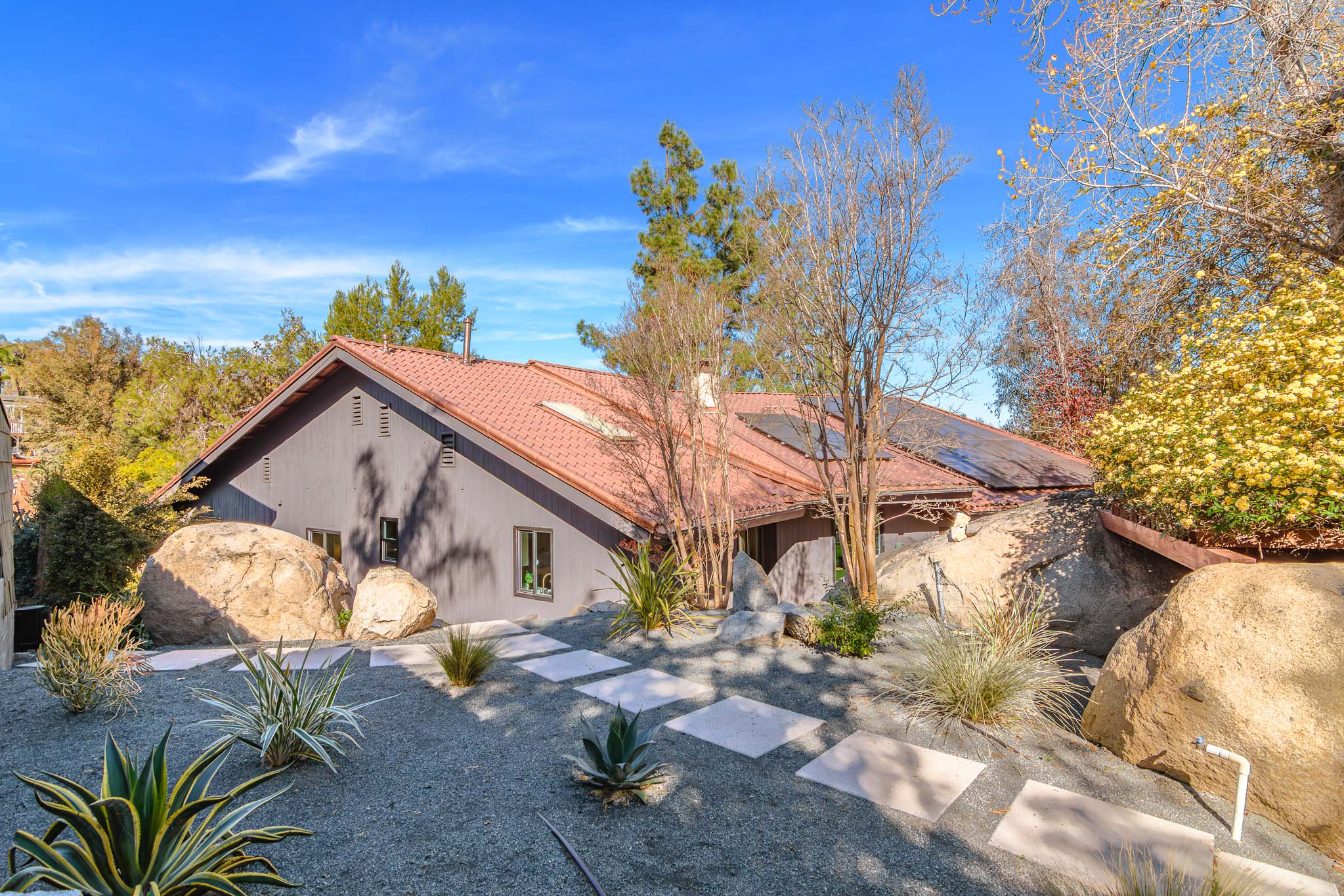 Set among massive granite boulders and mature pines, this thoughtfully renovated residence offers a rare blend of architectural character and modern comfort. Designed for buyers seeking privacy and individuality, the home feels like a mid-century–inspired retreat that lives in harmony with its natural surroundings. Through the double-door entry, you’re welcomed into a light-filled interior defined by vaulted ceilings, exposed wood beams, and a striking split-level layout. The sunken living room centers around a dramatic floor-to-ceiling stone fireplace, creating a warm focal point for the space. Expansive glass sliders open to a wraparound deck, drawing in natural light and showcasing the surrounding rock formations and greenery. The kitchen has been completely reimagined with white shaker cabinetry, quartz countertops, and a contrasting white oak island with bar seating—designed to be both functional and visually refined. Stainless steel appliances, bronze hardware, and a walk-in pantry complete the space. The adjacent dining area overlooks the living room below, offering an ideal setup for entertaining while maintaining an open, connected feel. Downstairs, an additional living area provides flexible space for guests, a media room, or multi-generational living. Tucked just beyond is a bonus room—ideal for a home office, creative studio, or retreat—where a natural granite boulder is seamlessly integrated into the architecture, a striking reminder that the home was designed around the landscape rather than against it. The primary bedroom is a peaceful escape with vaulted ceilings and distinctive architectural windows that frame the outdoors. Outside, the property is naturally landscaped with towering rock formations and mature trees, offering privacy, beauty, and a sense of connection to nature that’s truly hard to replicate. Paid-off solar adds long-term energy efficiency and reduced utility costs, complementing the home’s thoughtful design and connection to its environment. Nestled in the scenic hills of El Cajon, the home offers a serene, rural atmosphere while remaining just minutes from local dining, shopping, and convenient freeway access. A rare opportunity to own a truly one-of-a-kind home—schedule your private showing today.