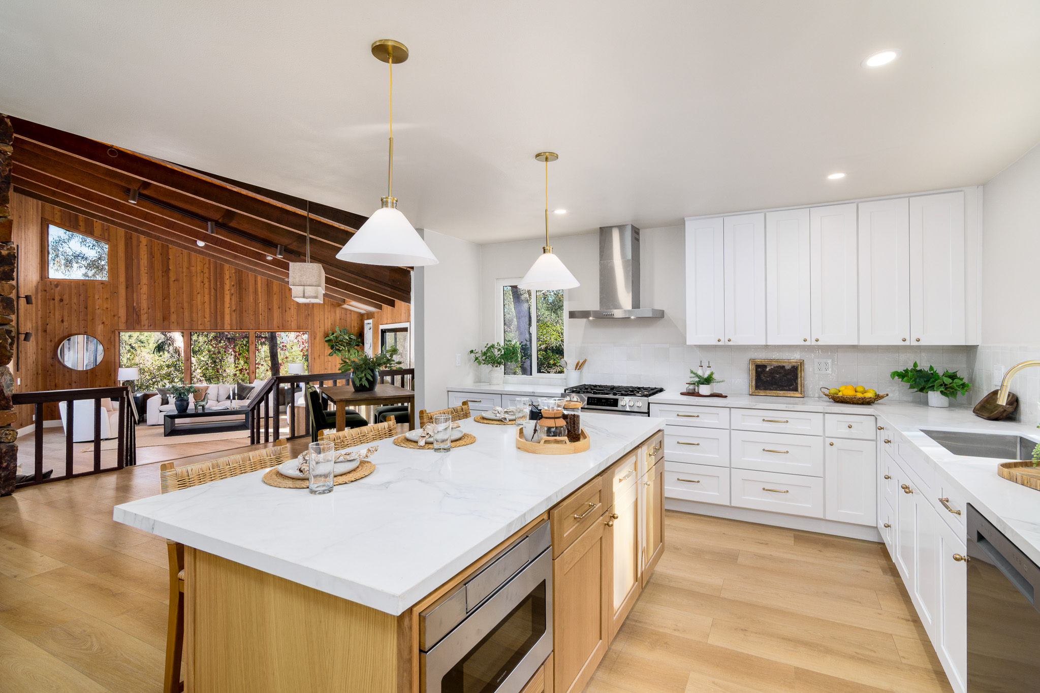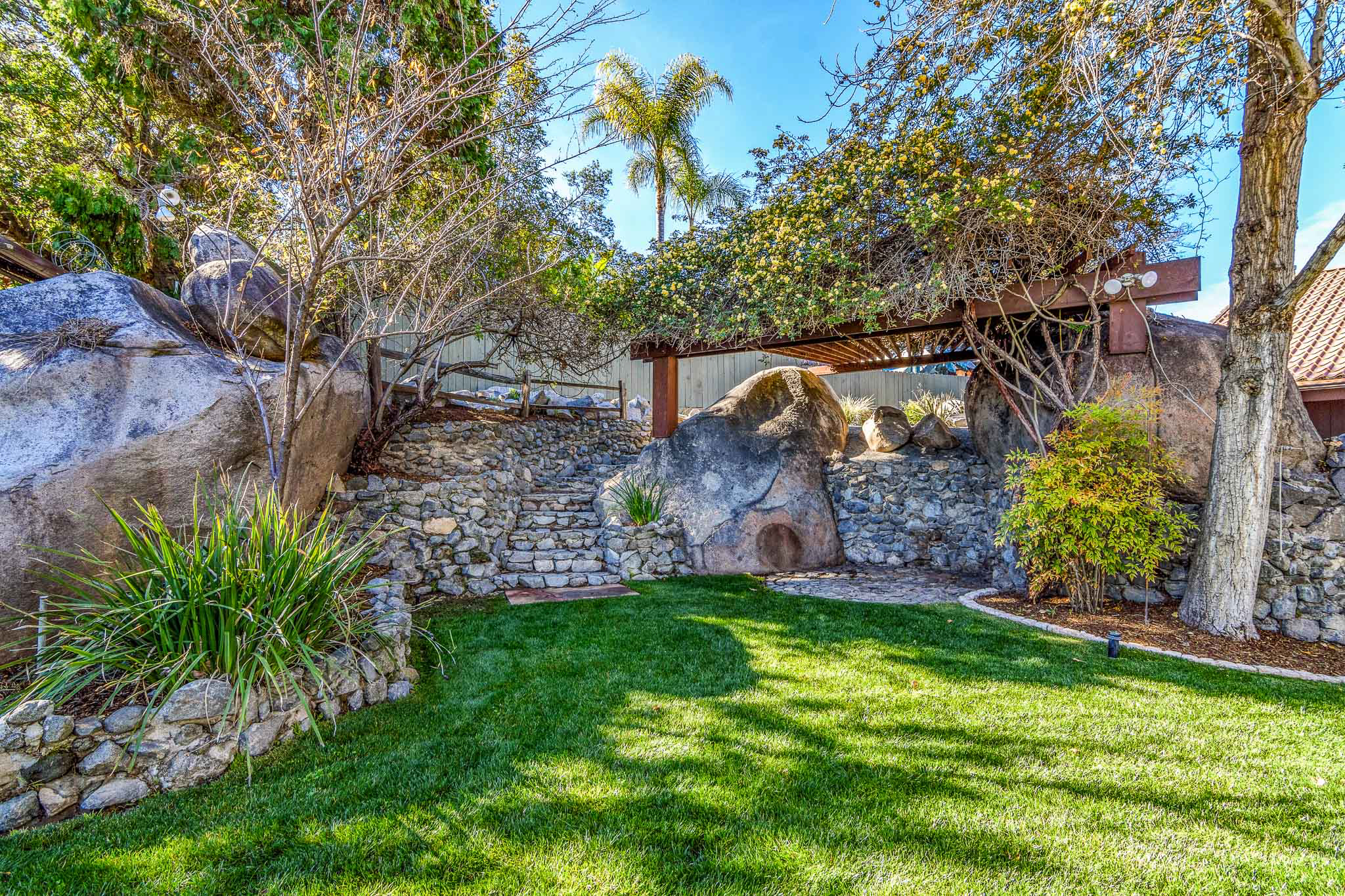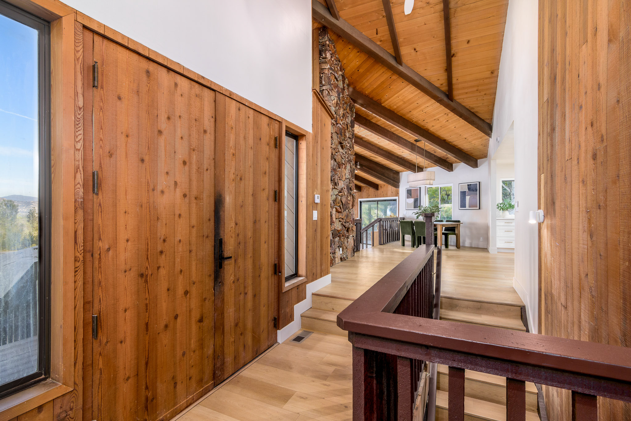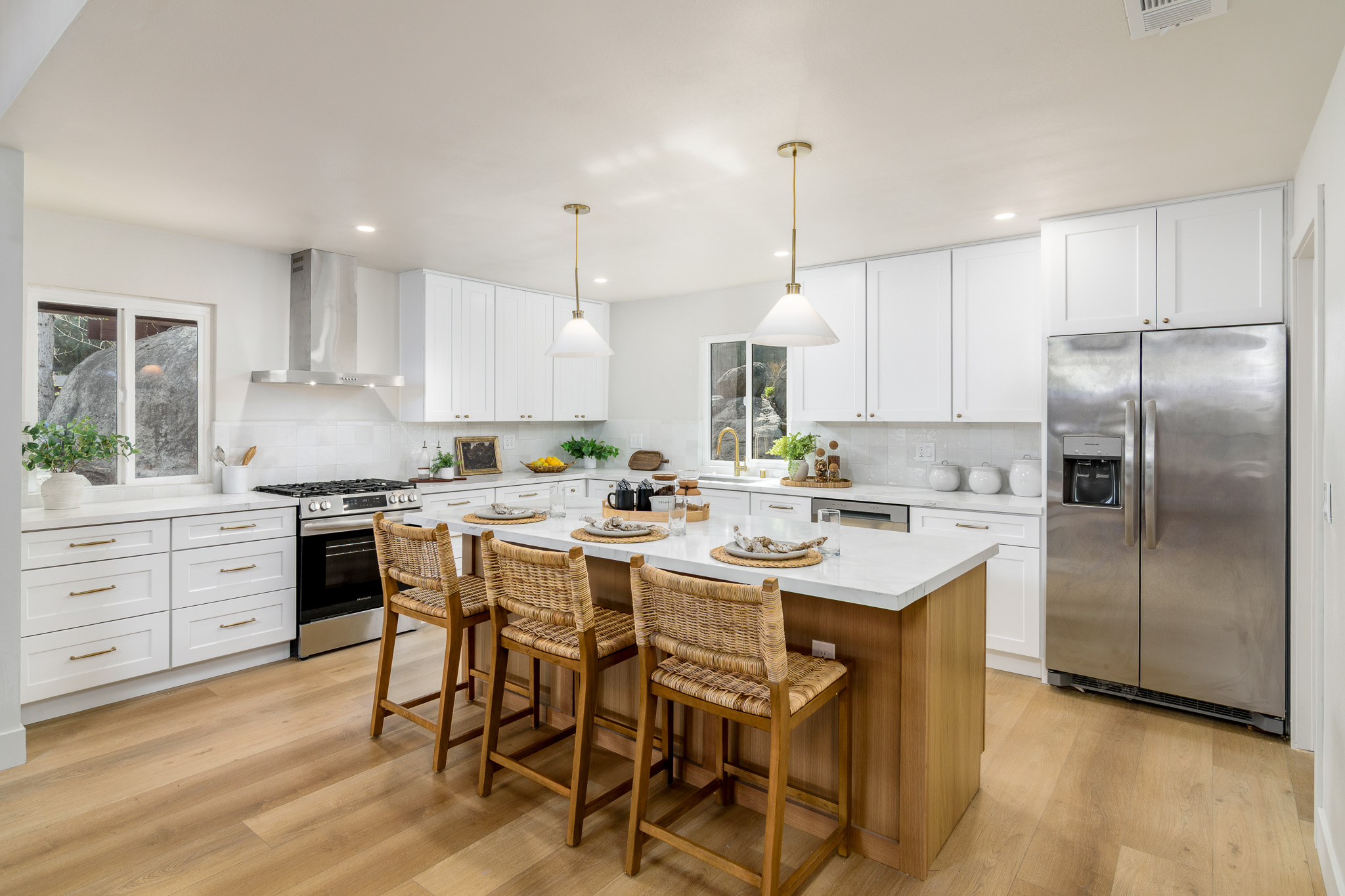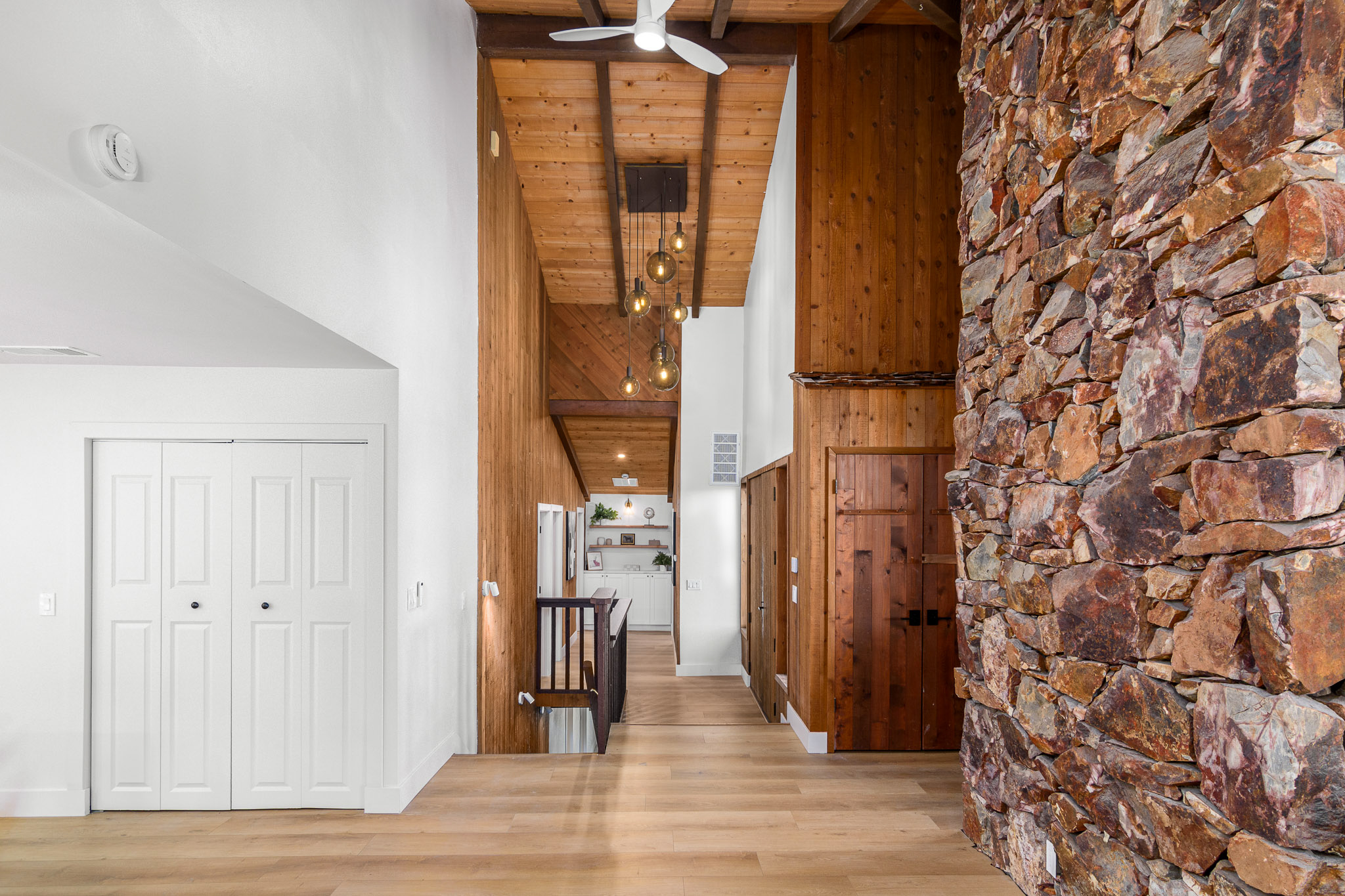 Set among massive granite boulders and mature pines, this thoughtfully renovated residence offers a rare blend of architectural character and modern comfort. Designed for buyers seeking privacy and individuality, the home feels like a mid-century–inspired retreat that lives in harmony with its natural surroundings. Through the double-door entry, you’re welcomed into a light-filled interior defined by vaulted ceilings, exposed wood beams, and a striking split-level layout. The sunken living room centers around a dramatic floor-to-ceiling stone fireplace, creating a warm focal point for the space. Expansive glass sliders open to a wraparound deck, drawing in natural light and showcasing the surrounding rock formations and greenery. The kitchen has been completely reimagined with white shaker cabinetry, quartz countertops, and a contrasting white oak island with bar seating—designed to be both functional and visually refined. Stainless steel appliances, bronze hardware, and a walk-in pantry complete the space. The adjacent dining area overlooks the living room below, offering an ideal setup for entertaining while maintaining an open, connected feel. Downstairs, an additional living area provides flexible space for guests, a media room, or multi-generational living. Tucked just beyond is a bonus room—ideal for a home office, creative studio, or retreat—where a natural granite boulder is seamlessly integrated into the architecture, a striking reminder that the home was designed around the landscape rather than against it. The primary bedroom is a peaceful escape with vaulted ceilings and distinctive architectural windows that frame the outdoors. Outside, the property is naturally landscaped with towering rock formations and mature trees, offering privacy, beauty, and a sense of connection to nature that’s truly hard to replicate. Paid-off solar adds long-term energy efficiency and reduced utility costs, complementing the home’s thoughtful design and connection to its environment. Nestled in the scenic hills of El Cajon, the home offers a serene, rural atmosphere while remaining just minutes from local dining, shopping, and convenient freeway access. A rare opportunity to own a truly one-of-a-kind home—schedule your private showing today.