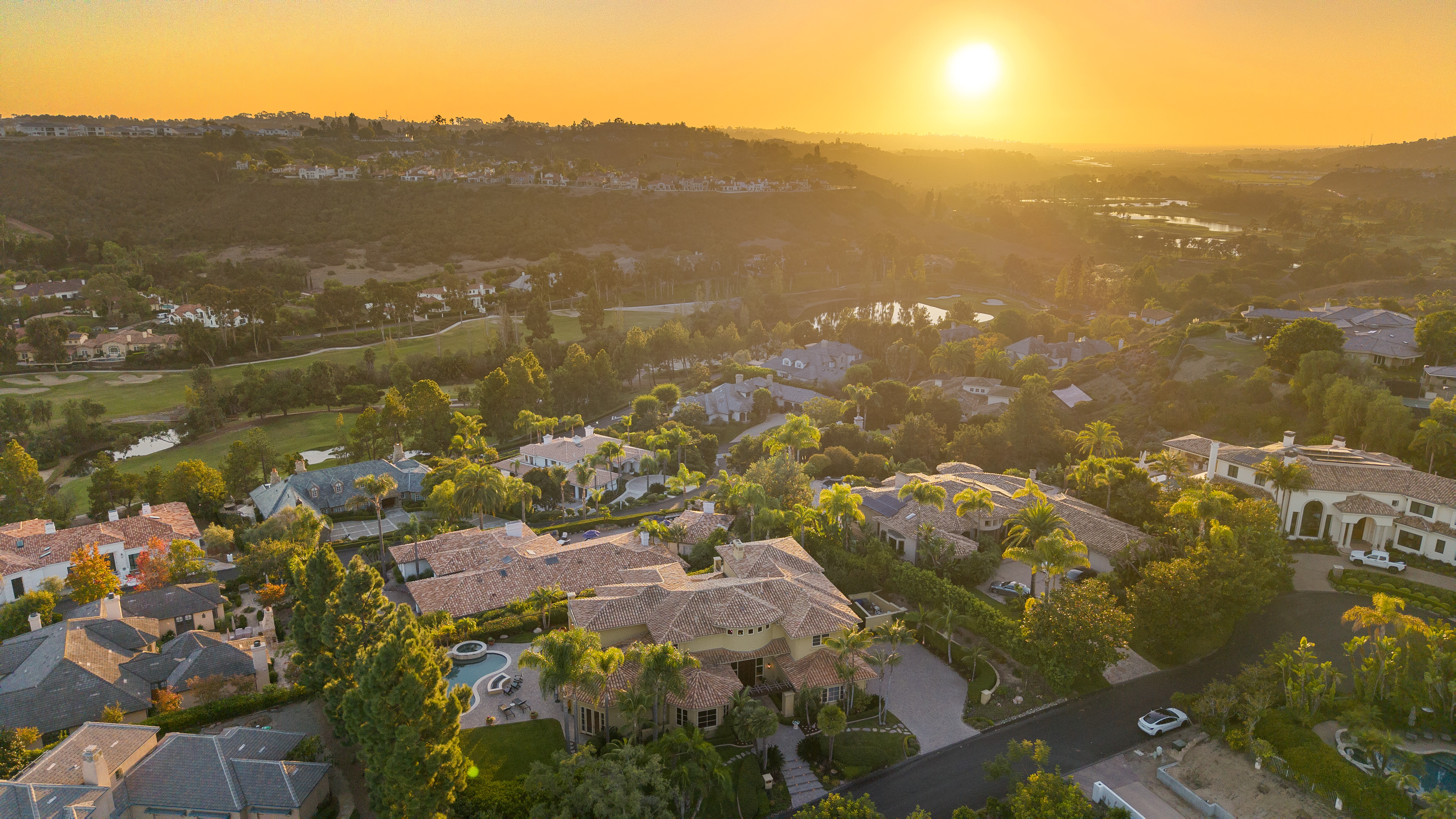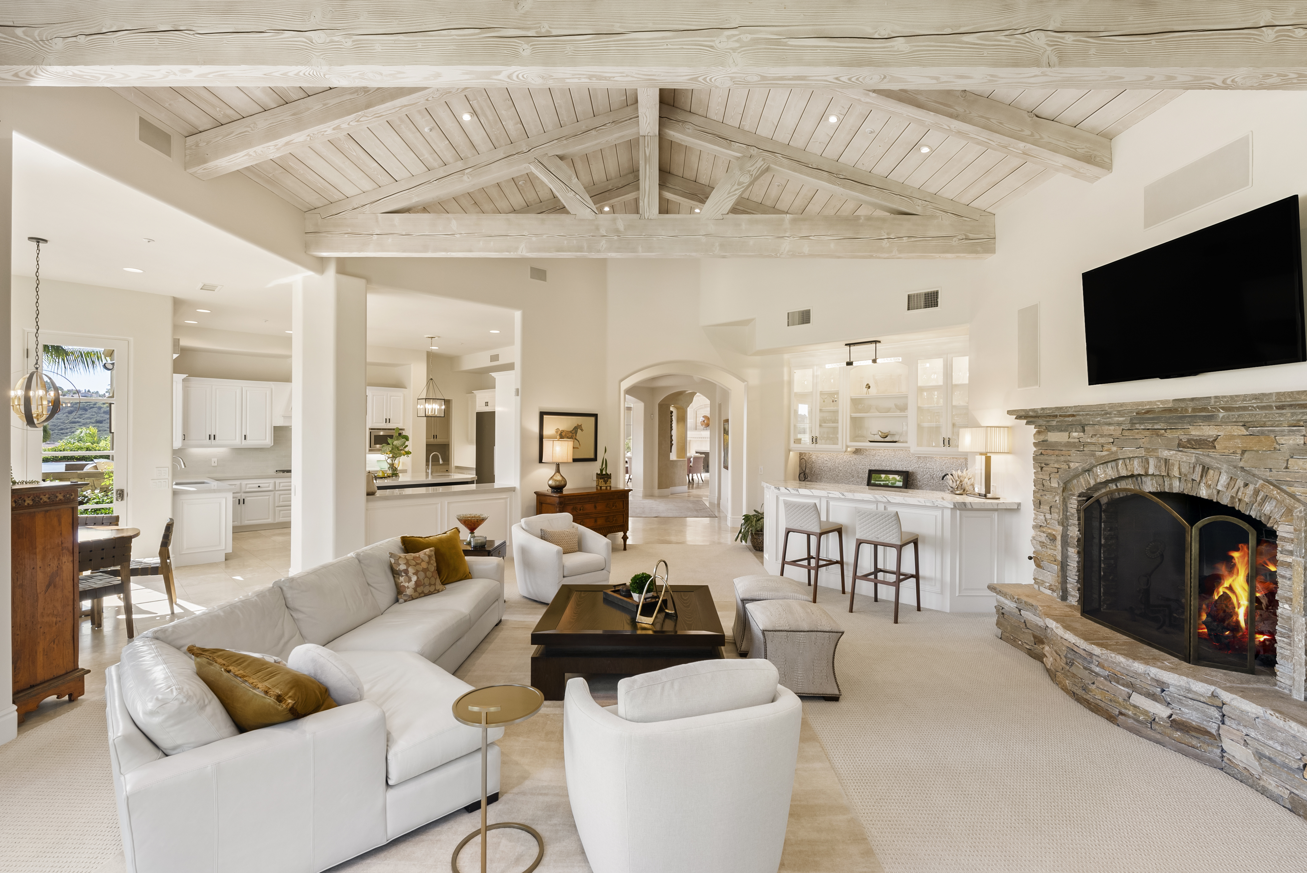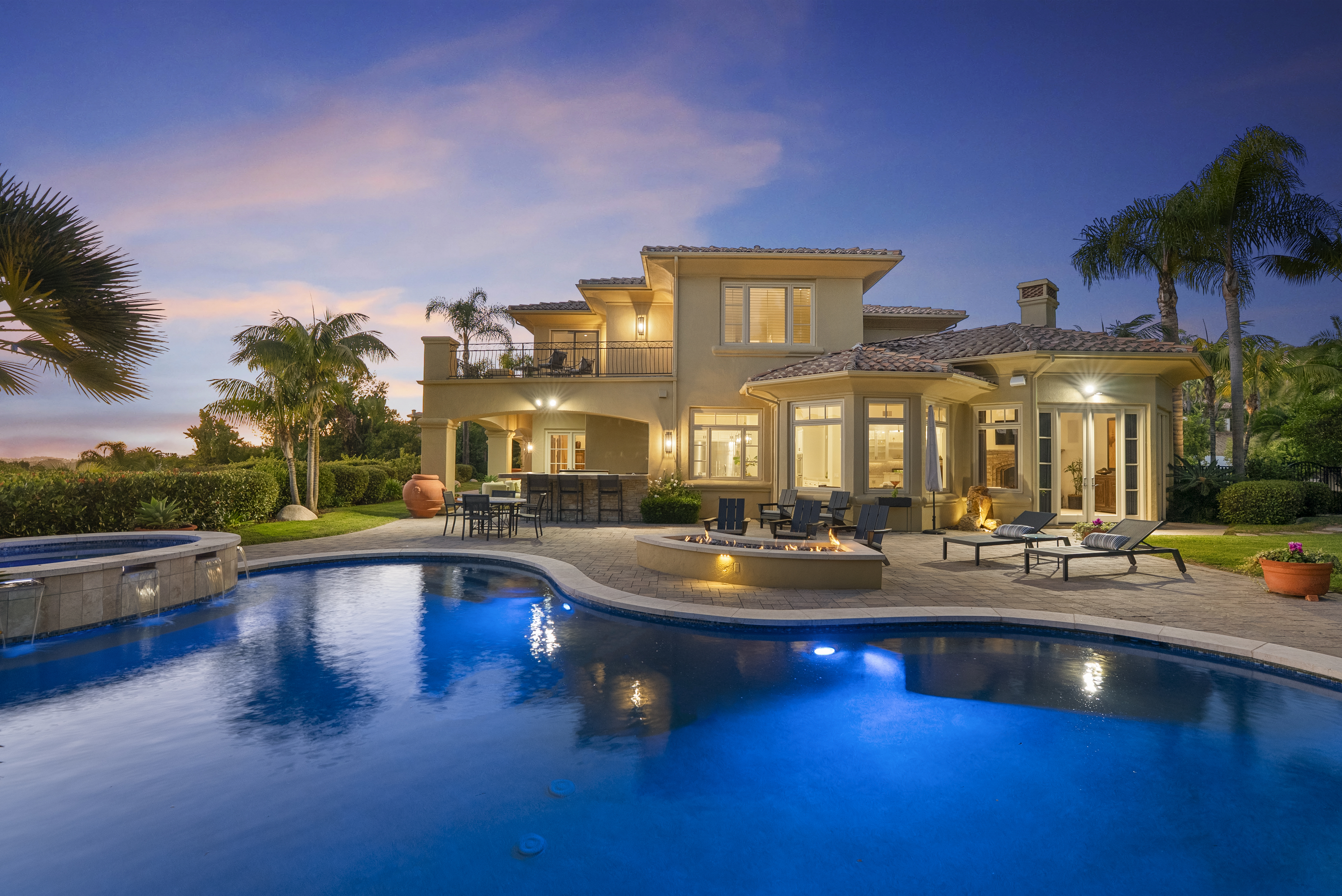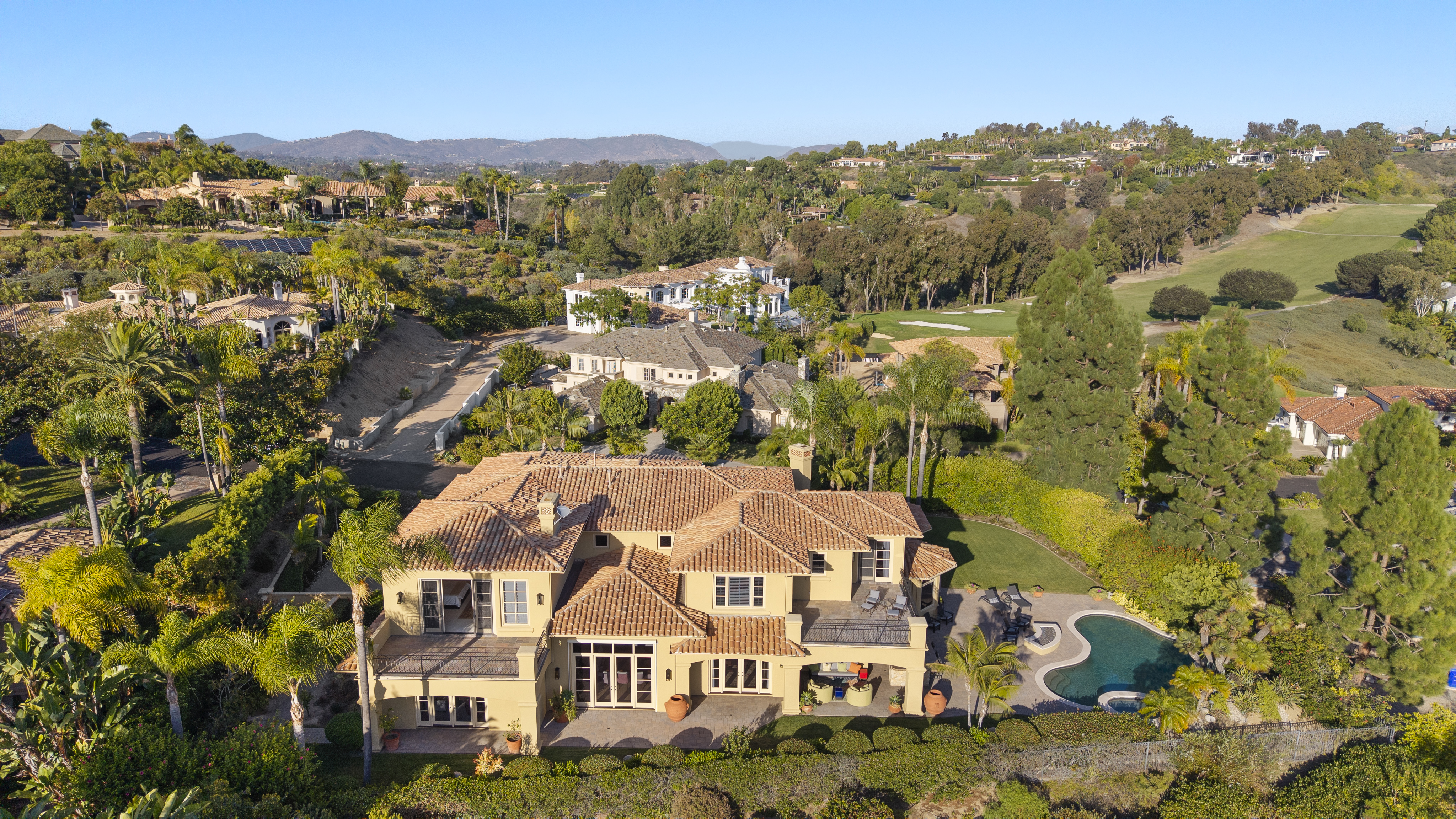 Set within the prestigious, guard-gated Del Mar Country Club, 14480 Bellvista is a refined estate offering timeless elegance, panoramic golf course and ocean views, and an elevated Rancho-coastal aesthetic in the heart of Rancho Santa Fe. Nestled in the scenic San Dieguito River Valley, this expansive 7,376-square-foot residence enjoys a coveted southwest orientation, capturing golden light and unforgettable sunset ocean and fairway vistas. Recently enhanced with thoughtful updates, the home showcases a remodeled chef’s kitchen and a beautifully reimagined family great room, ideal for both grand entertaining and everyday living. Vaulted, beamed ceilings and walls of glass create a light-filled, airy ambiance, while elevated finishes throughout reflect a sophisticated blend of Rancho heritage and coastal refinement. The residence offers five spacious en-suite bedrooms, including a luxurious primary suite complete with a fireplace and private balcony overlooking the golf course. An additional wood-paneled executive office with fireplace provides a distinguished work-from-home retreat. Outdoors, a private pool with fire table sets the stage for resort-style living and evening gatherings beneath the San Diego sky. Residents who choose to become Members of Del Mar Country Club enjoy world-class amenities including championship golf, tennis and pickleball courts, an Olympic sized pool, and an active social calendar, all within a secure, gated enclave. Access to top-rated public and private schools and a premier North County San Diego location!