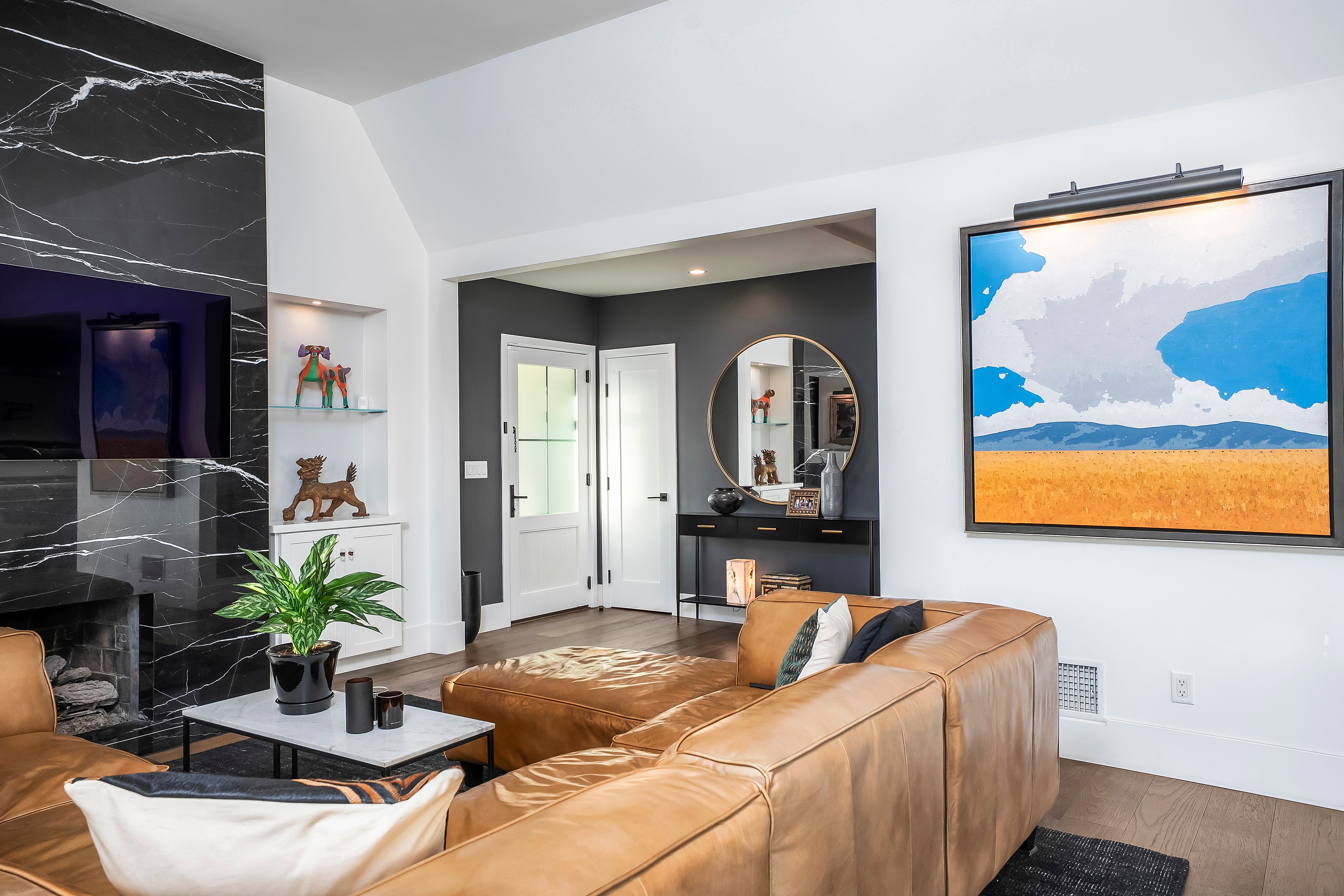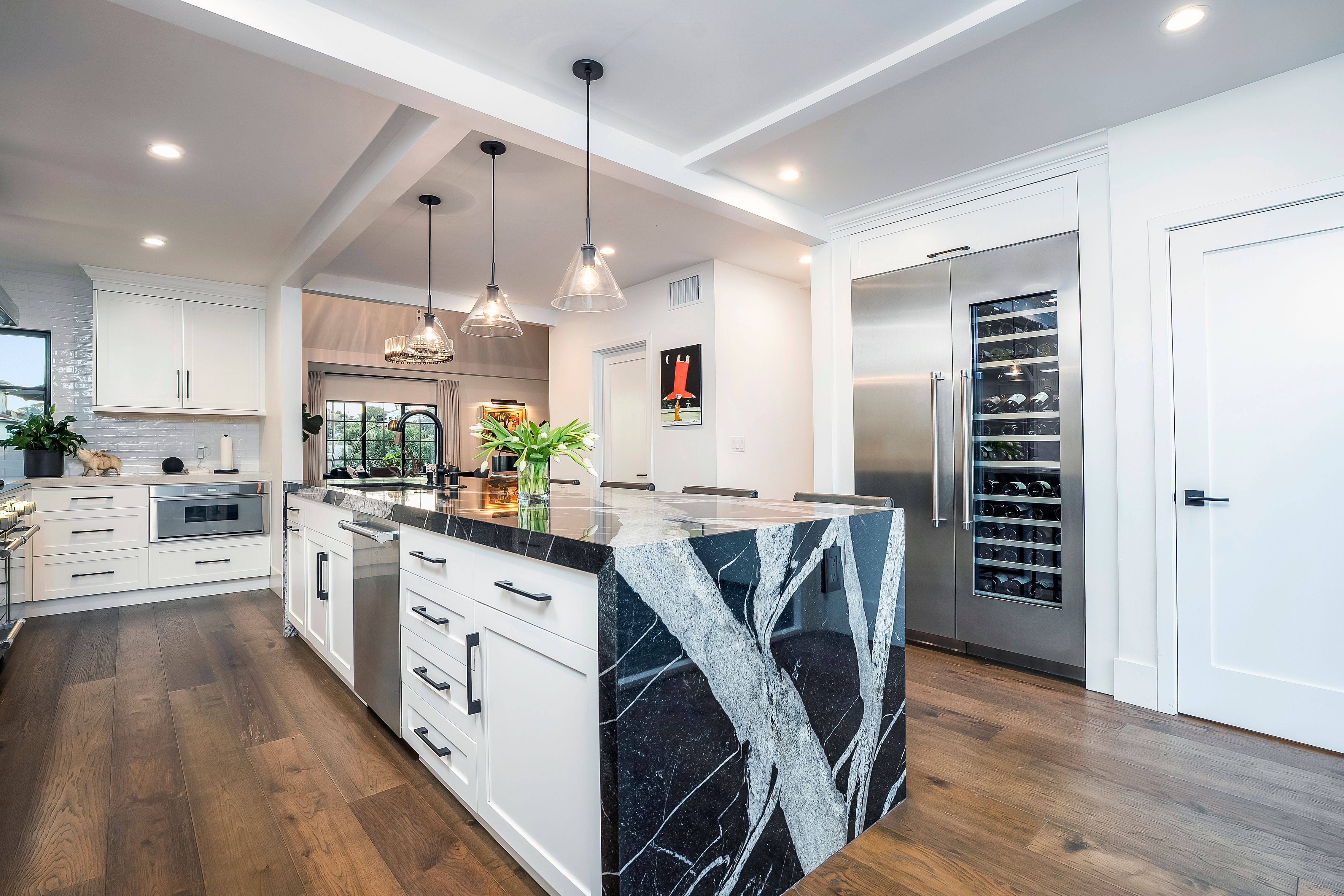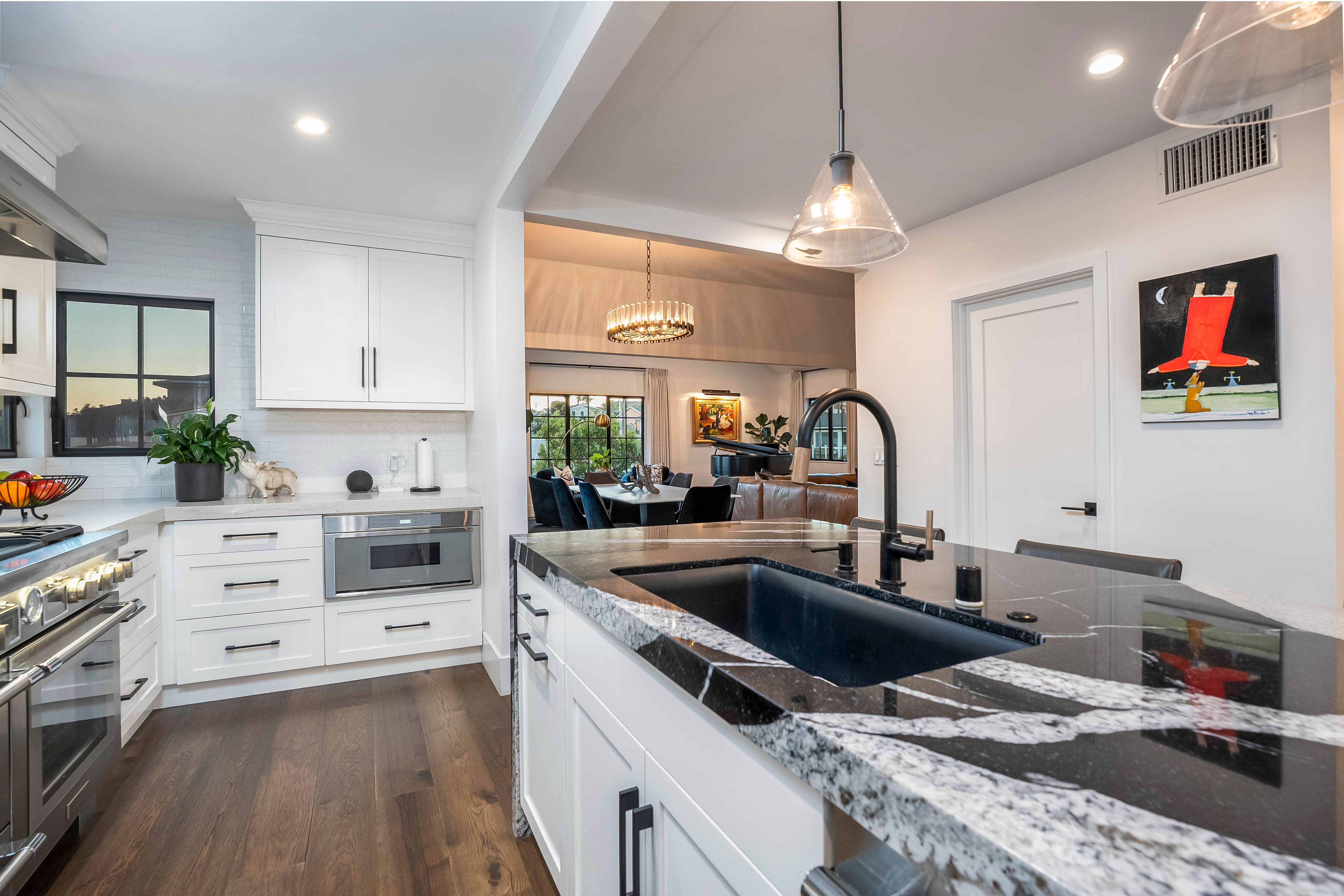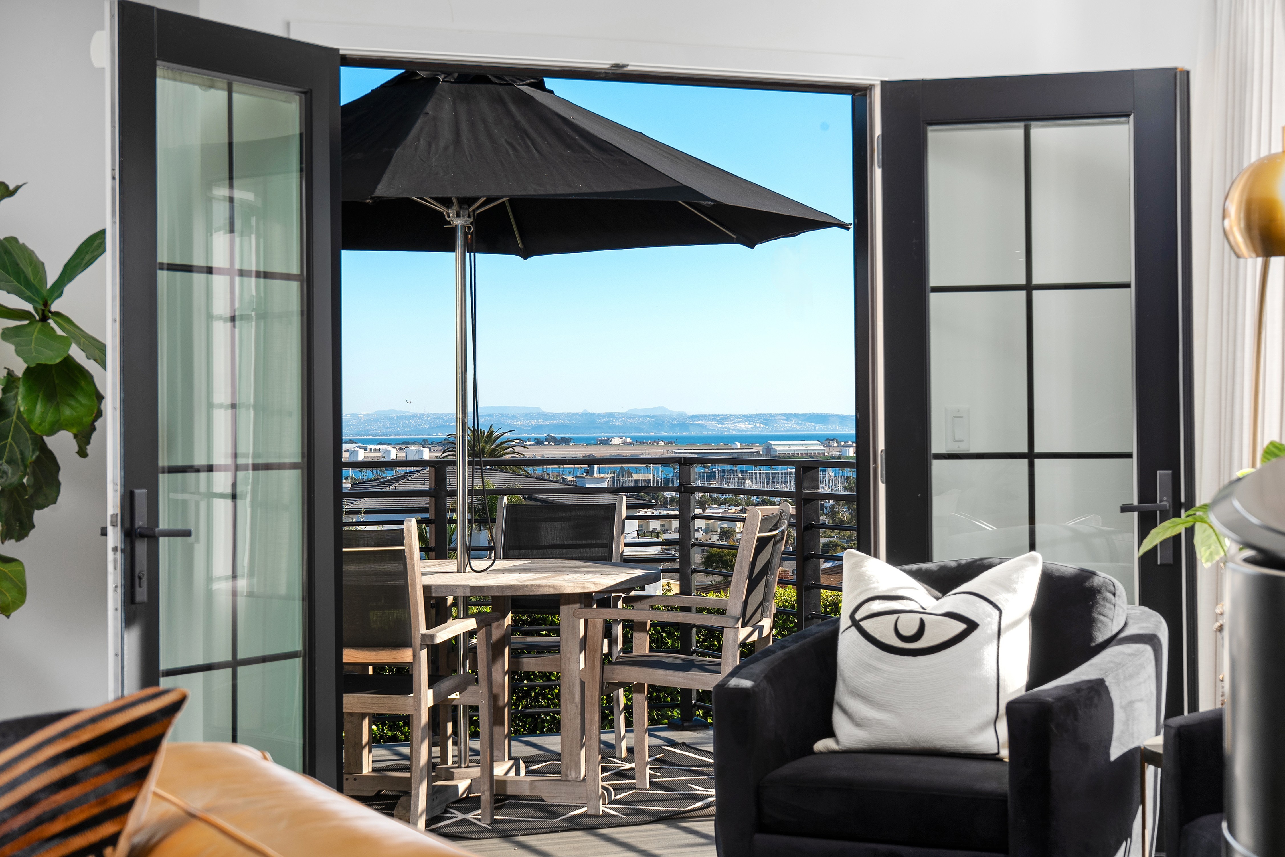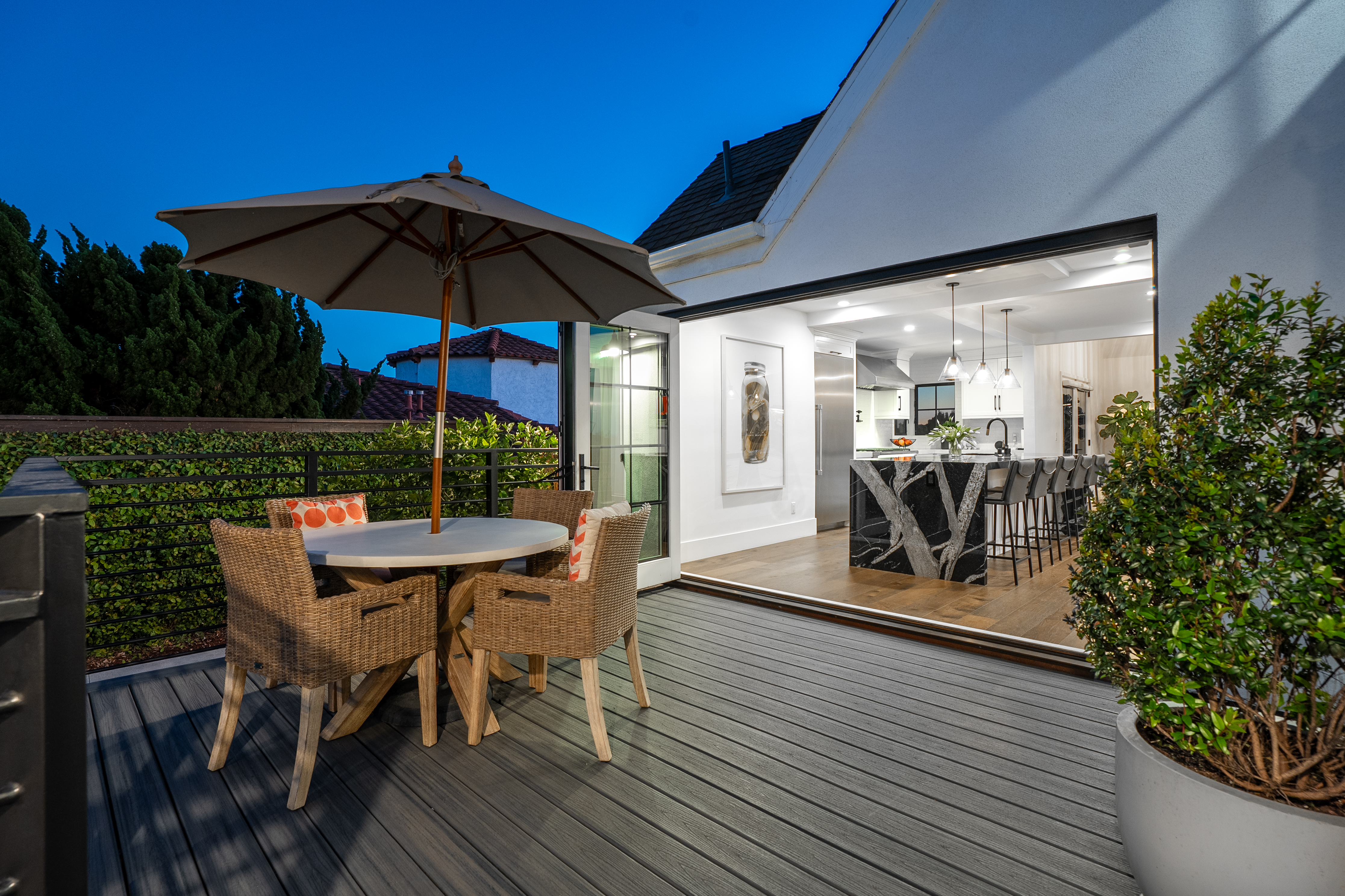 A rare Point Loma residence with panoramic views of Downtown San Diego, Coronado, the bay and the Pacific beyond Point Loma. Built in 1929, the home has been extensively renovated and expanded with the major transformation completed in 2021. High ceilings, hardwood flooring, formal dining, and a dramatic marble-slab fireplace with custom built-ins create an elevated interior. La Cantina doors open to the deck, resort-style pool, and an exceptionally private finished yard framed by mature hedges, with patio, turf, fountain and maximum privacy. A flexible lower level with separate entry offers ideal space for guests or multi-generational living. The renovation included major permitted improvements, expanded living areas, and comprehensive upgrades to core systems including HVAC with central air conditioning, plumbing, and electrical, along with a newly rebuilt garage and additional finished living space above. Multiple outdoor decks were created to maximize panoramic views, including decks off the primary suite, living area, and the library/bedroom suite above the garage. The kitchen is appointed with a full Thermador suite including refrigerator/freezer columns, wine refrigerator, double ovens, and a 6-burner range with griddle and pot filler, plus a large granite waterfall island with seating for five. Decking is Trex with updated iron railings, and the patio is plumbed for gas for a future fire feature. The primary suite features Italian Carrara marble finishes, dual sinks, separate water closet, walk-in closet and additional closet storage, and the primary bath and powder room are equipped with bidets. The lower level functions as a true guest suite with a spacious family room, full kitchenette, separate entry, laundry, large closets, plus a private bedroom and full bath.