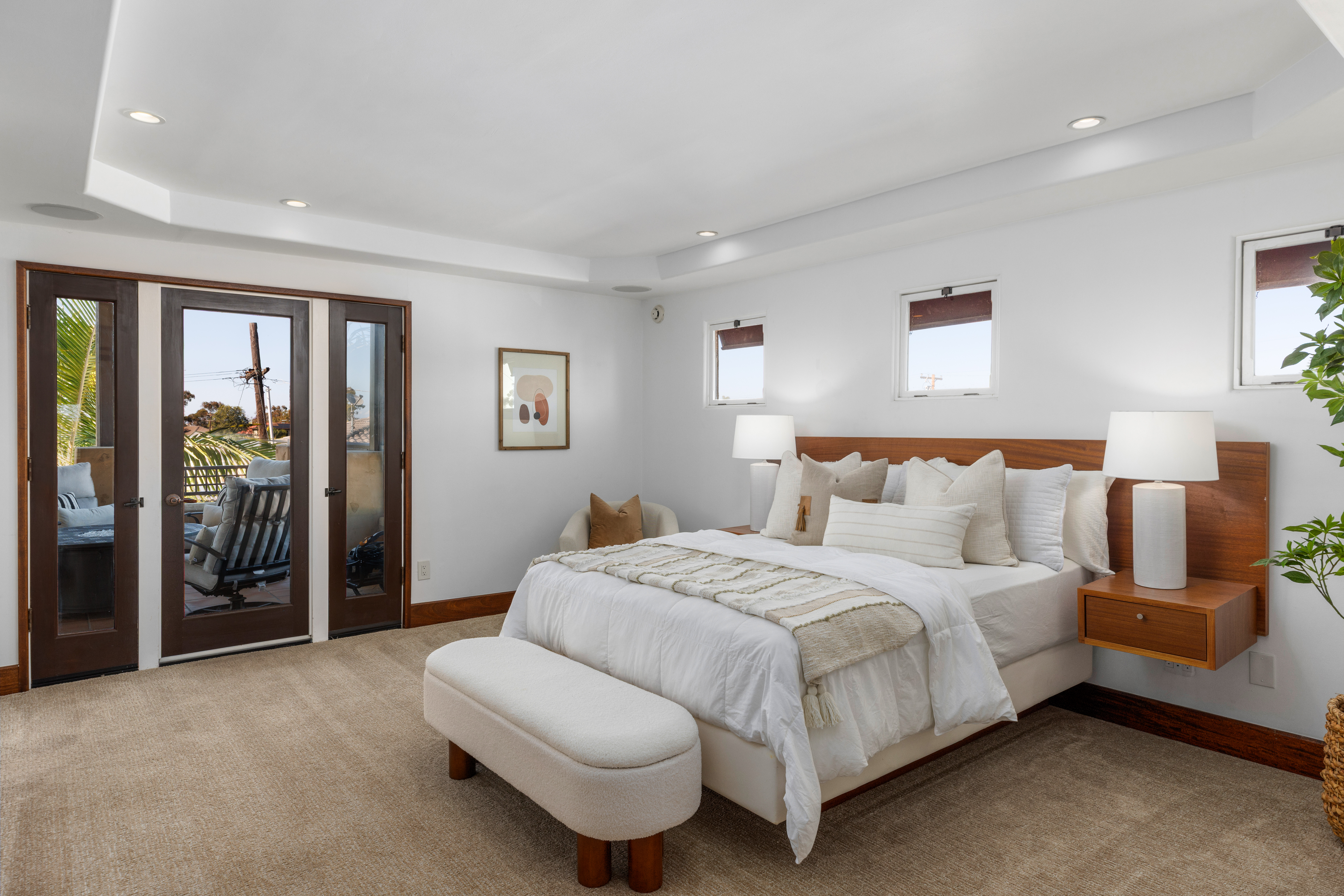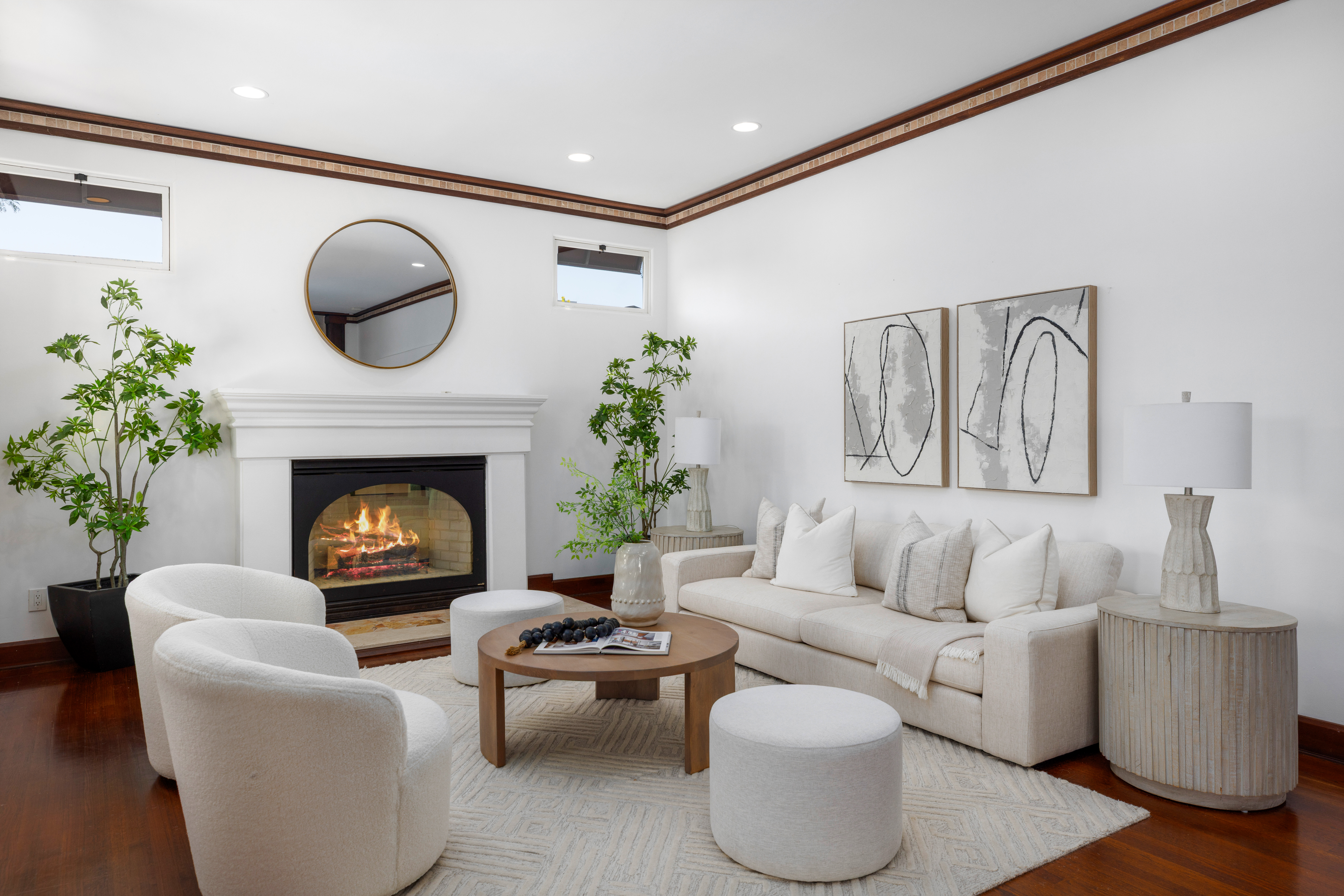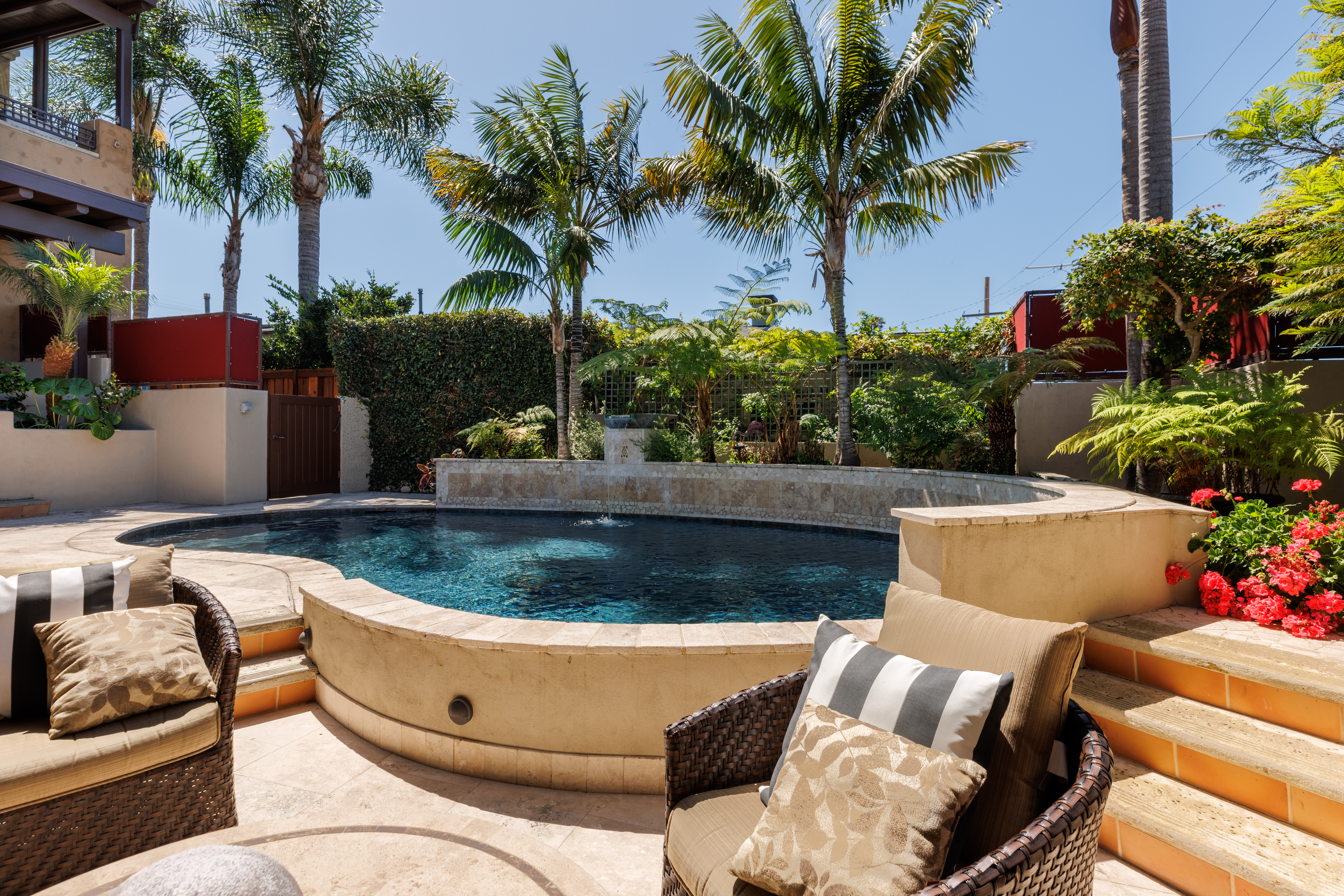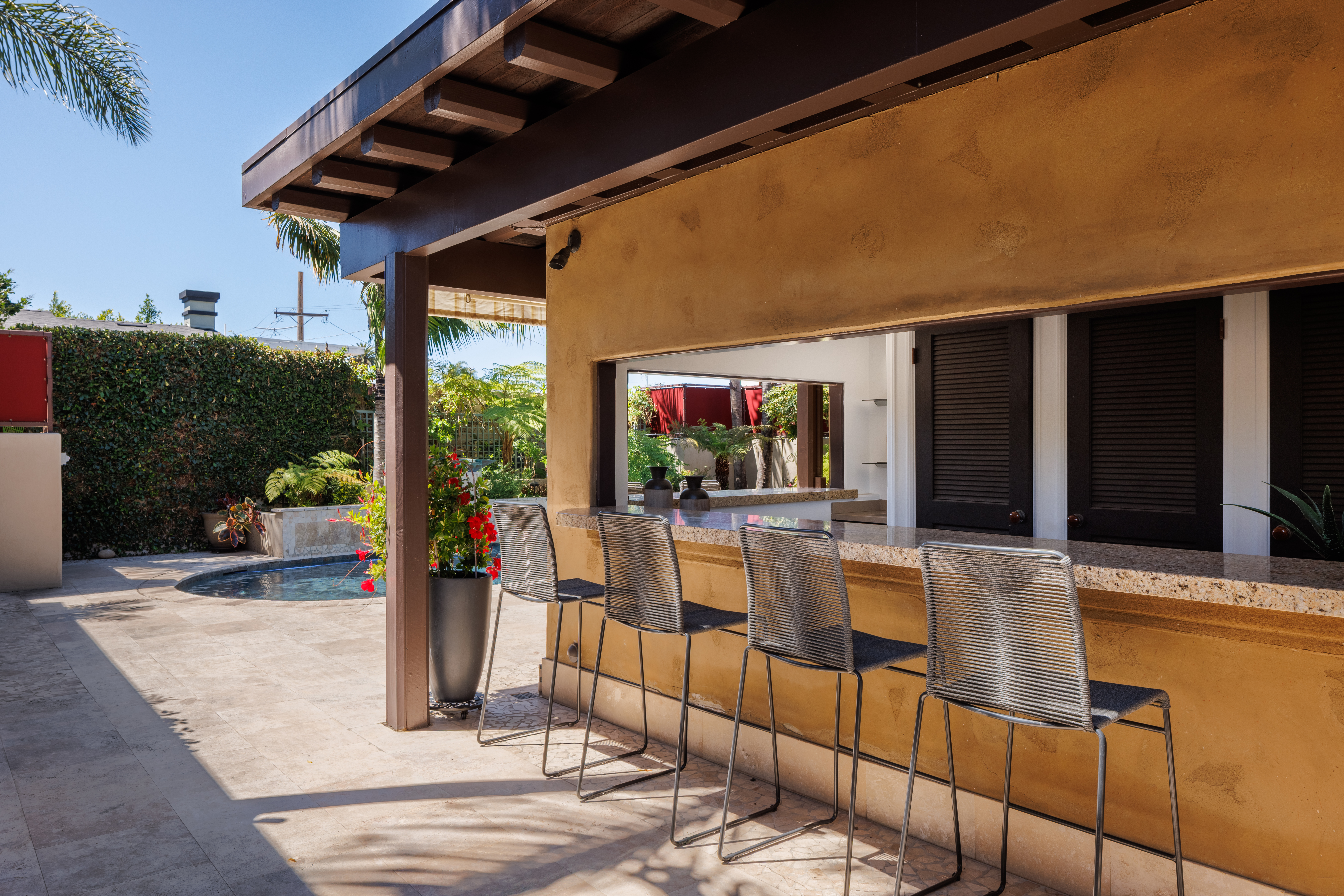 Turnkey and thoughtfully curated, this coastal-inspired residence blends timeless materials with modern sensibility. Designed for both effortless relaxation and elevated entertaining, this urban retreat is anchored by a resort-style backyard with lounge areas, covered outdoor kitchen, and seamless indoor-outdoor flow. Inviting interior features refined living spaces with fireplaces and multiple ensuite bedrooms, each with balconies that enhance a relaxed yet sophisticated atmosphere. Well-appointed chef’s kitchen showcases warm wood cabinetry and sleek countertops, opening effortlessly to the outdoors. Sculptural pool, built-in BBQ, and bar create ideal setting for gatherings and everyday enjoyment. Functional floor plan includes three entry-level bedrooms and two additional ensuite bedrooms upstairs, offering flexibility and privacy. Additional amenities include an alley-access garage and owned solar.