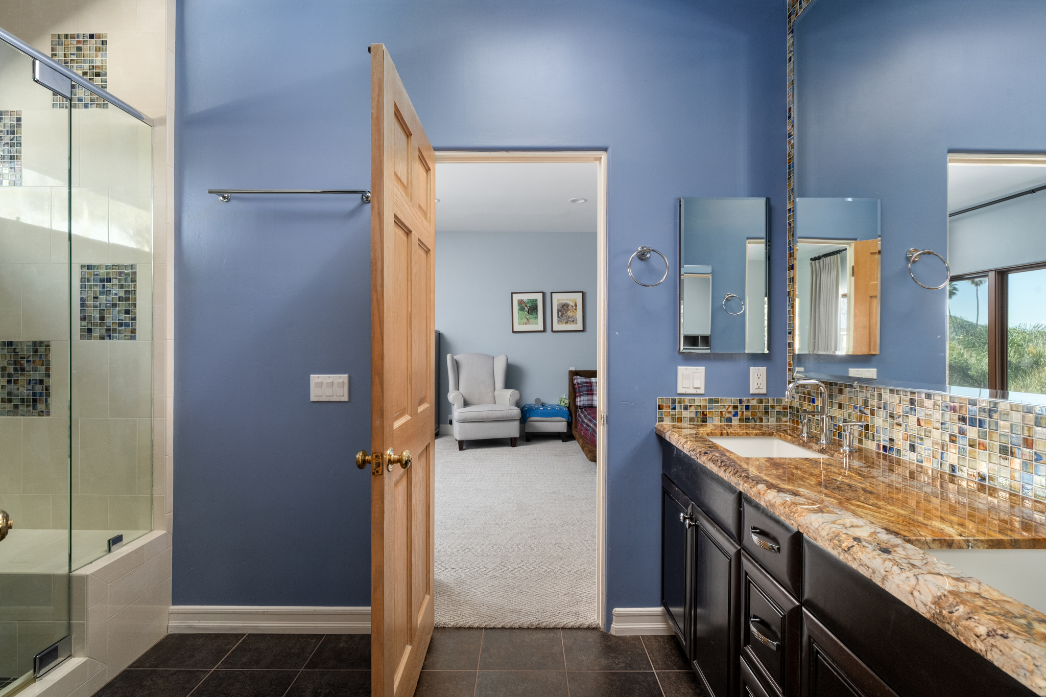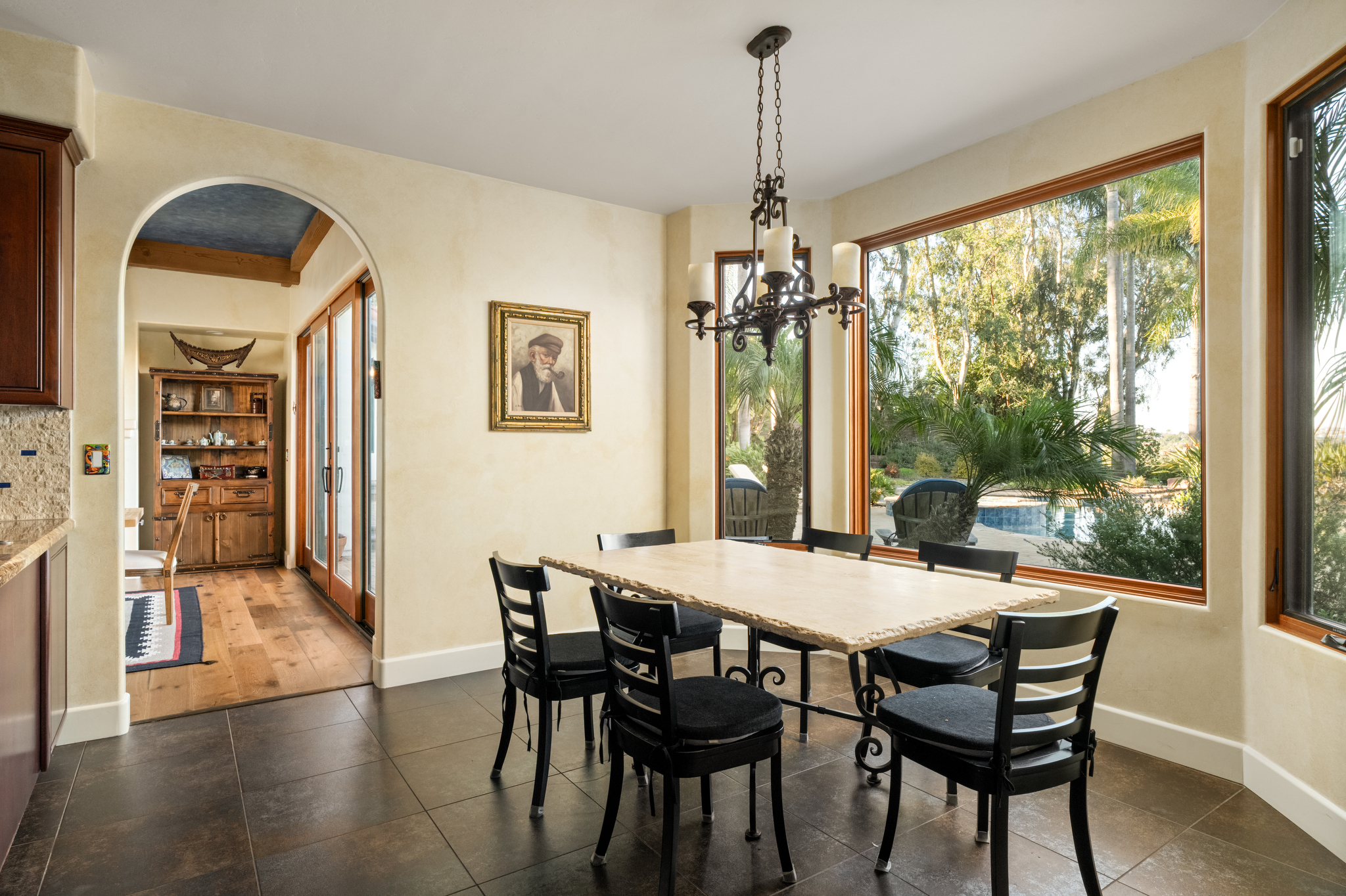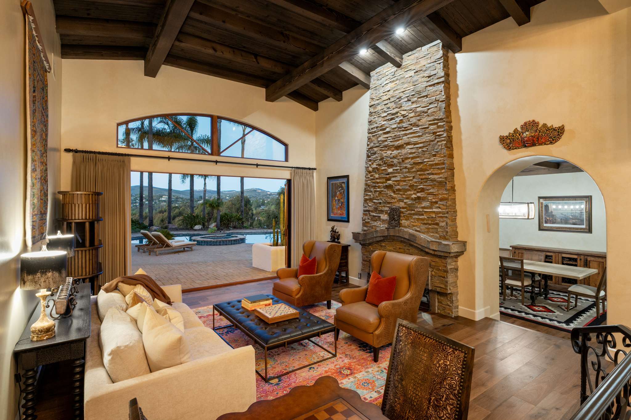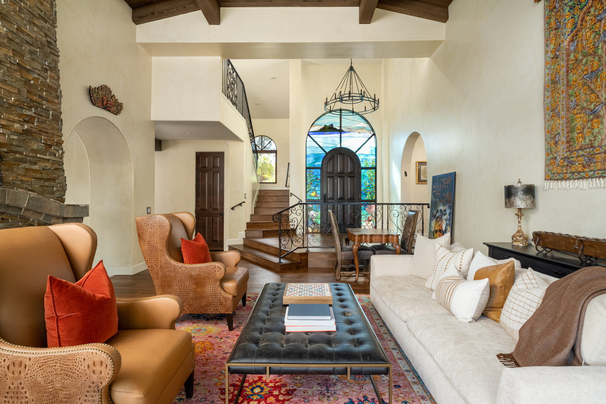 Set on a quiet cul-de-sac behind the gates of South Pointe Farms, this refined Mediterranean-inspired estate sits on two acres with sweeping views of rolling hills. Thoughtfully updated with modern touches, the home features white oak floors, soaring ceilings with decorative wood beams, arched doorways, wrought-iron balustrades, a pre-paid solar lease, and new windows and doors that frame picturesque vistas throughout. A dramatic foyer flows into the formal living and dining rooms with a double-sided stacked-stone fireplace overlooking the entertainer’s backyard. Anchored by a granite island with bar seating and premium Wolf appliances, the chef’s kitchen opens to a spacious family room with a custom tiled fireplace, coffee bar, and knotty alder built-ins. The coveted main-level primary wing offers a luxurious renovated bath with dual vanities, steam shower, soaking tub, and walk-in closet, plus an adjacent office with custom built-ins. Two additional downstairs bedrooms feature updated ensuite baths, while upstairs a light-filled hallway leads to three more bedrooms, including an ensuite with a reading nook and beautifully remodeled bath. The fully fenced backyard showcases drought-tolerant landscaping, a covered patio, saltwater pool and spa with safety fencing, a grassy dog-run area, and a gentle slope leading to a flat pad ideal for a future sports court. A rare blend of privacy, beauty, and everyday comfort in a setting designed for elevated living.