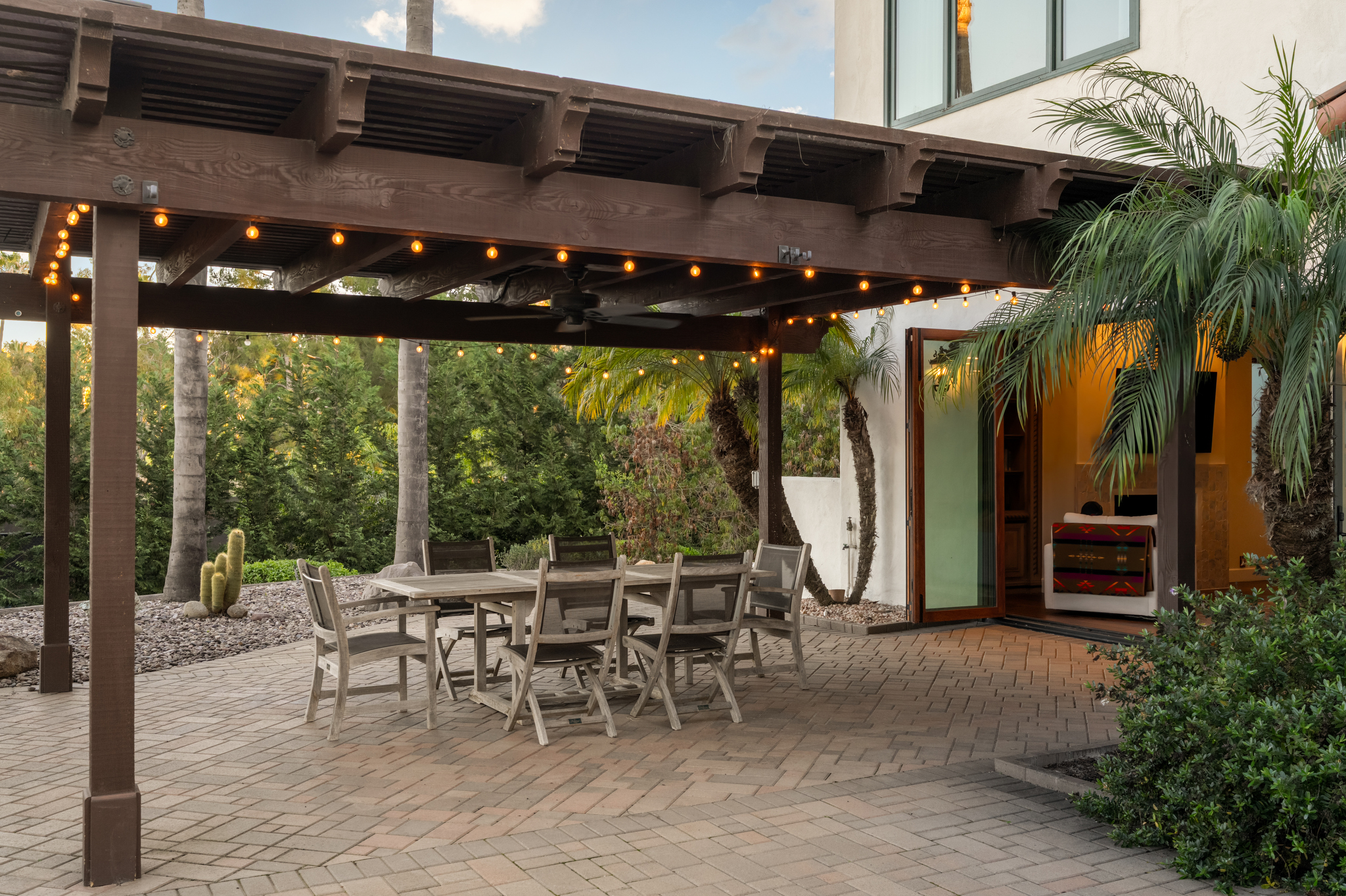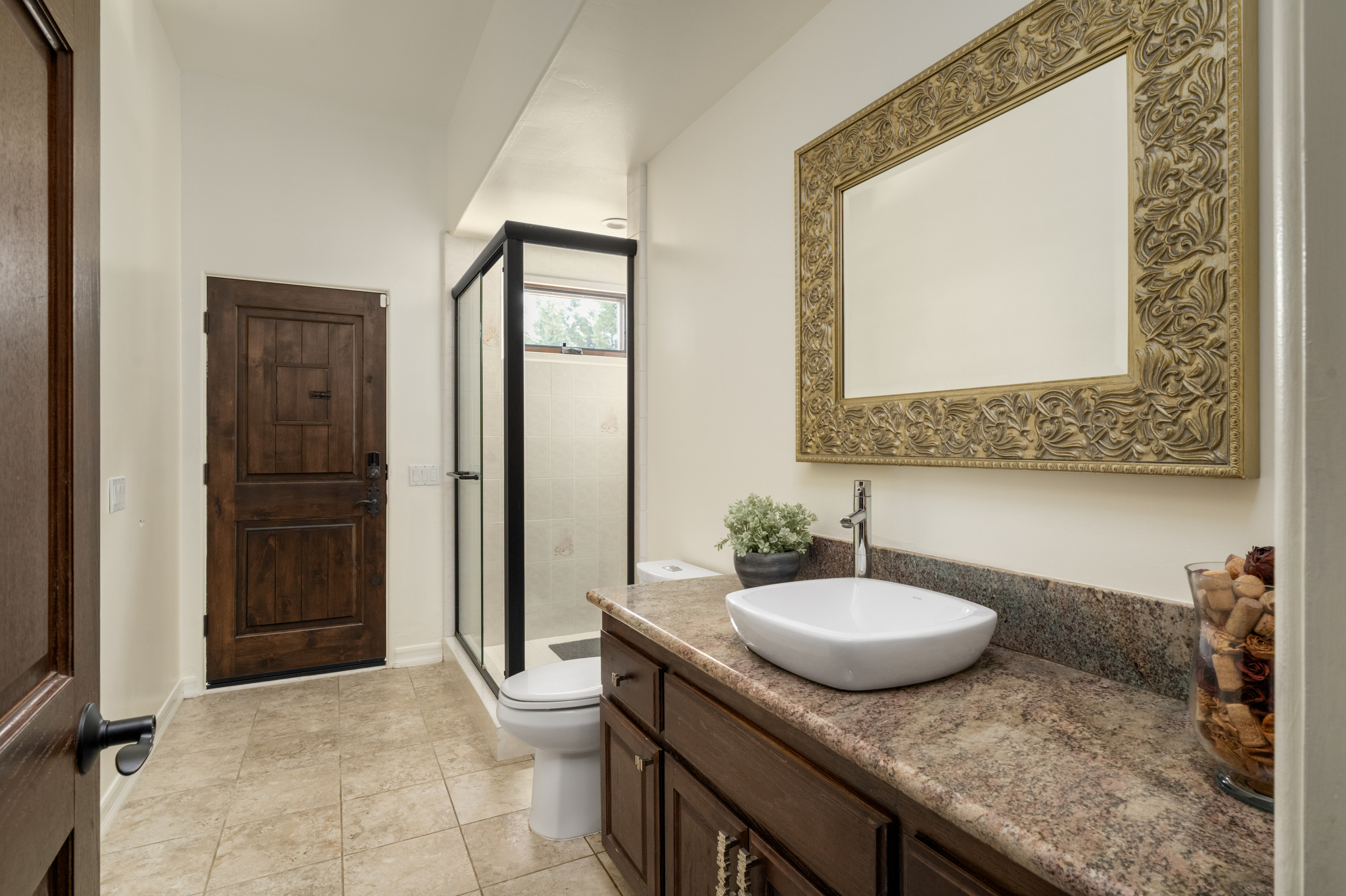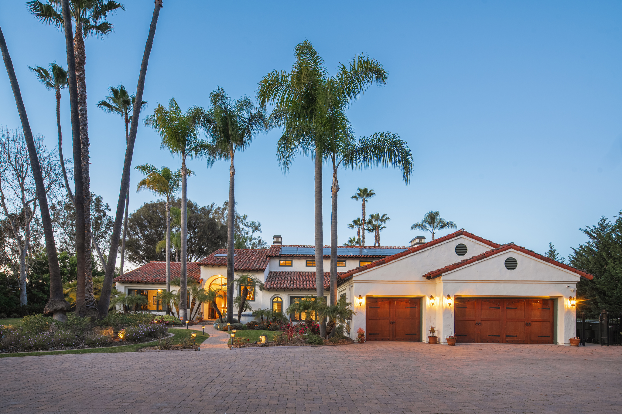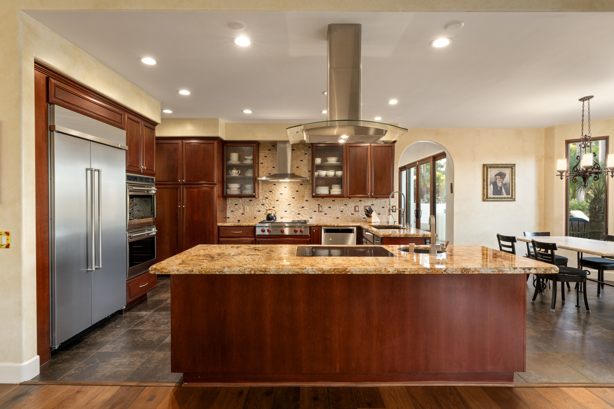 Set on a quiet cul-de-sac behind the gates of South Pointe Farms, this refined Mediterranean-inspired estate sits on two acres with sweeping views of rolling hills. Thoughtfully updated with modern touches, the home features white oak floors, soaring ceilings with decorative wood beams, arched doorways, wrought-iron balustrades, a pre-paid solar lease, and new windows and doors that frame picturesque vistas throughout. A dramatic foyer flows into the formal living and dining rooms with a double-sided stacked-stone fireplace overlooking the entertainer’s backyard. Anchored by a granite island with bar seating and premium Wolf appliances, the chef’s kitchen opens to a spacious family room with a custom tiled fireplace, coffee bar, and knotty alder built-ins. The coveted main-level primary wing offers a luxurious renovated bath with dual vanities, steam shower, soaking tub, and walk-in closet, plus an adjacent office with custom built-ins. Two additional downstairs bedrooms feature updated ensuite baths, while upstairs a light-filled hallway leads to three more bedrooms, including an ensuite with a reading nook and beautifully remodeled bath. The fully fenced backyard showcases drought-tolerant landscaping, a covered patio, saltwater pool and spa with safety fencing, a grassy dog-run area, and a gentle slope leading to a flat pad ideal for a future sports court. A rare blend of privacy, beauty, and everyday comfort in a setting designed for elevated living.