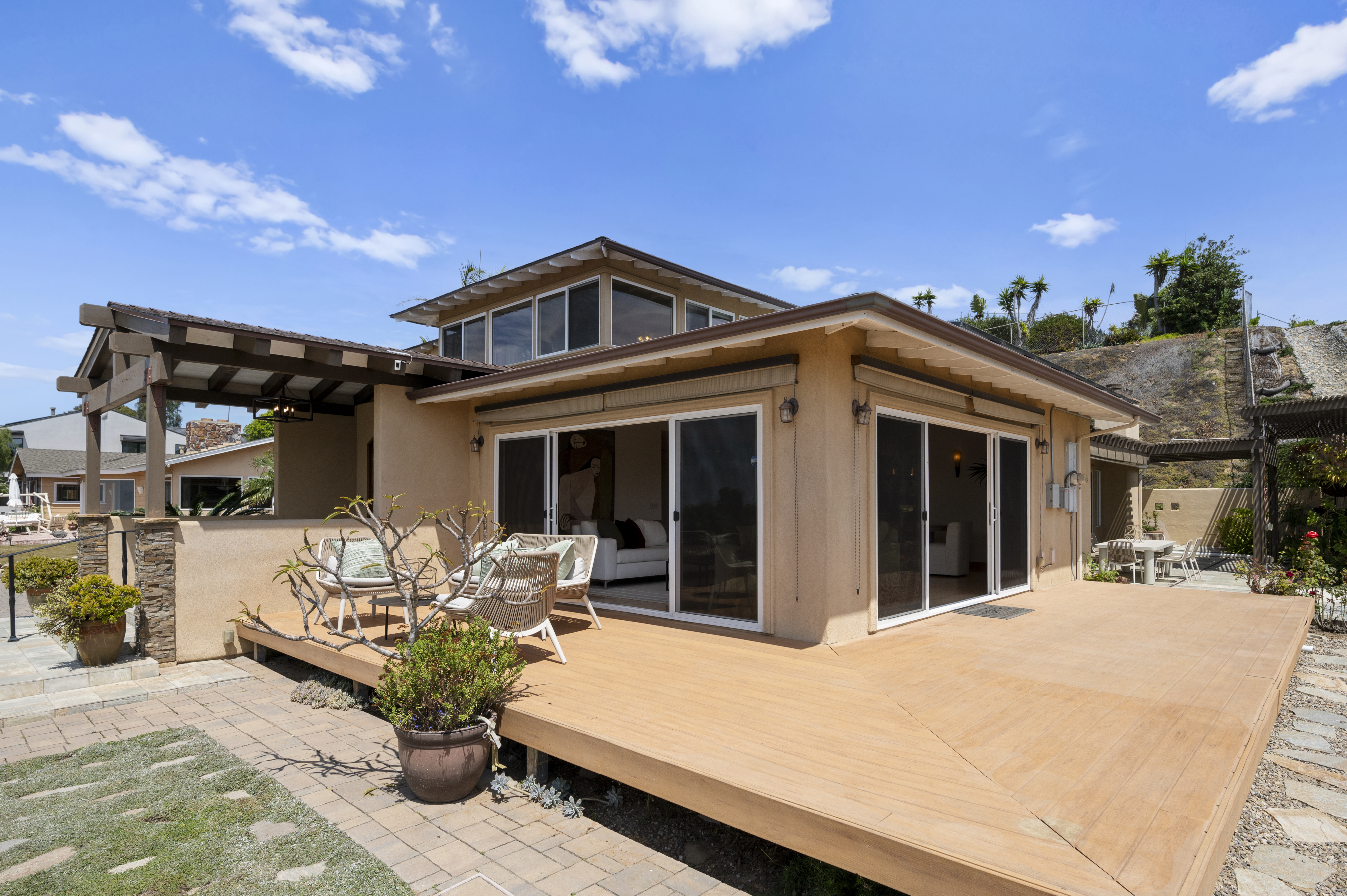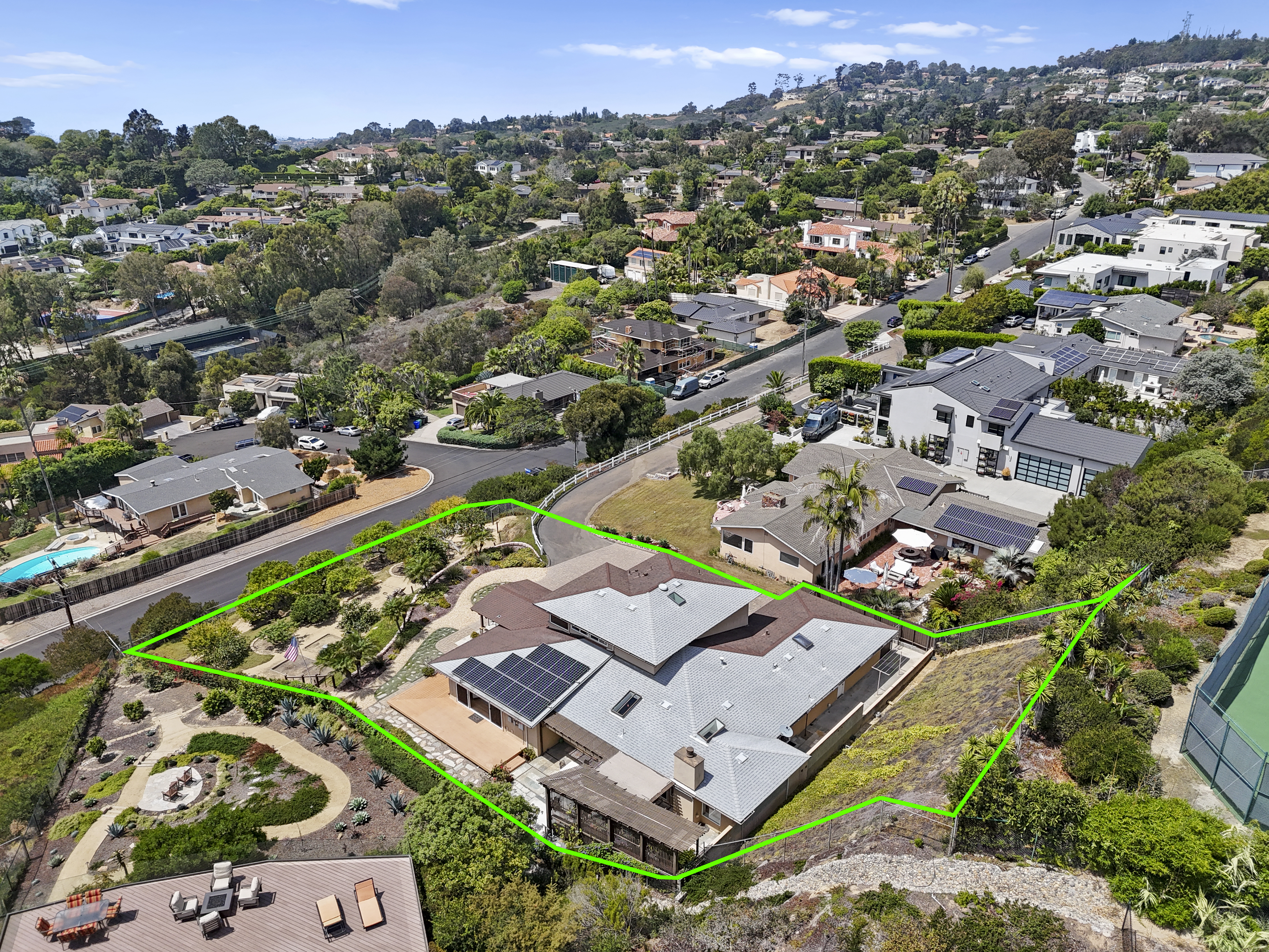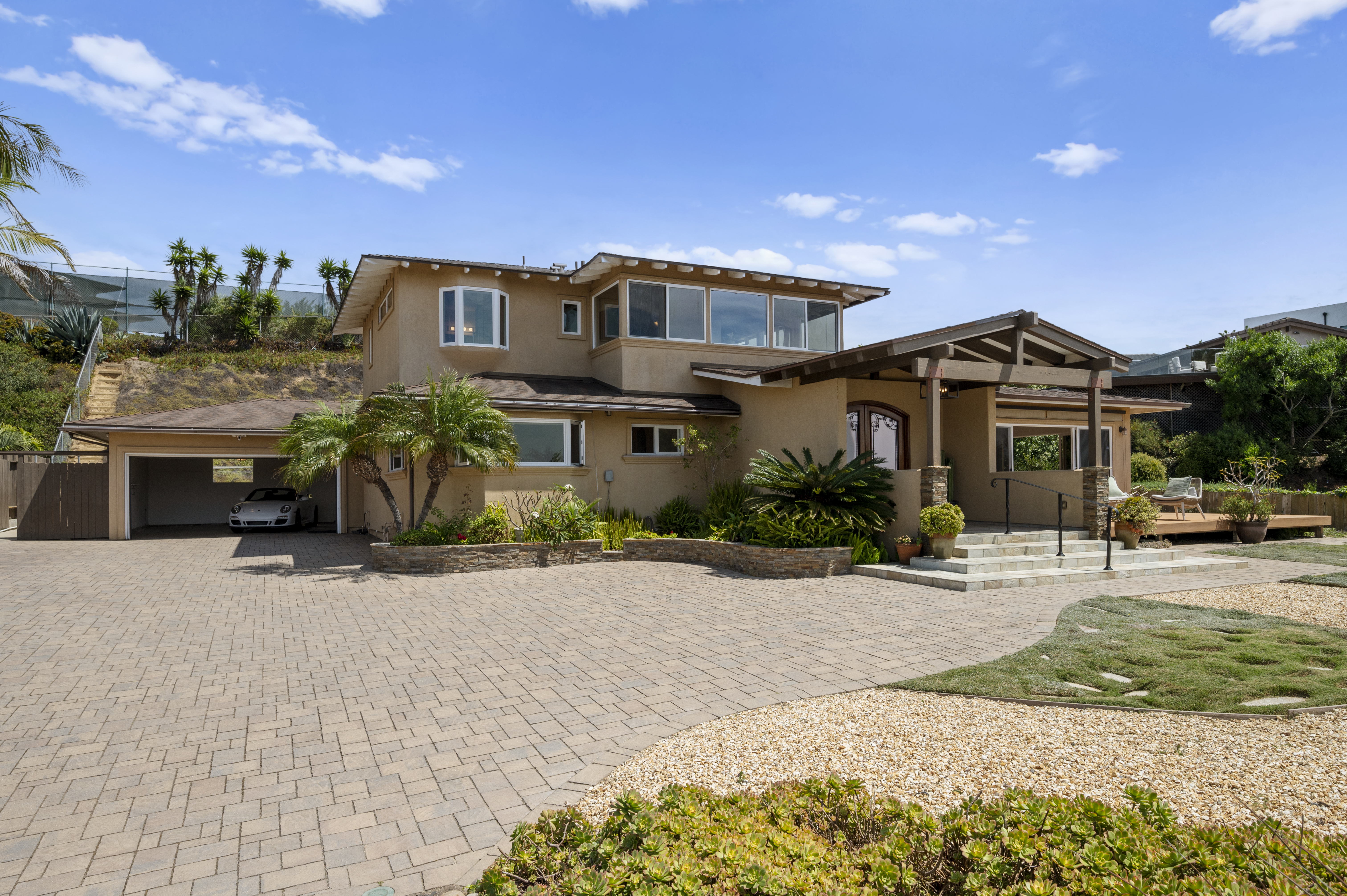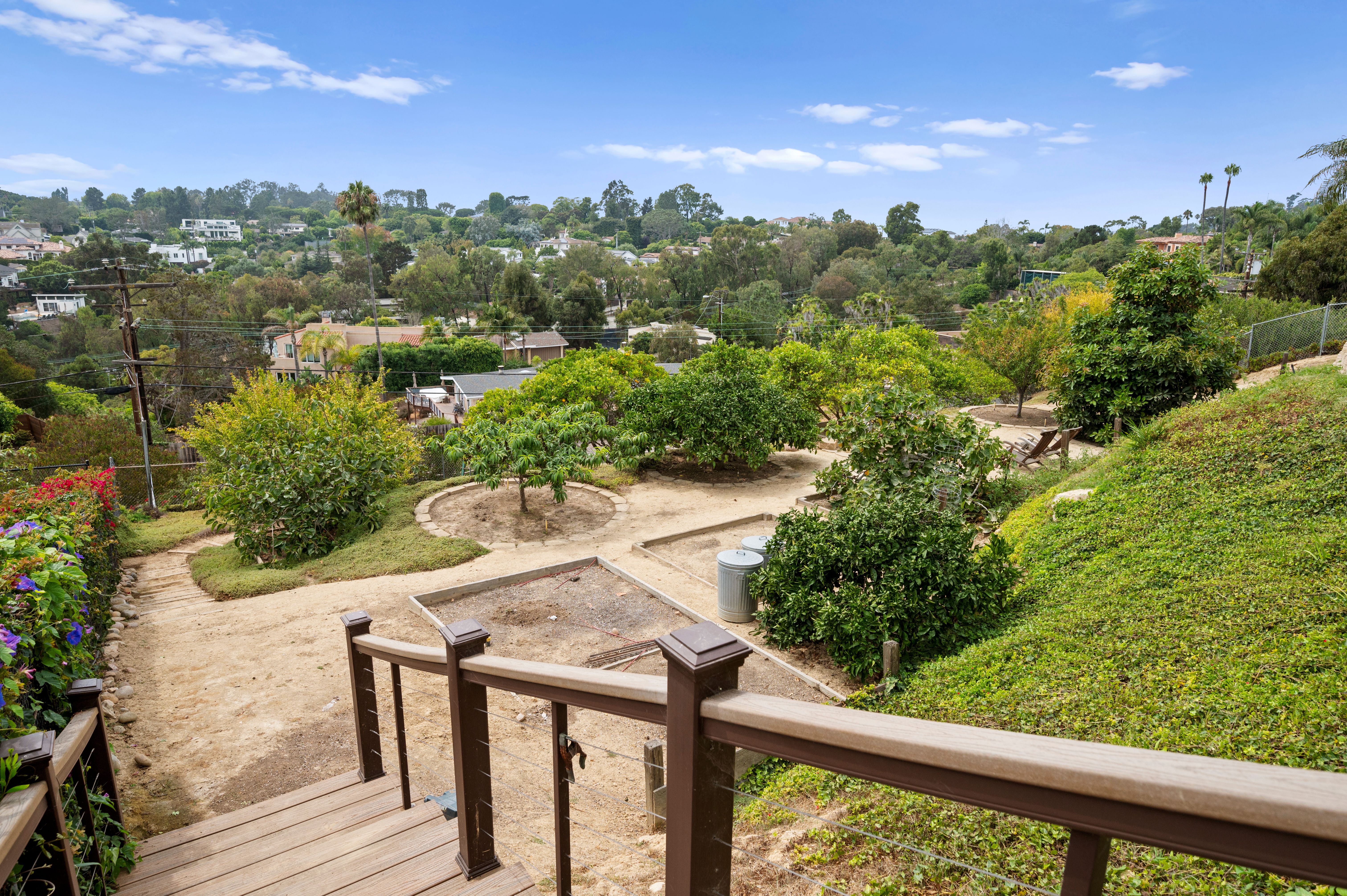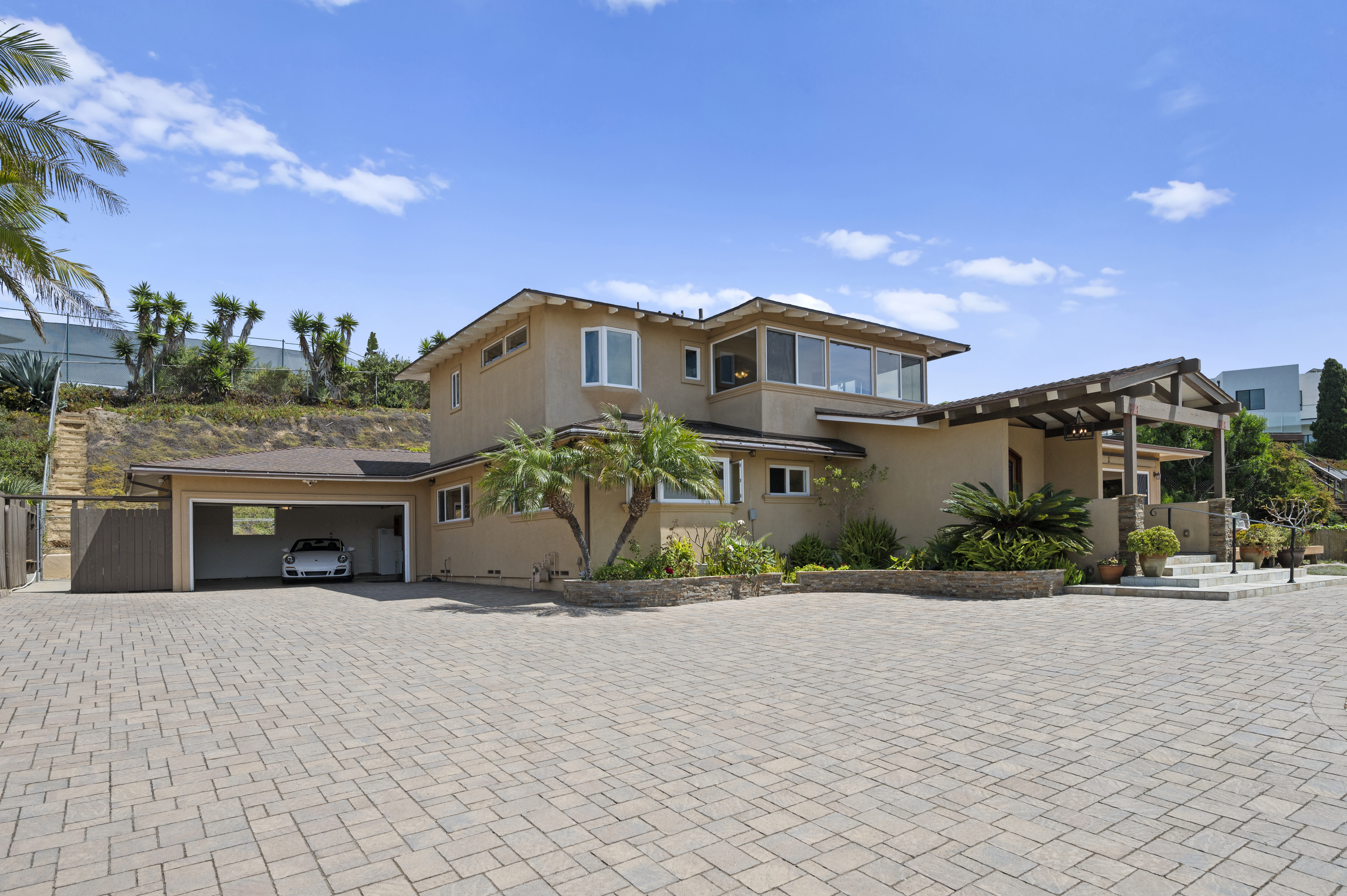 EXQUISITE PRIVATE HILLTOP RETREAT WITH PANORAMIC OCEAN VIEW! This custom-built Muirlands Crest estate offers spectacular coastline and lush canyon views from nearly every window of the home as well as from its expansive private deck. Perfectly situated on a huge 21,000 sf lot at the end of an exclusive five-home private drive, this property is on the market for the first time in 57 years. This open-concept home features formal entry, plenty of oversized windows and sliders, soaring ceilings, gleaming hardwood floors, custom built-ins in each of the generous-sized bedrooms, and a gorgeous chef's kitchen. Cozy up in front of the kiva-style gas FP in the adjacent family room. Step outside onto the sizable, shaded patio with vertical garden. A flexible floor plan offers two primary suites, one on each level. The light-filled upper suite has a roomy open bath, walk-in closet and dressing room, dedicated WFH space, and a sitting area in the sunroom with views of the sparkling coastline waters all the way to Mexico! The lower half of the property boasts a terraced fruit orchard with 30+ mature trees while palm-drenched, drought-tolerant landscaping surrounds the home. Everything is on automated irrigation for easy maintenance. Other features include fully-owned rooftop solar with net positive output, drinking water filtration system, and 2 car garage with dedicated outlet for your EV as well as W/ D hookups. This freshly painted home is move-in ready or can be reimagined to maximize the potential of this truly unique parcel. This is your opportunity to own a glorious piece of SoCal heaven!