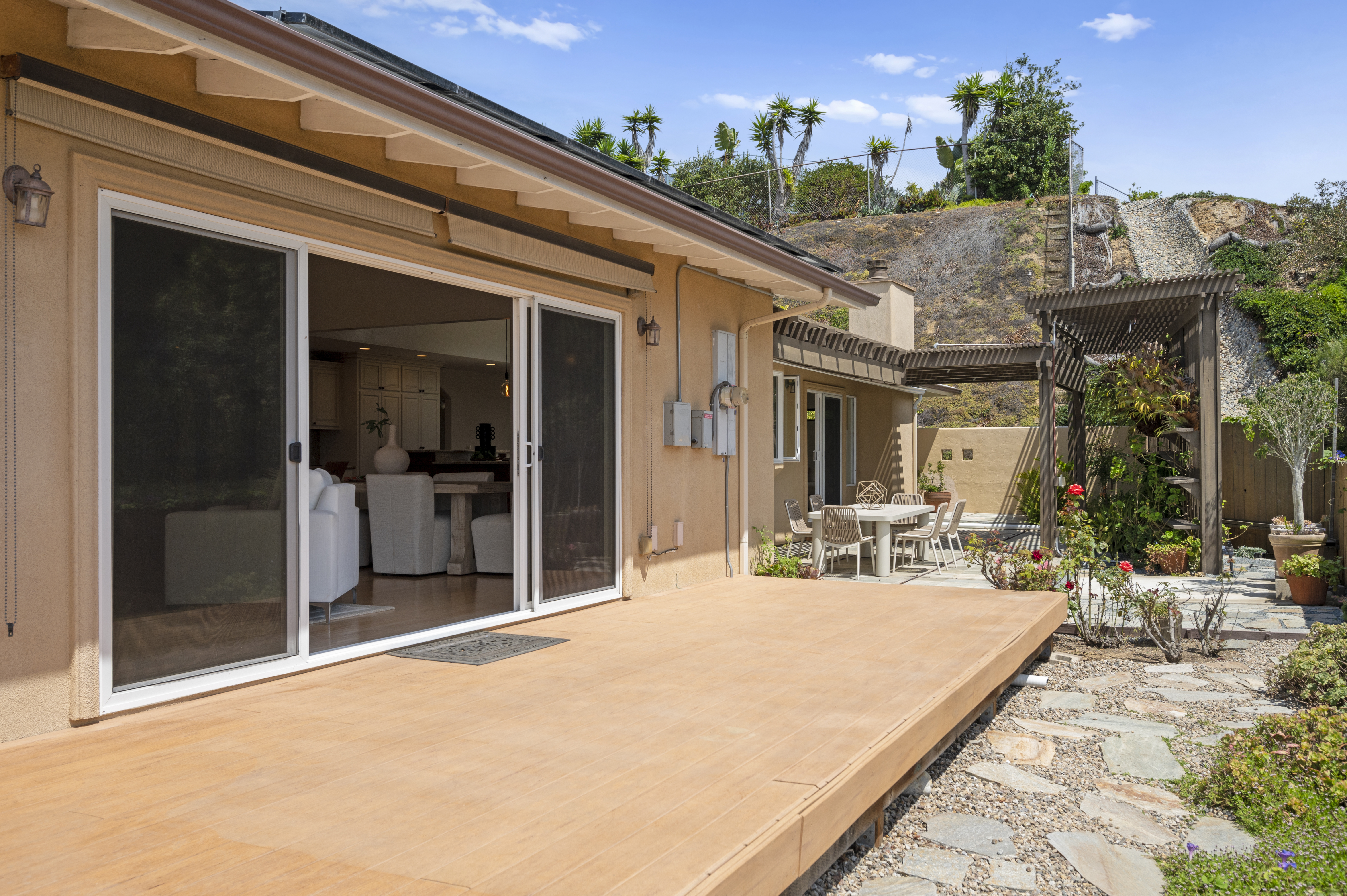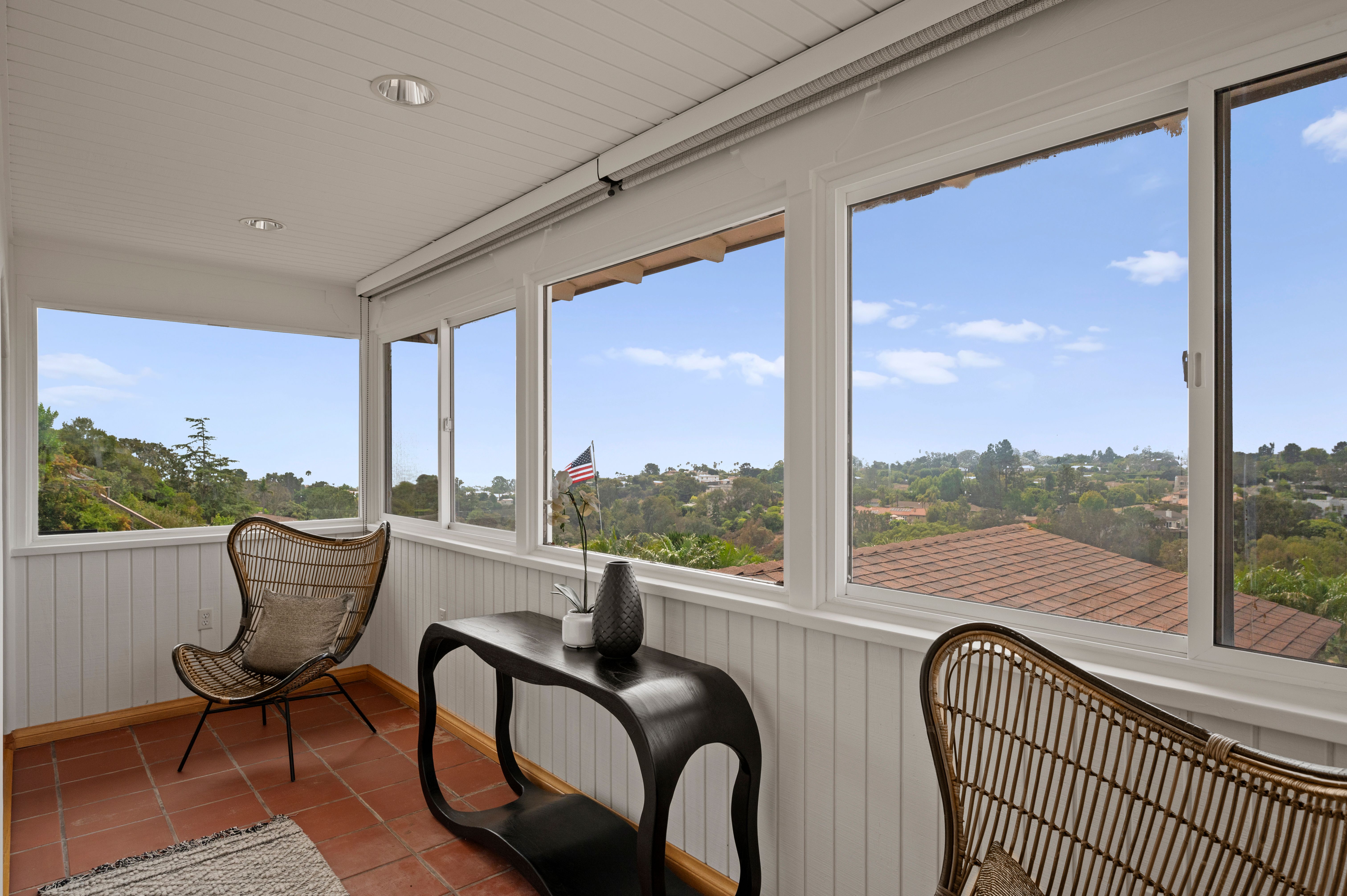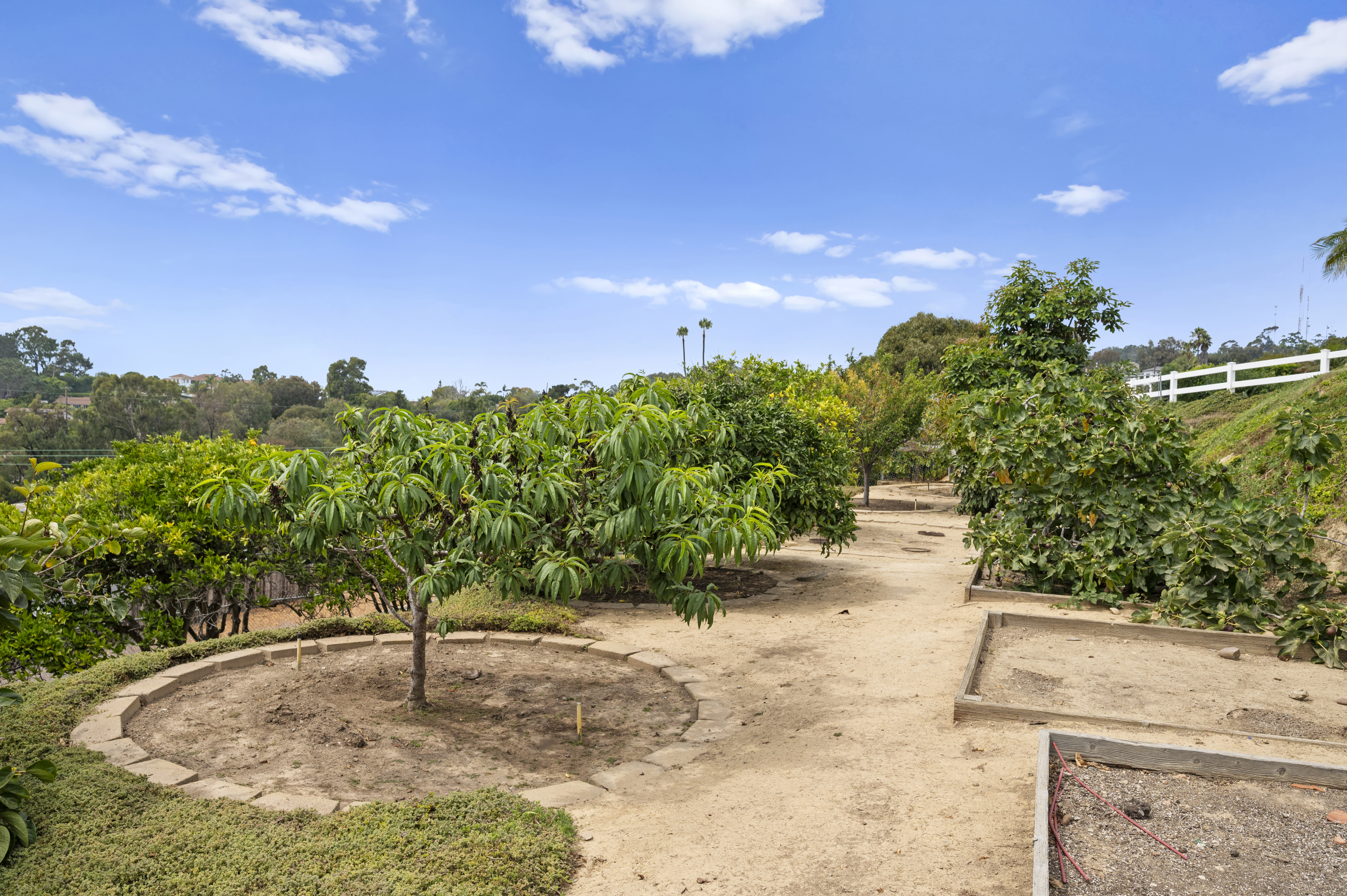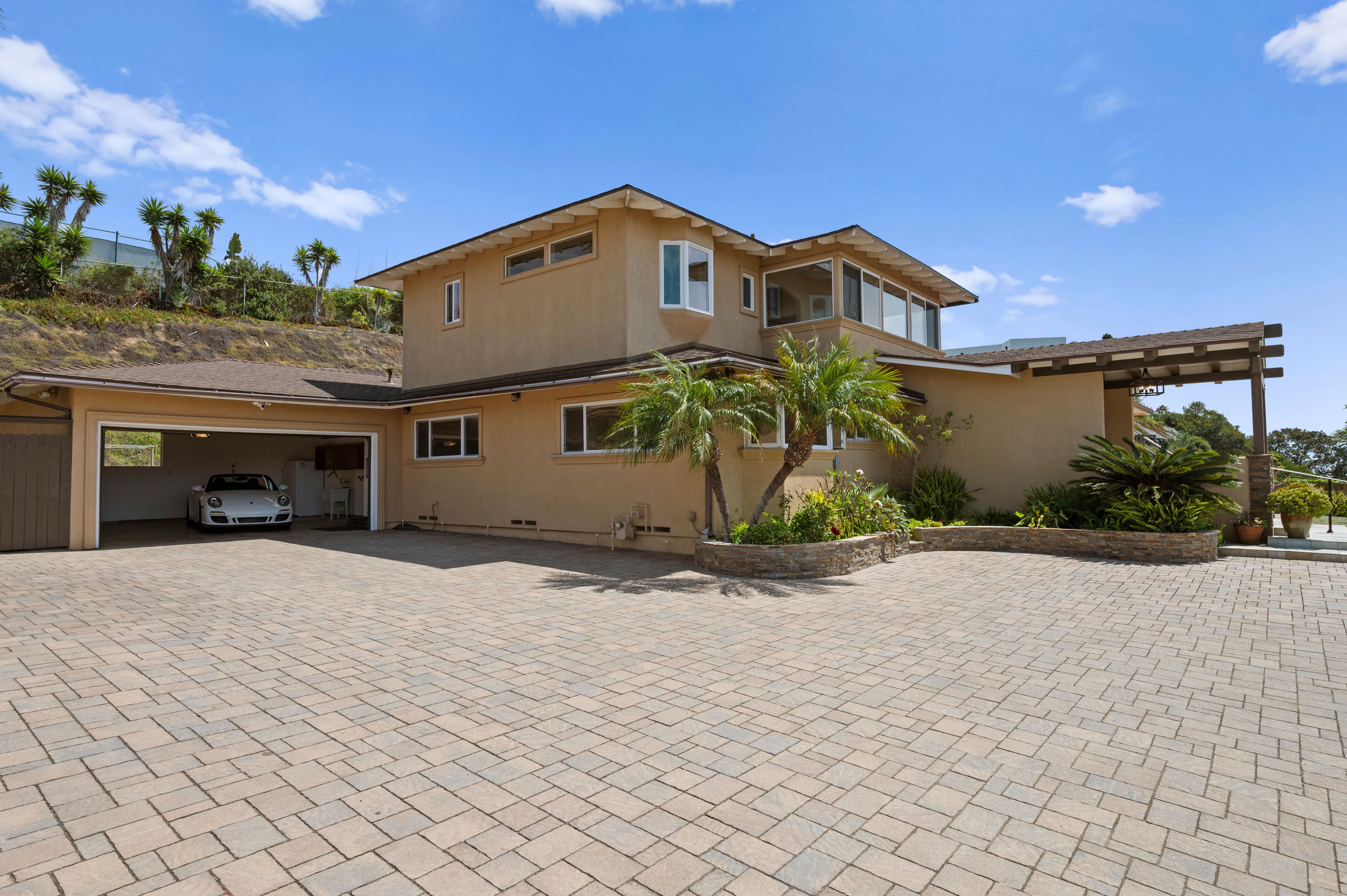 EXQUISITE PRIVATE HILLTOP RETREAT WITH PANORAMIC OCEAN VIEW! This custom-built Muirlands Crest estate offers spectacular coastline and lush canyon views from nearly every window of the home as well as from its expansive private deck. Perfectly situated on a huge 21,000 sf lot at the end of an exclusive five-home private drive, this property is on the market for the first time in 57 years. This open-concept home features formal entry, plenty of oversized windows and sliders, soaring ceilings, gleaming hardwood floors, custom built-ins in each of the generous-sized bedrooms, and a gorgeous chef's kitchen. Cozy up in front of the kiva-style gas FP in the adjacent family room. Step outside onto the sizable, shaded patio with vertical garden. A flexible floor plan offers two primary suites, one on each level. The light-filled upper suite has a roomy open bath, walk-in closet and dressing room, dedicated WFH space, and a sitting area in the sunroom with views of the sparkling coastline waters all the way to Mexico! The lower half of the property boasts a terraced fruit orchard with 30+ mature trees while palm-drenched, drought-tolerant landscaping surrounds the home. Everything is on automated irrigation for easy maintenance. Other features include fully-owned rooftop solar with net positive output, drinking water filtration system, and 2 car garage with dedicated outlet for your EV as well as W/ D hookups. This freshly painted home is move-in ready or can be reimagined to maximize the potential of this truly unique parcel. This is your opportunity to own a glorious piece of SoCal heaven!