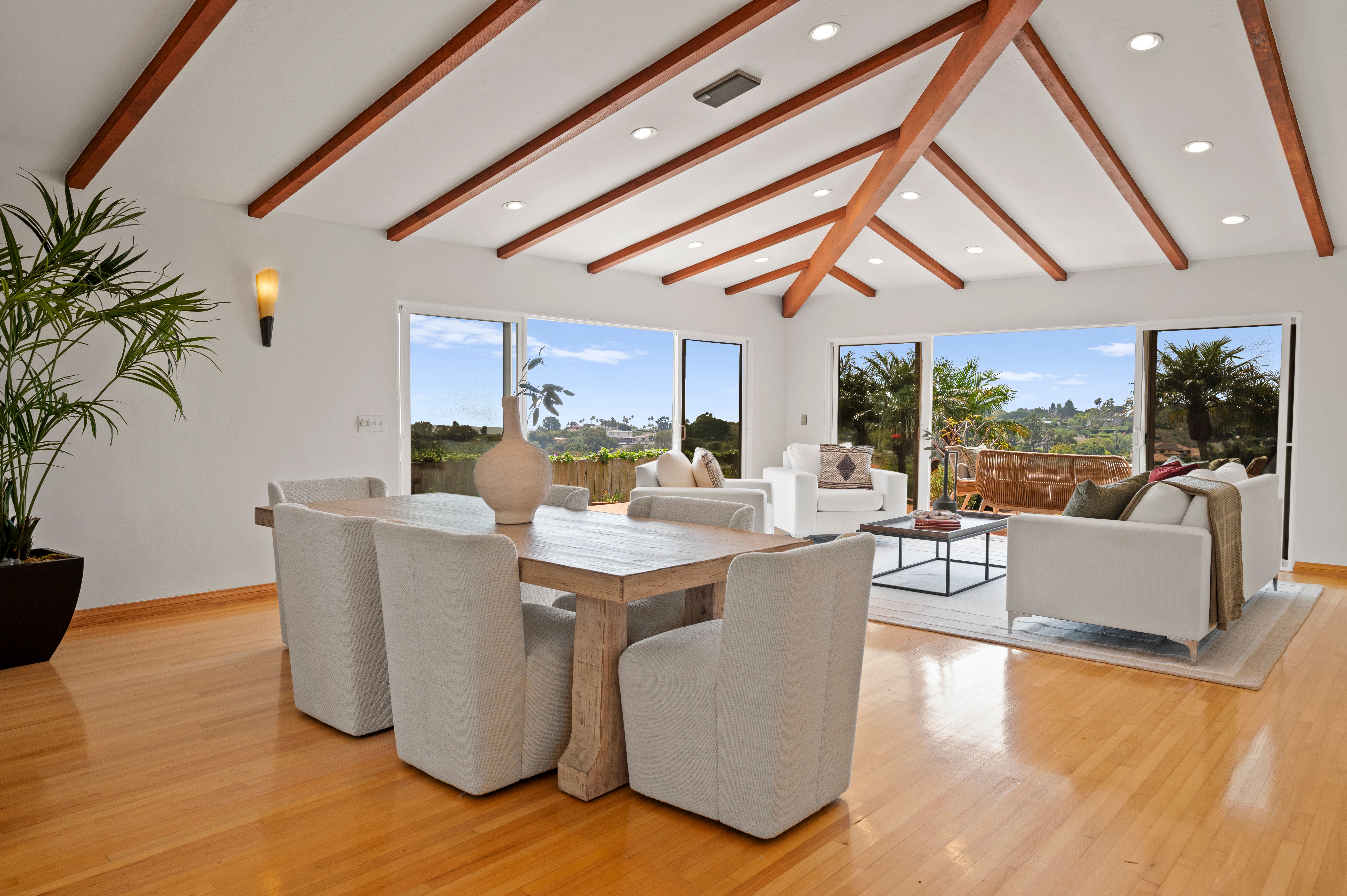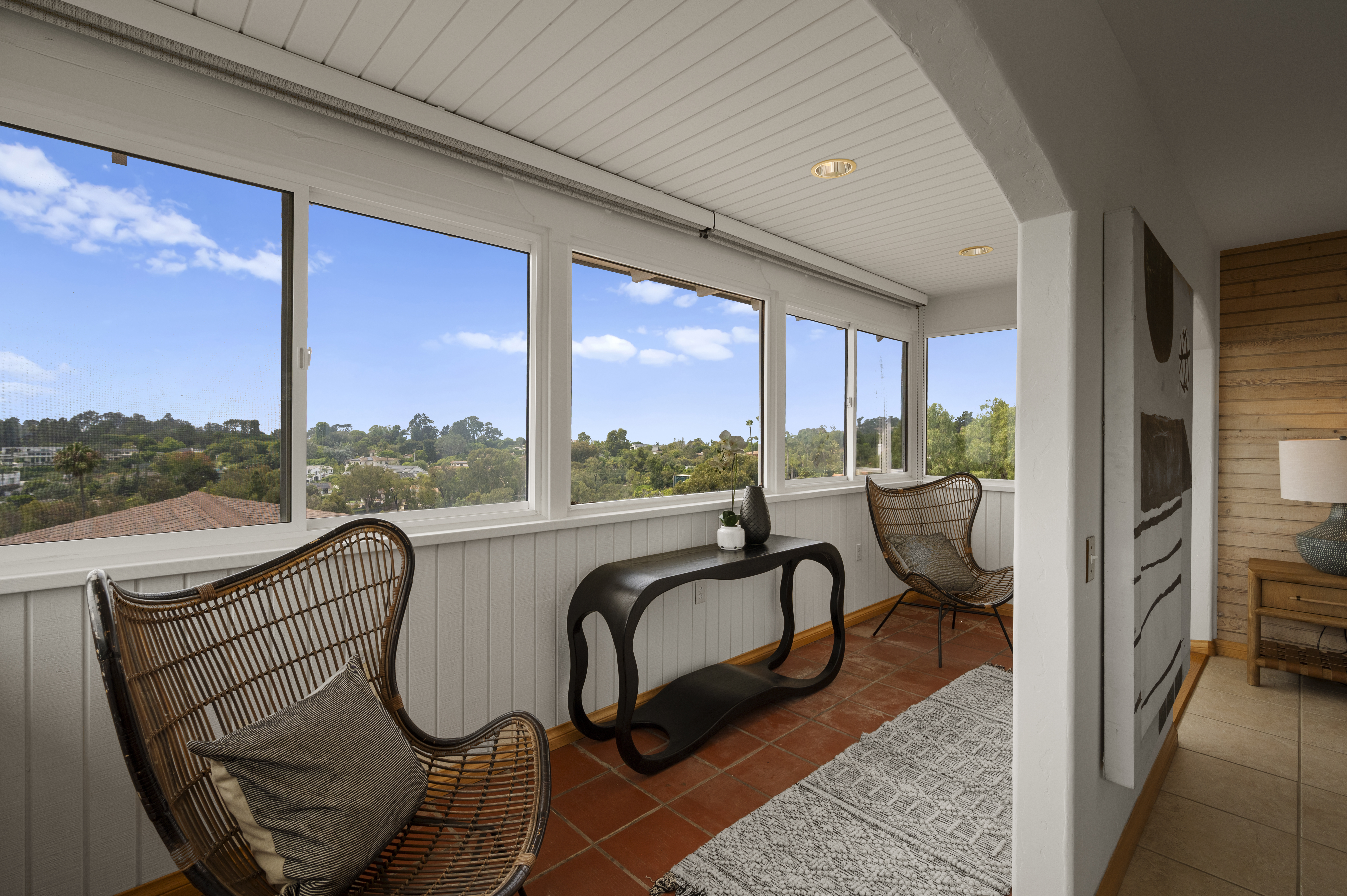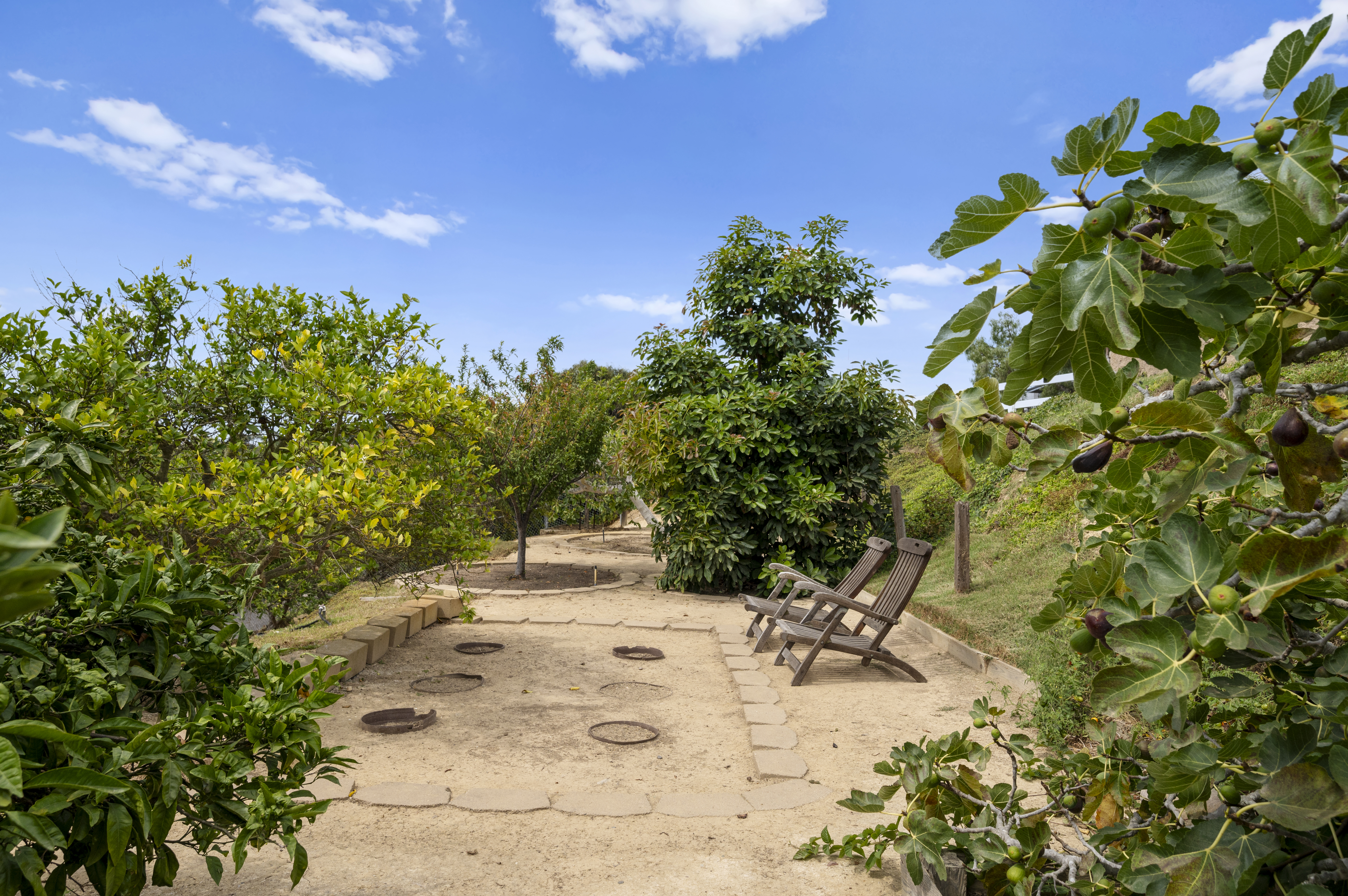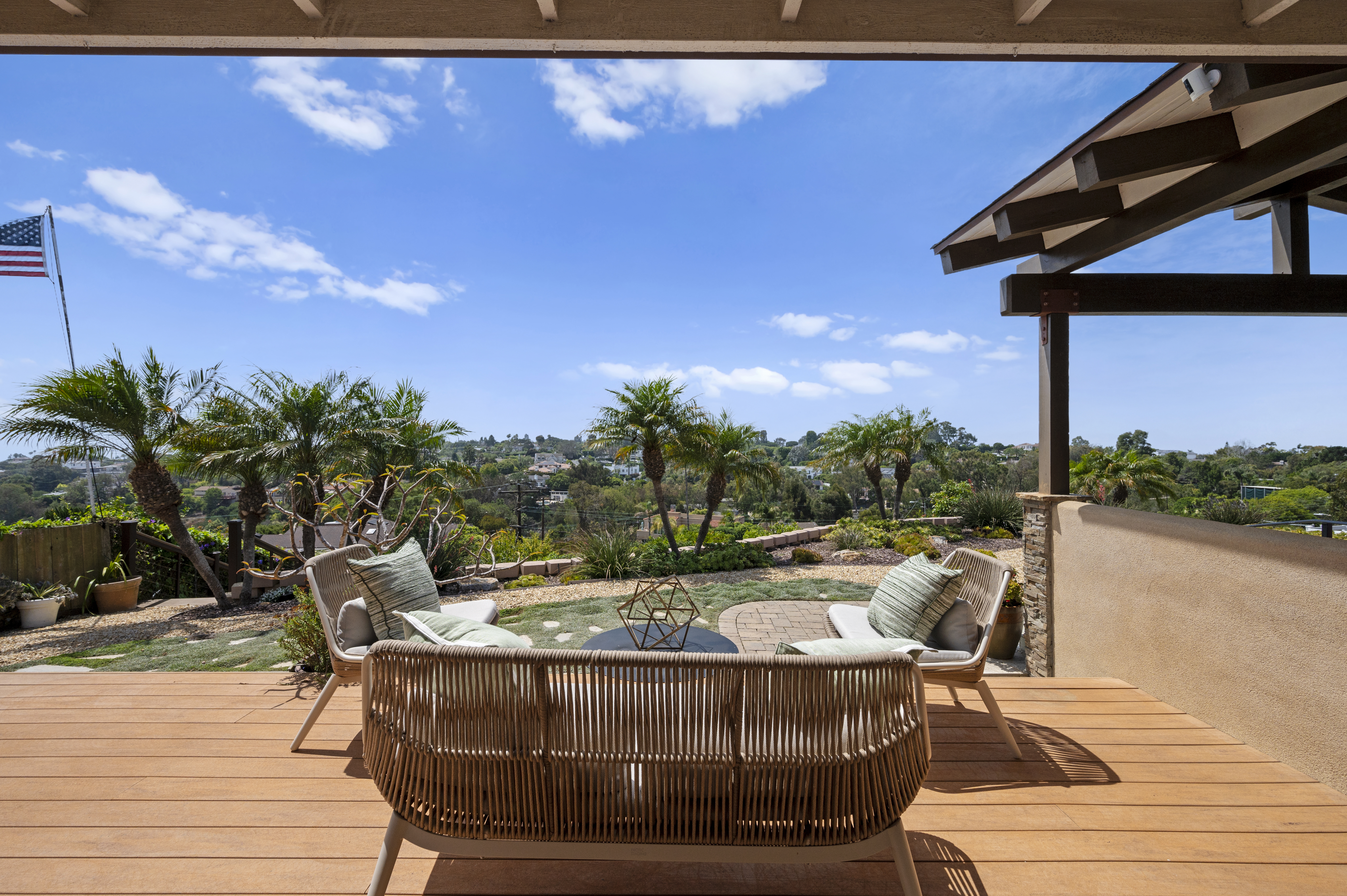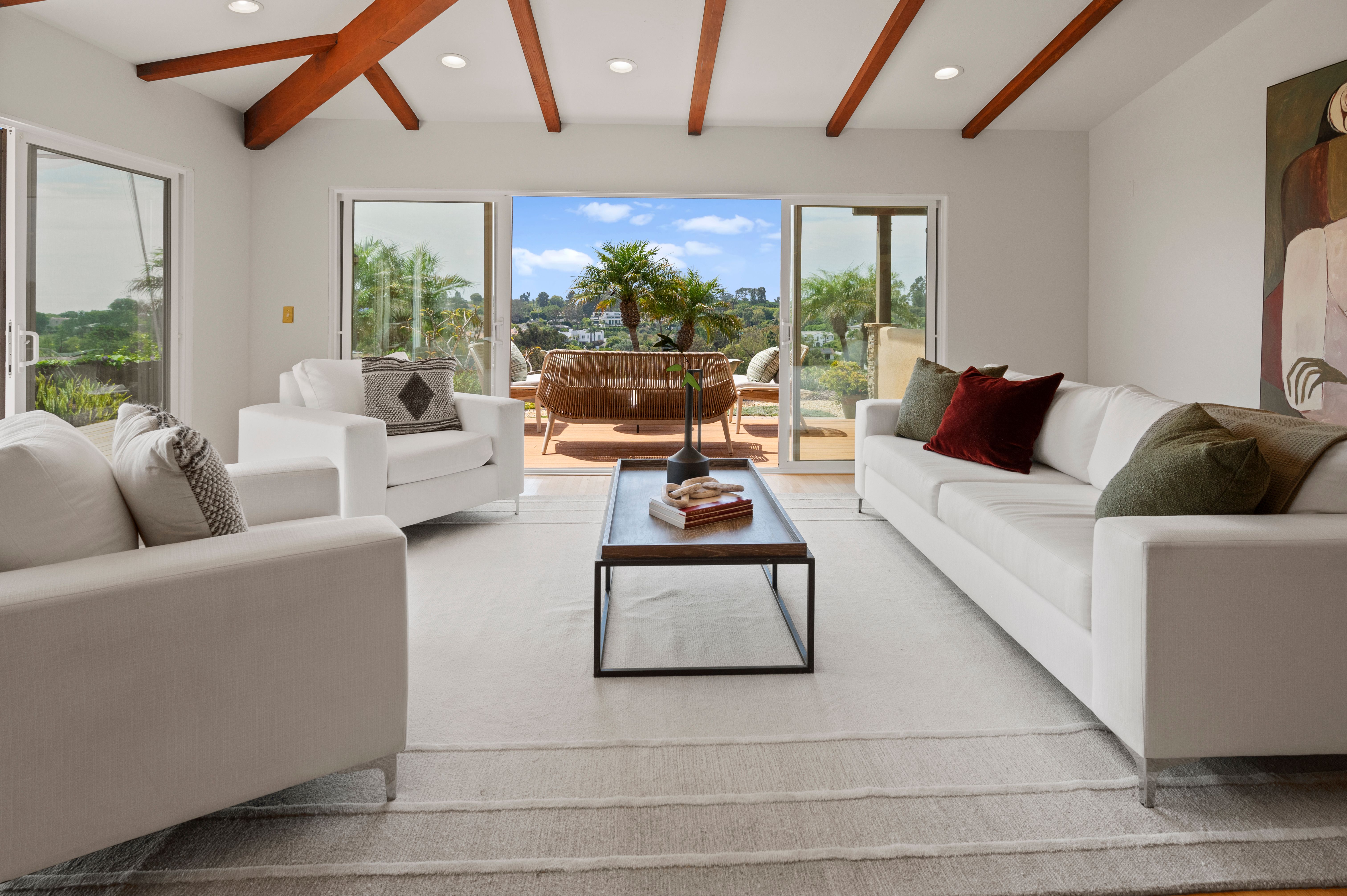 EXQUISITE PRIVATE HILLTOP RETREAT WITH PANORAMIC OCEAN VIEW! This custom-built Muirlands Crest estate offers spectacular coastline and lush canyon views from nearly every window of the home as well as from its expansive private deck. Perfectly situated on a huge 21,000 sf lot at the end of an exclusive five-home private drive, this property is on the market for the first time in 57 years. This open-concept home features formal entry, plenty of oversized windows and sliders, soaring ceilings, gleaming hardwood floors, custom built-ins in each of the generous-sized bedrooms, and a gorgeous chef's kitchen. Cozy up in front of the kiva-style gas FP in the adjacent family room. Step outside onto the sizable, shaded patio with vertical garden. A flexible floor plan offers two primary suites, one on each level. The light-filled upper suite has a roomy open bath, walk-in closet and dressing room, dedicated WFH space, and a sitting area in the sunroom with views of the sparkling coastline waters all the way to Mexico! The lower half of the property boasts a terraced fruit orchard with 30+ mature trees while palm-drenched, drought-tolerant landscaping surrounds the home. Everything is on automated irrigation for easy maintenance. Other features include fully-owned rooftop solar with net positive output, drinking water filtration system, and 2 car garage with dedicated outlet for your EV as well as W/ D hookups. This freshly painted home is move-in ready or can be reimagined to maximize the potential of this truly unique parcel. This is your opportunity to own a glorious piece of SoCal heaven!