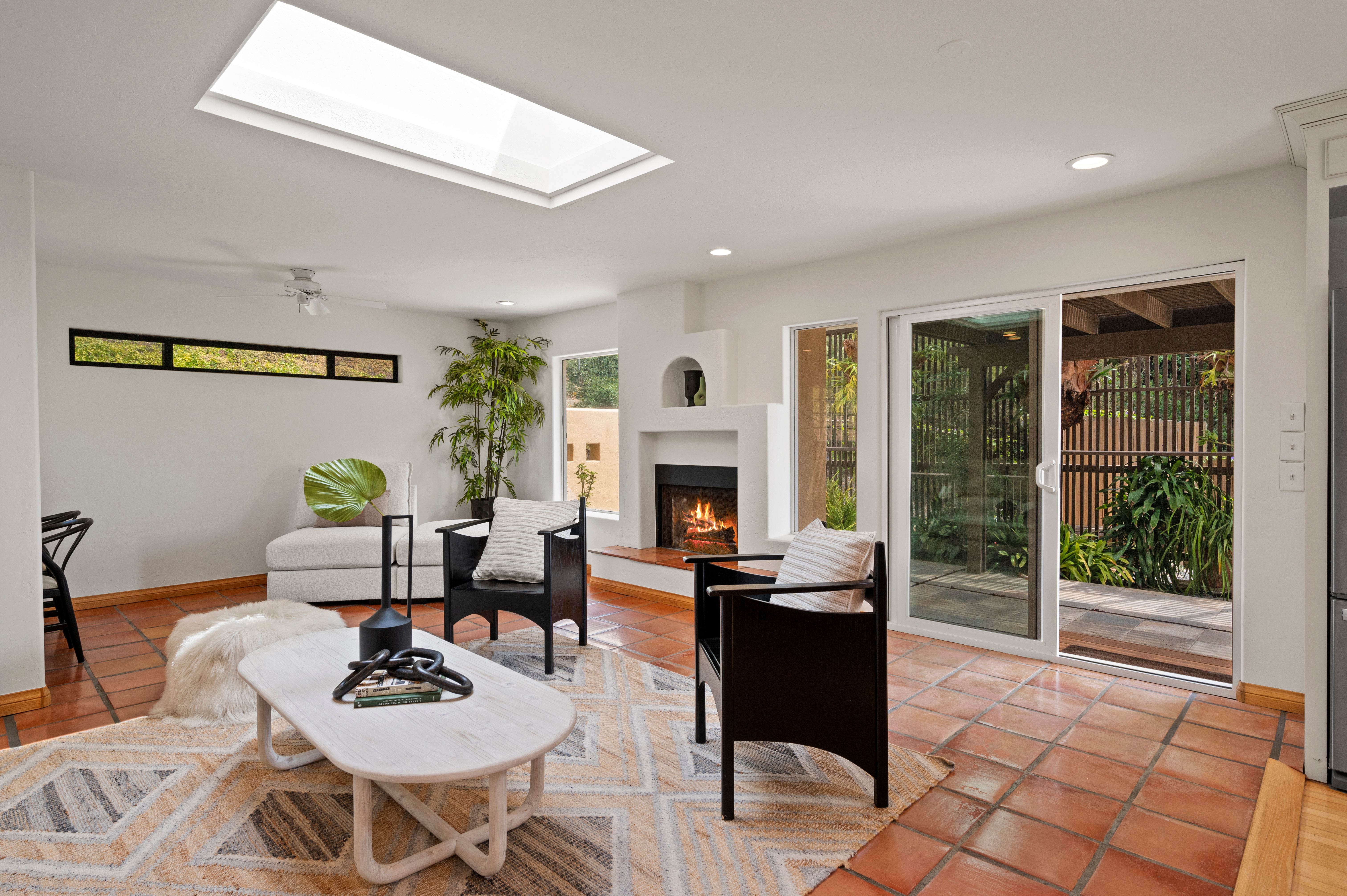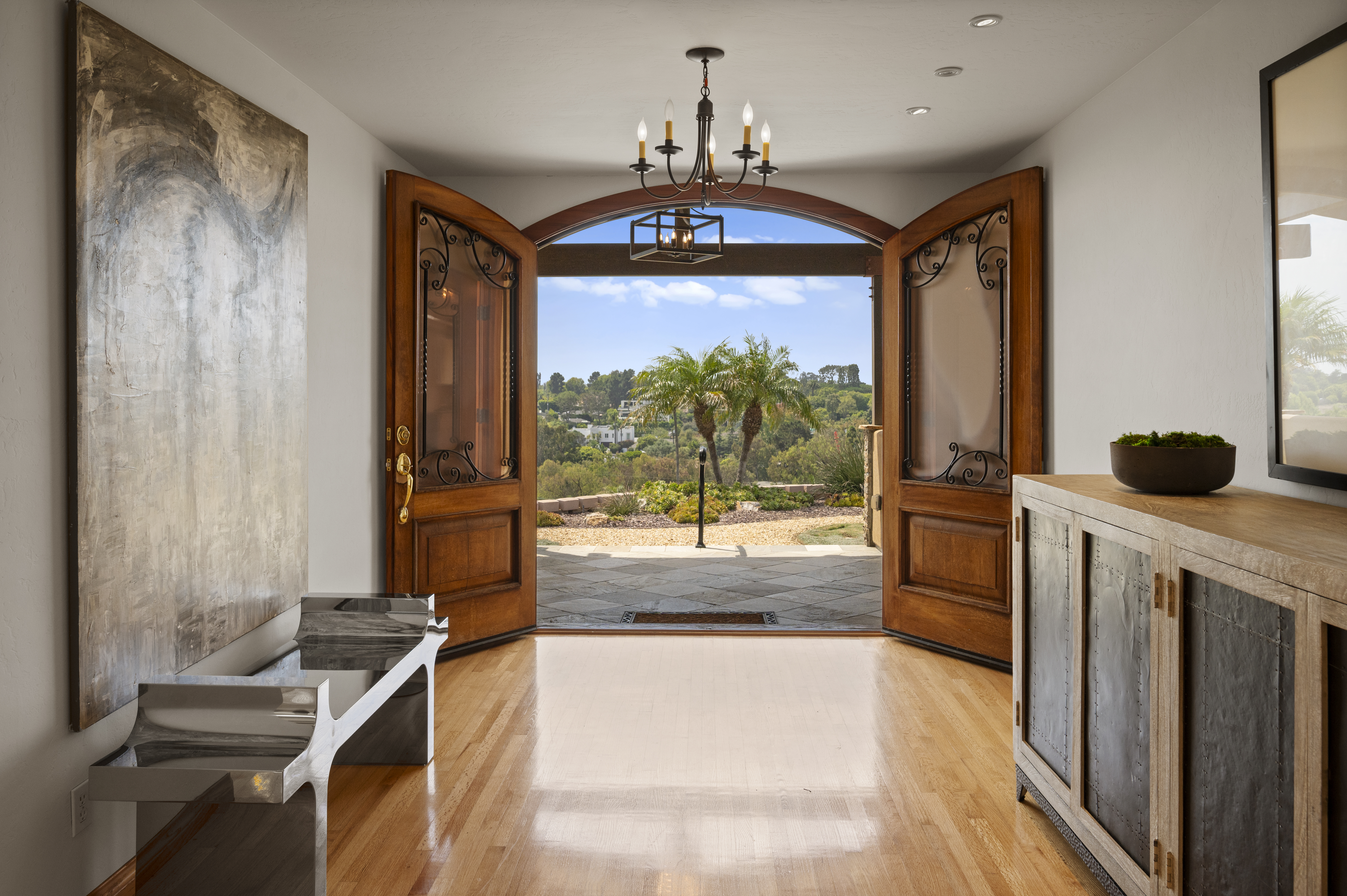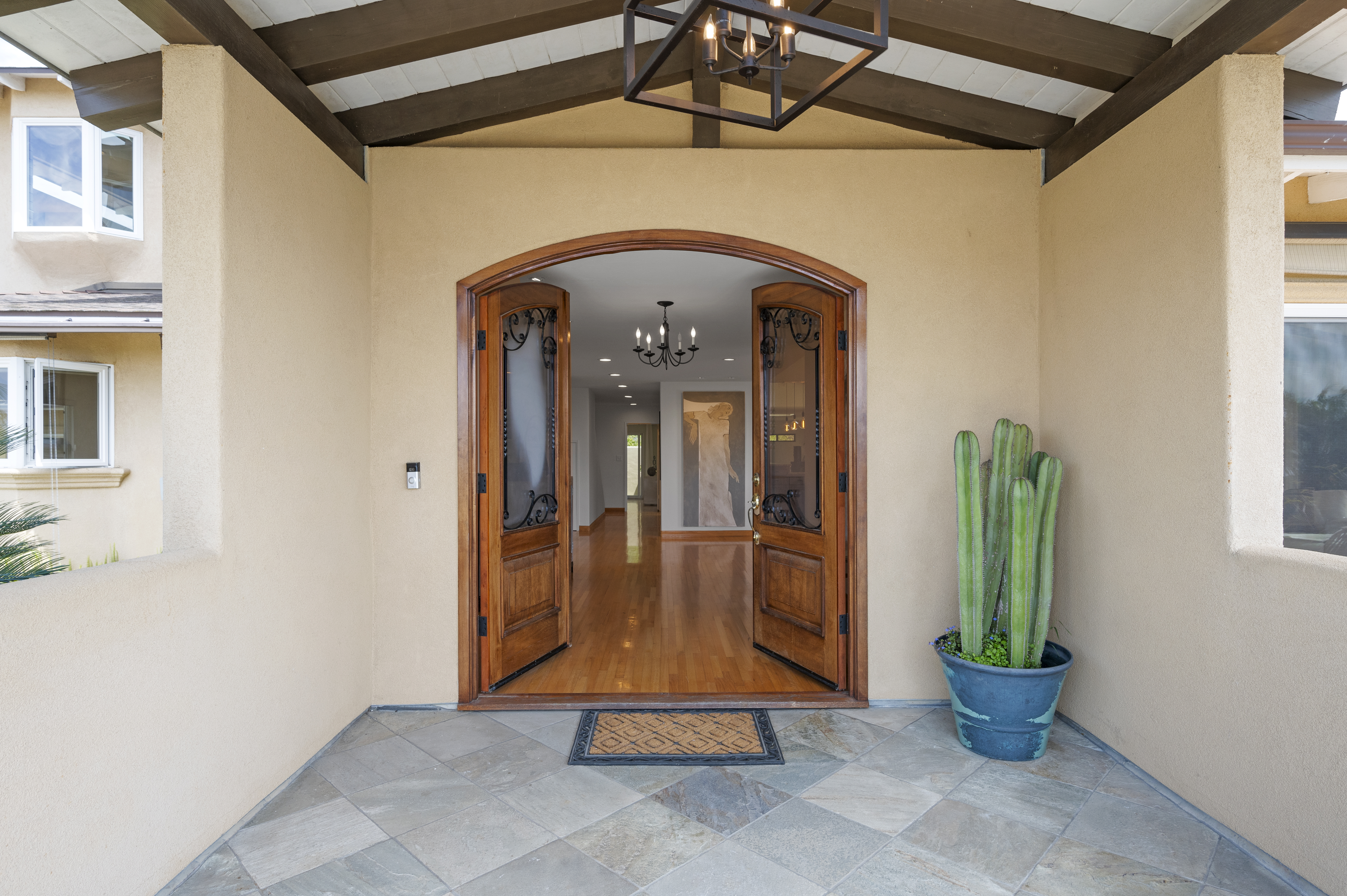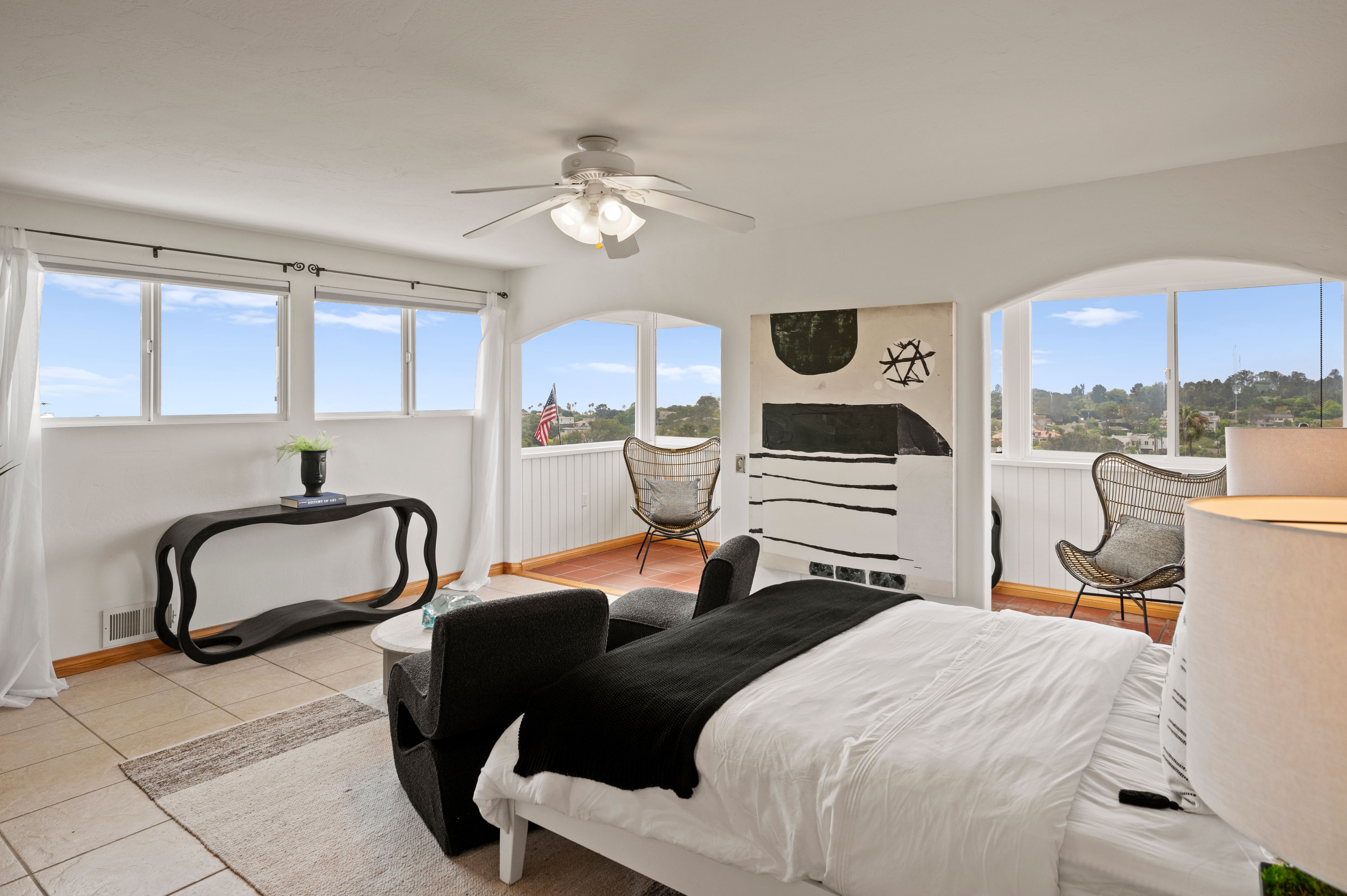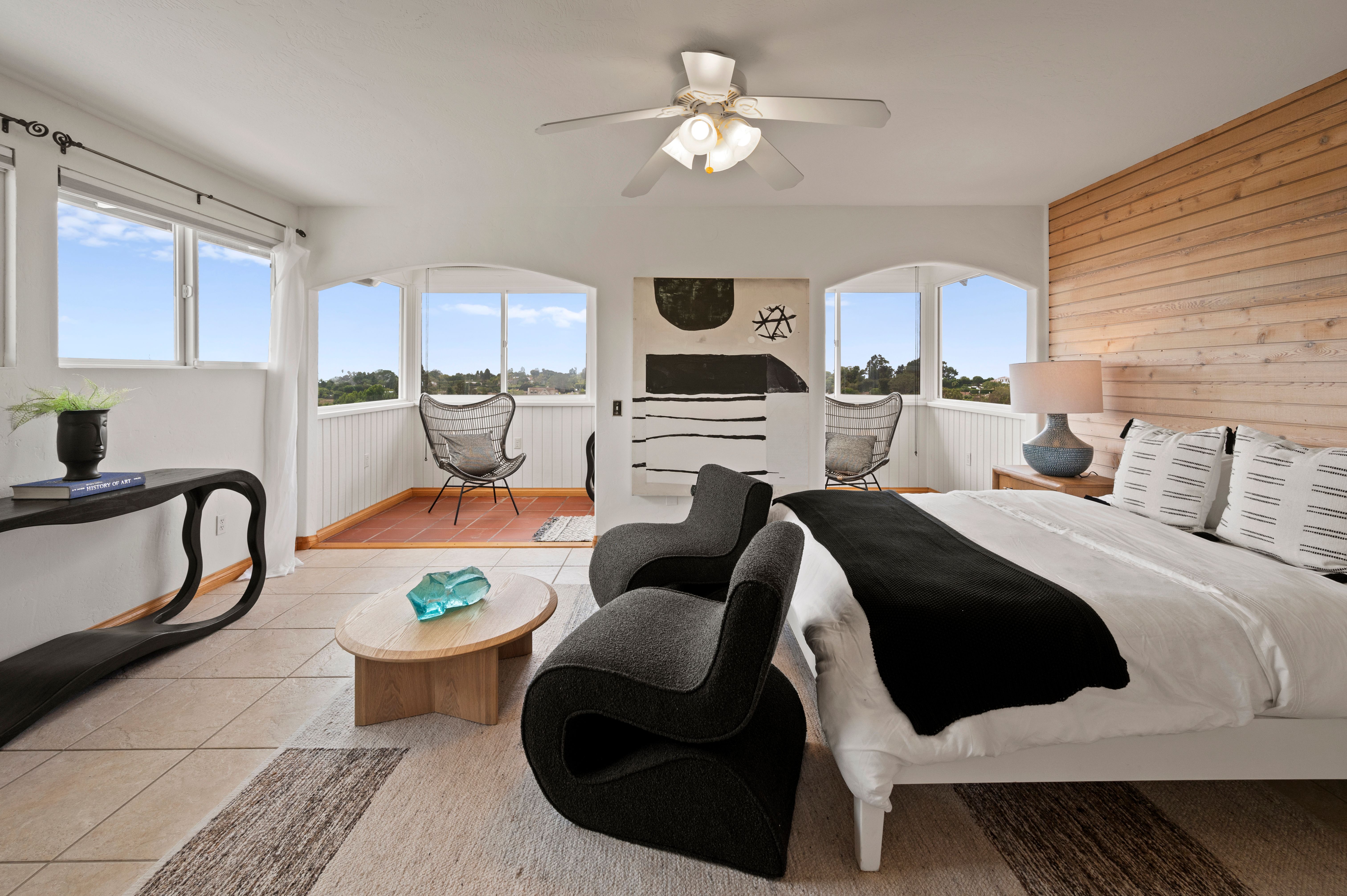 EXQUISITE PRIVATE HILLTOP RETREAT WITH PANORAMIC OCEAN VIEW! This custom-built Muirlands Crest estate offers spectacular coastline and lush canyon views from nearly every window of the home as well as from its expansive private deck. Perfectly situated on a huge 21,000 sf lot at the end of an exclusive five-home private drive, this property is on the market for the first time in 57 years. This open-concept home features formal entry, plenty of oversized windows and sliders, soaring ceilings, gleaming hardwood floors, custom built-ins in each of the generous-sized bedrooms, and a gorgeous chef's kitchen. Cozy up in front of the kiva-style gas FP in the adjacent family room. Step outside onto the sizable, shaded patio with vertical garden. A flexible floor plan offers two primary suites, one on each level. The light-filled upper suite has a roomy open bath, walk-in closet and dressing room, dedicated WFH space, and a sitting area in the sunroom with views of the sparkling coastline waters all the way to Mexico! The lower half of the property boasts a terraced fruit orchard with 30+ mature trees while palm-drenched, drought-tolerant landscaping surrounds the home. Everything is on automated irrigation for easy maintenance. Other features include fully-owned rooftop solar with net positive output, drinking water filtration system, and 2 car garage with dedicated outlet for your EV as well as W/ D hookups. This freshly painted home is move-in ready or can be reimagined to maximize the potential of this truly unique parcel. This is your opportunity to own a glorious piece of SoCal heaven!
