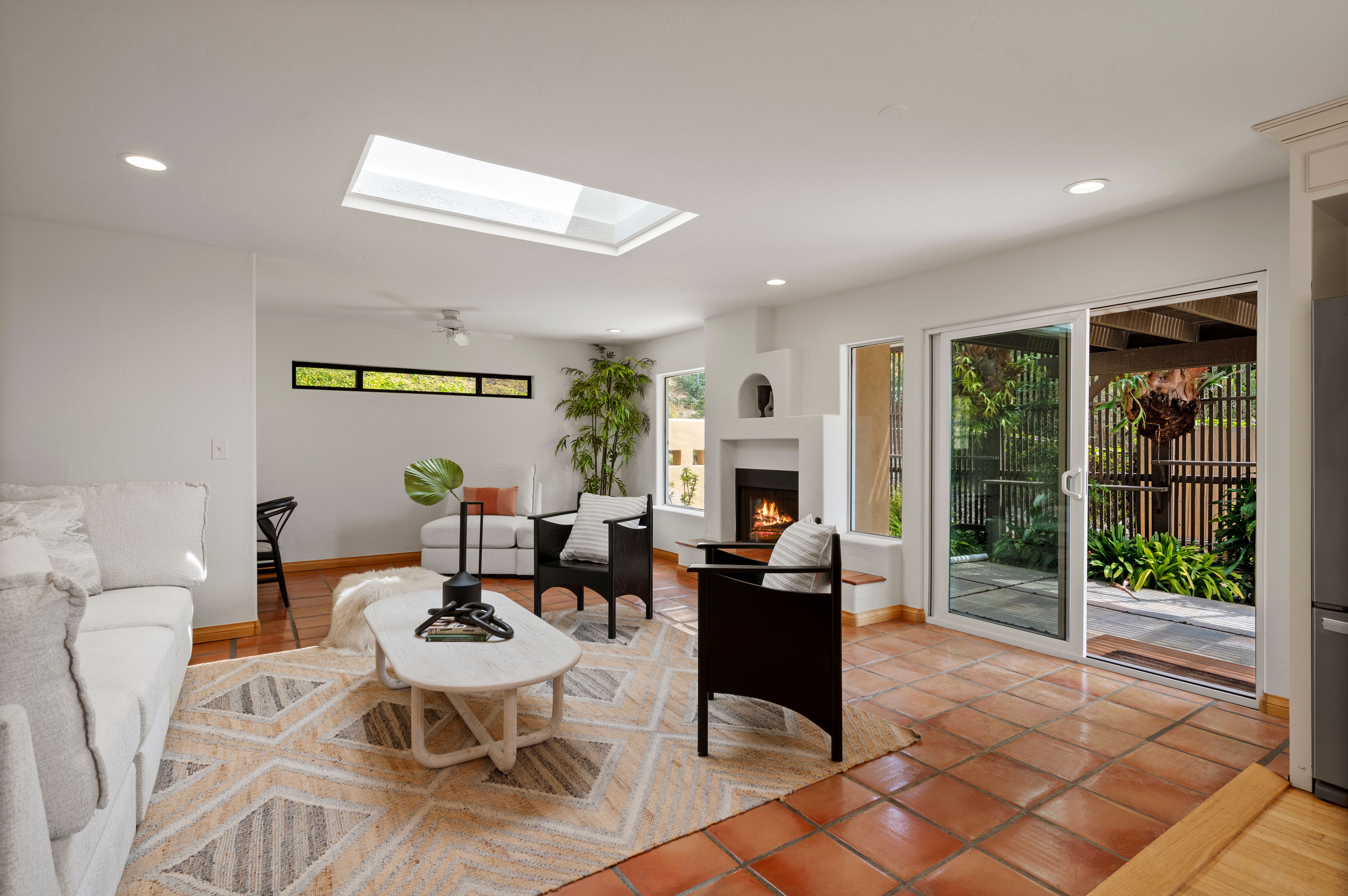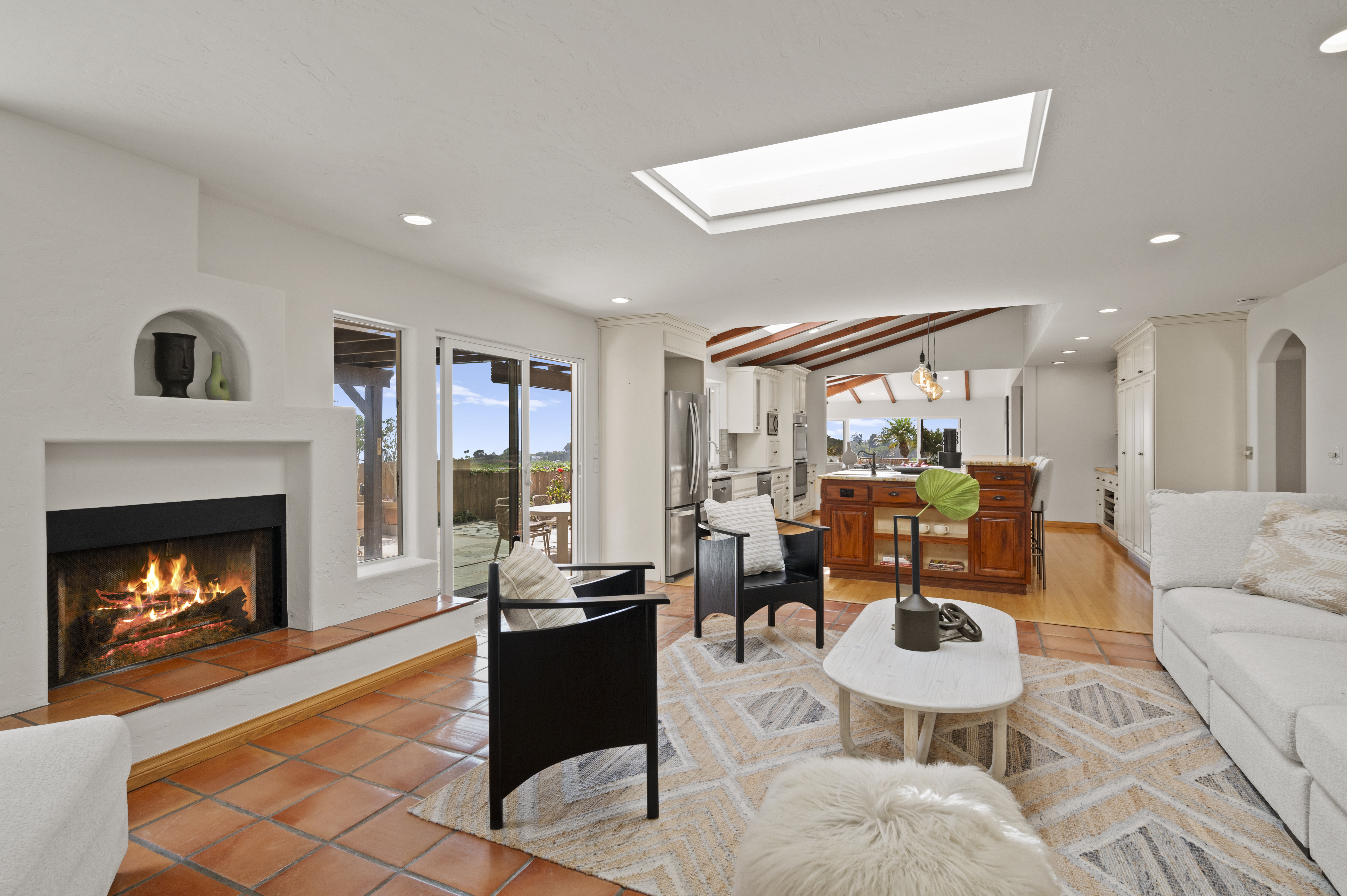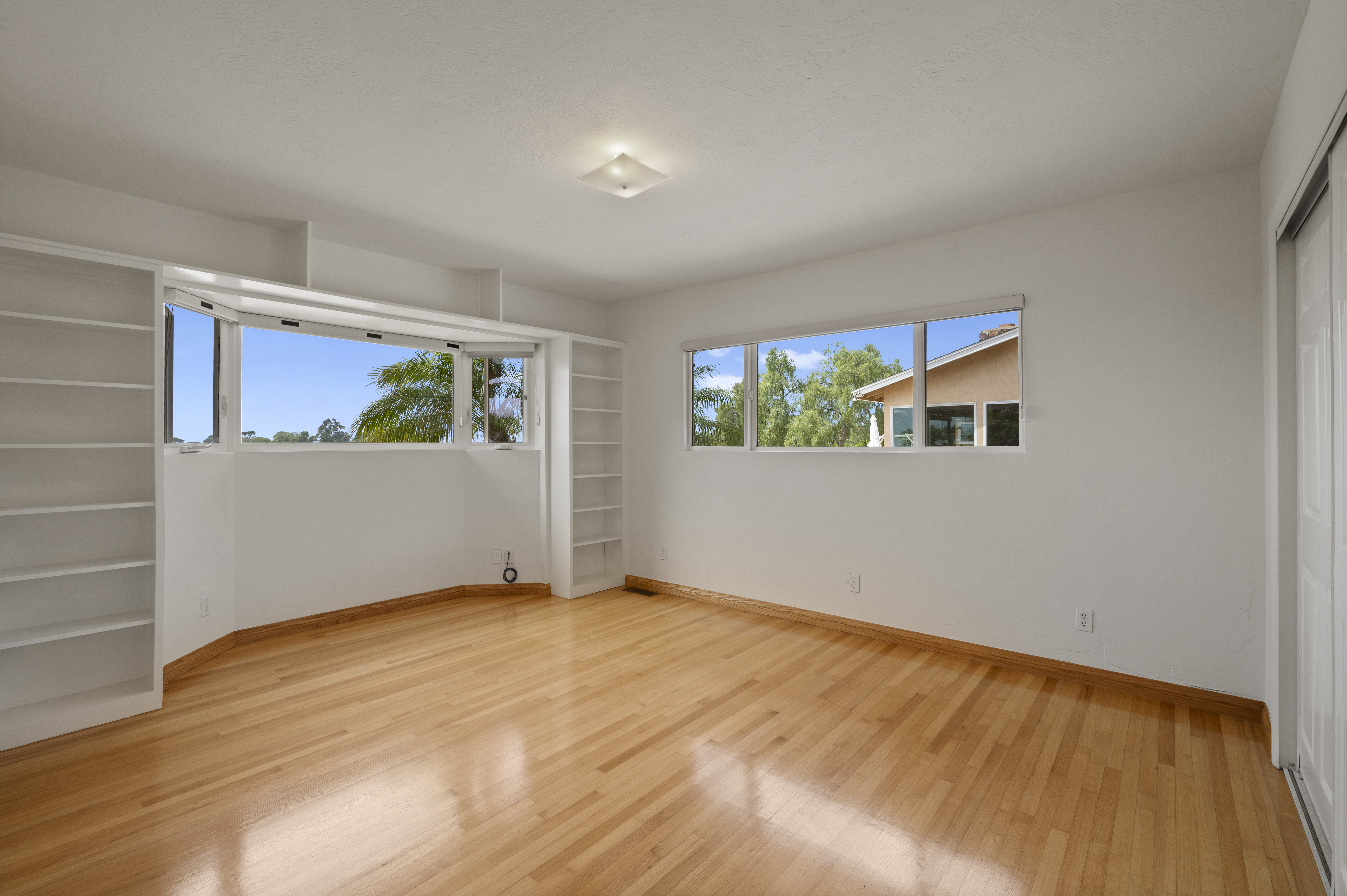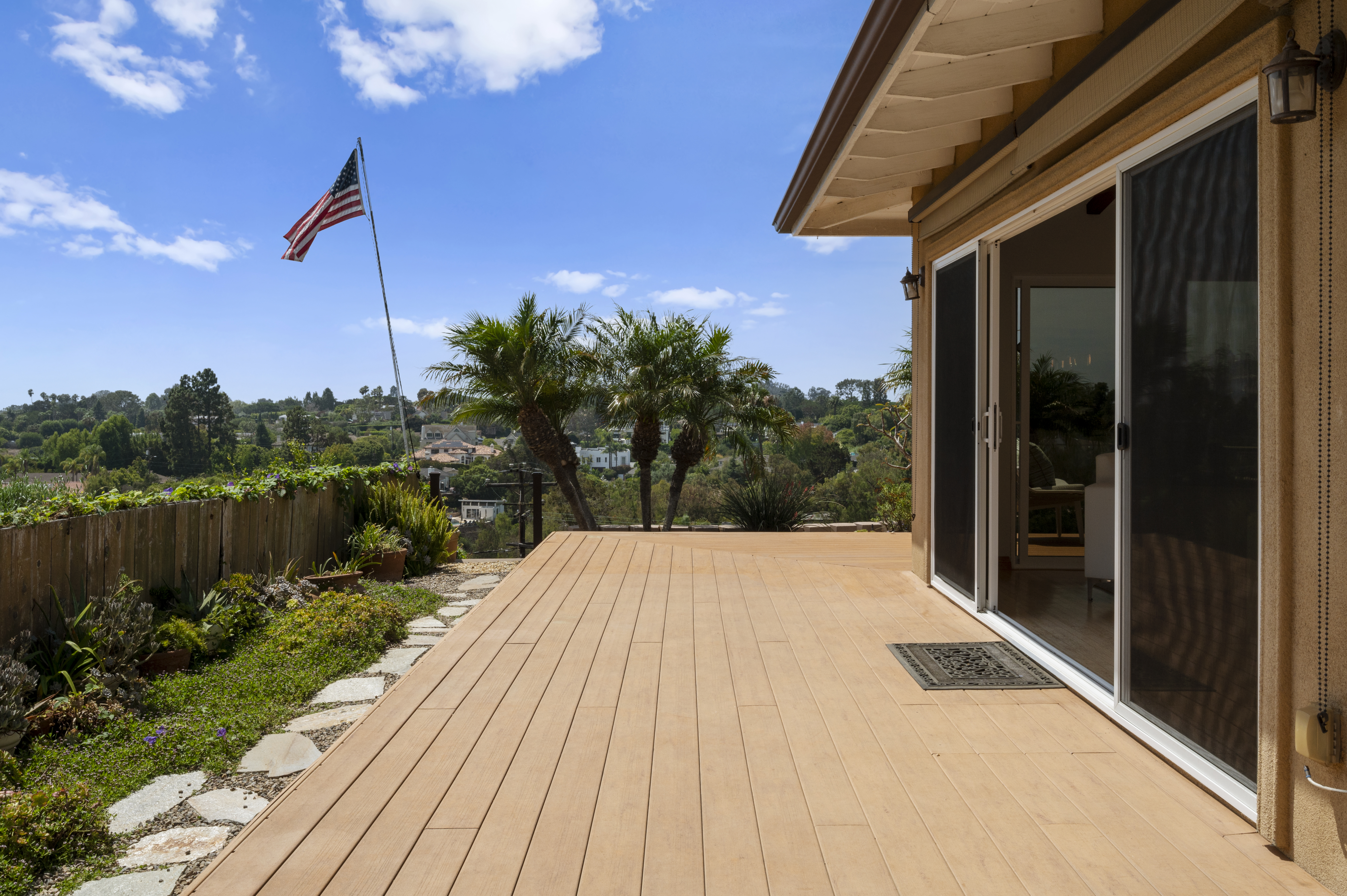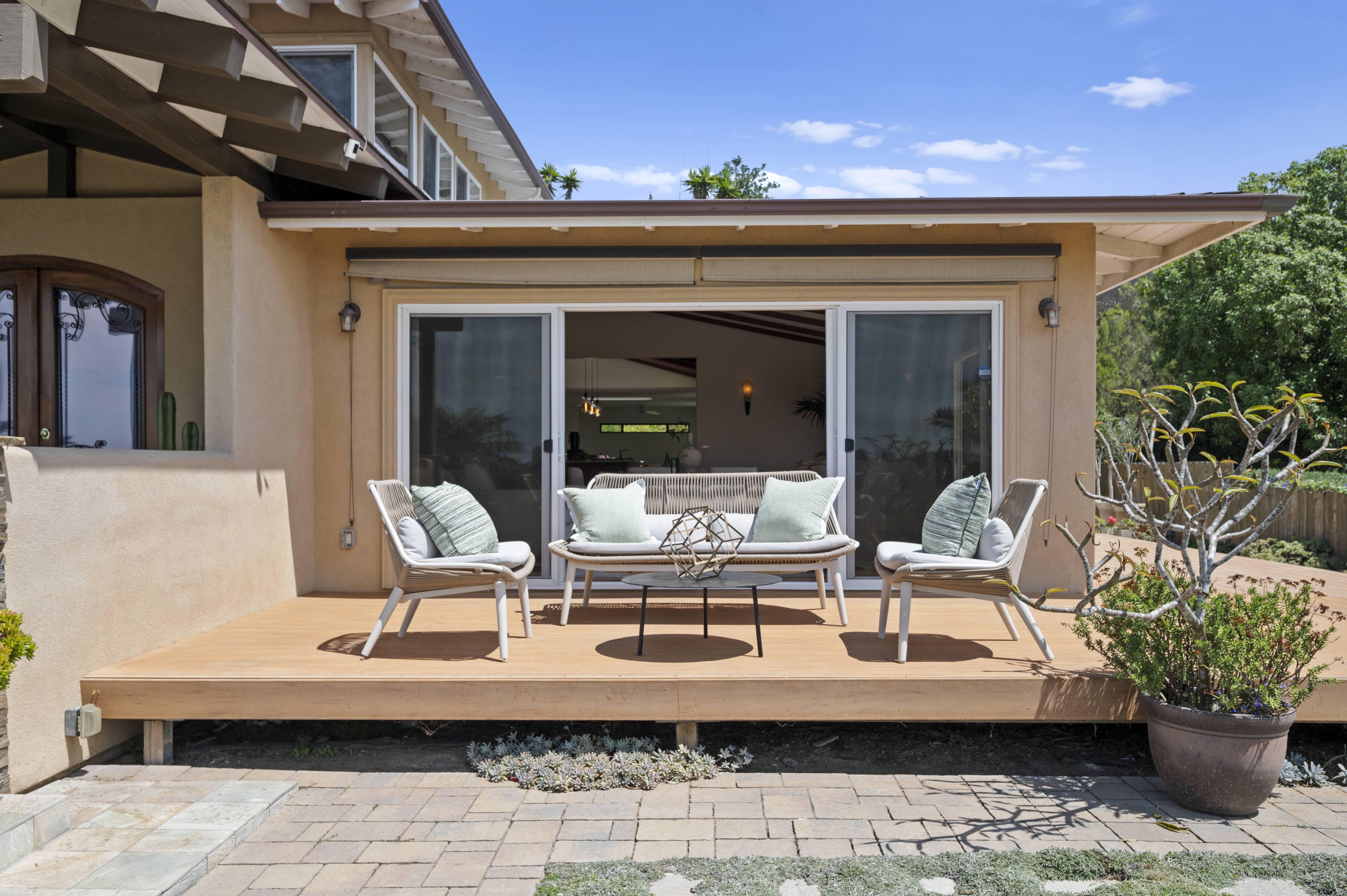 EXQUISITE PRIVATE HILLTOP RETREAT WITH PANORAMIC OCEAN VIEW! This custom-built Muirlands Crest estate offers spectacular coastline and lush canyon views from nearly every window of the home as well as from its expansive private deck. Perfectly situated on a huge 21,000 sf lot at the end of an exclusive five-home private drive, this property is on the market for the first time in 57 years. This open-concept home features formal entry, plenty of oversized windows and sliders, soaring ceilings, gleaming hardwood floors, custom built-ins in each of the generous-sized bedrooms, and a gorgeous chef's kitchen. Cozy up in front of the kiva-style gas FP in the adjacent family room. Step outside onto the sizable, shaded patio with vertical garden. A flexible floor plan offers two primary suites, one on each level. The light-filled upper suite has a roomy open bath, walk-in closet and dressing room, dedicated WFH space, and a sitting area in the sunroom with views of the sparkling coastline waters all the way to Mexico! The lower half of the property boasts a terraced fruit orchard with 30+ mature trees while palm-drenched, drought-tolerant landscaping surrounds the home. Everything is on automated irrigation for easy maintenance. Other features include fully-owned rooftop solar with net positive output, drinking water filtration system, and 2 car garage with dedicated outlet for your EV as well as W/ D hookups. This freshly painted home is move-in ready or can be reimagined to maximize the potential of this truly unique parcel. This is your opportunity to own a glorious piece of SoCal heaven!