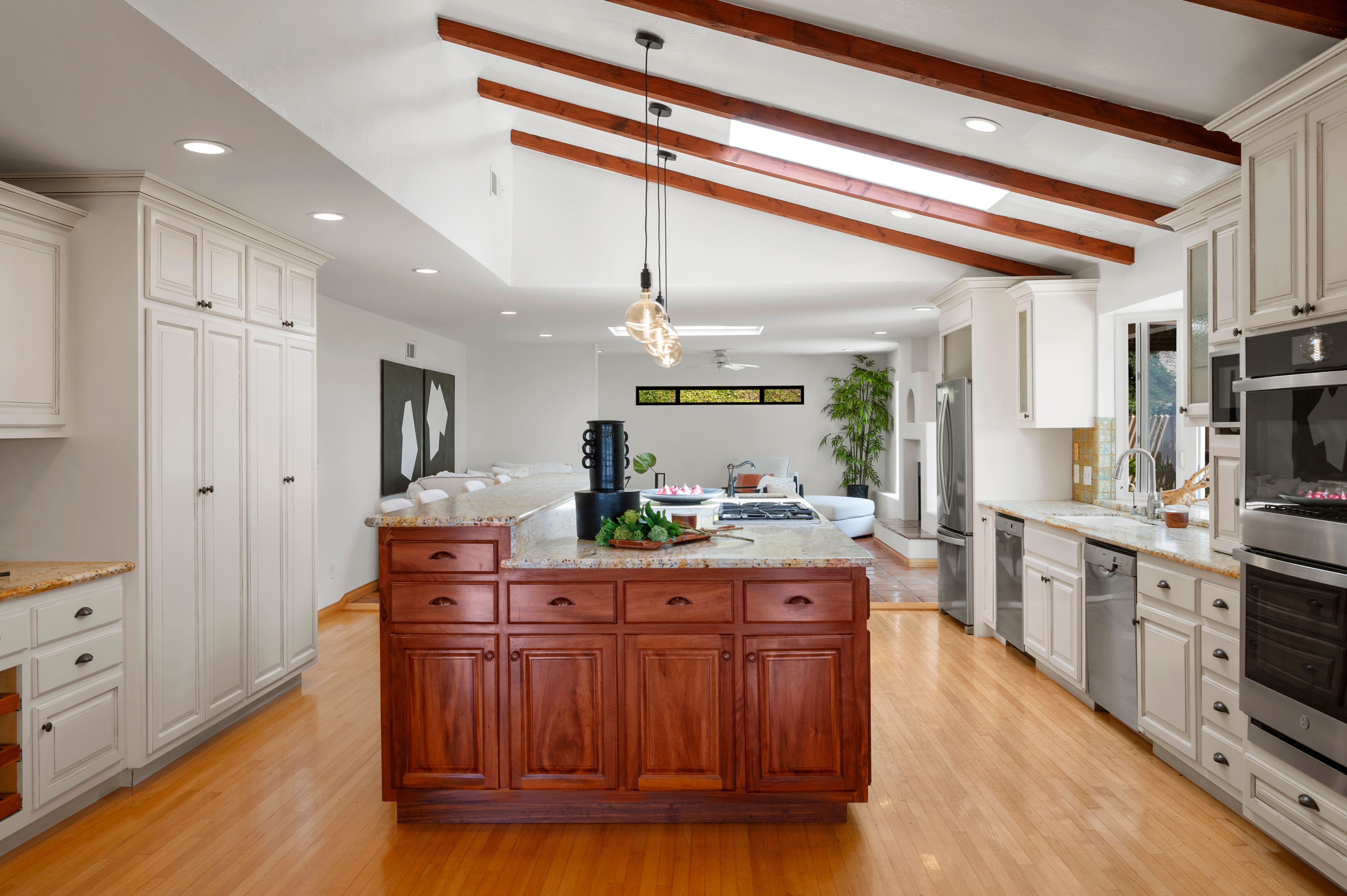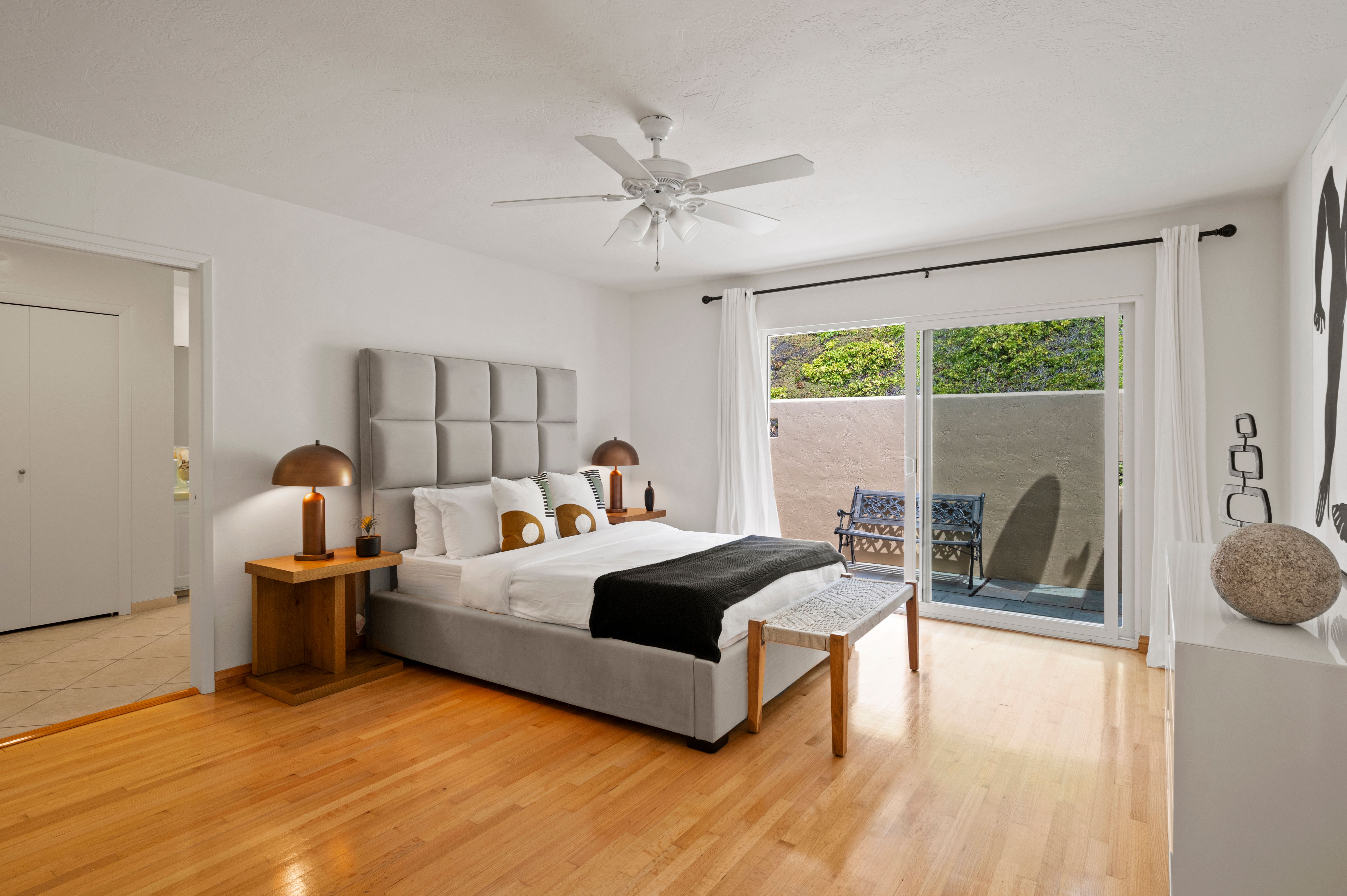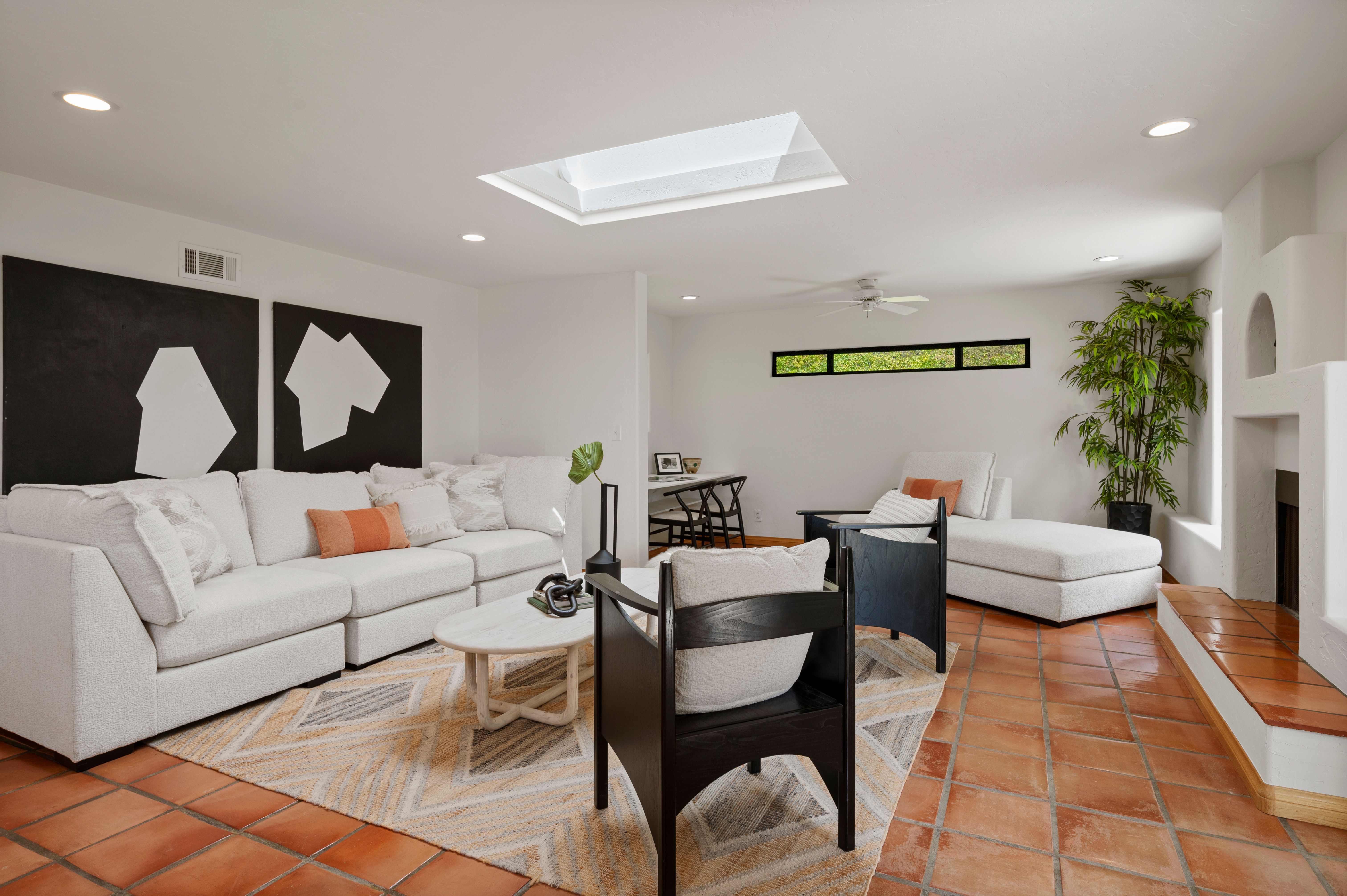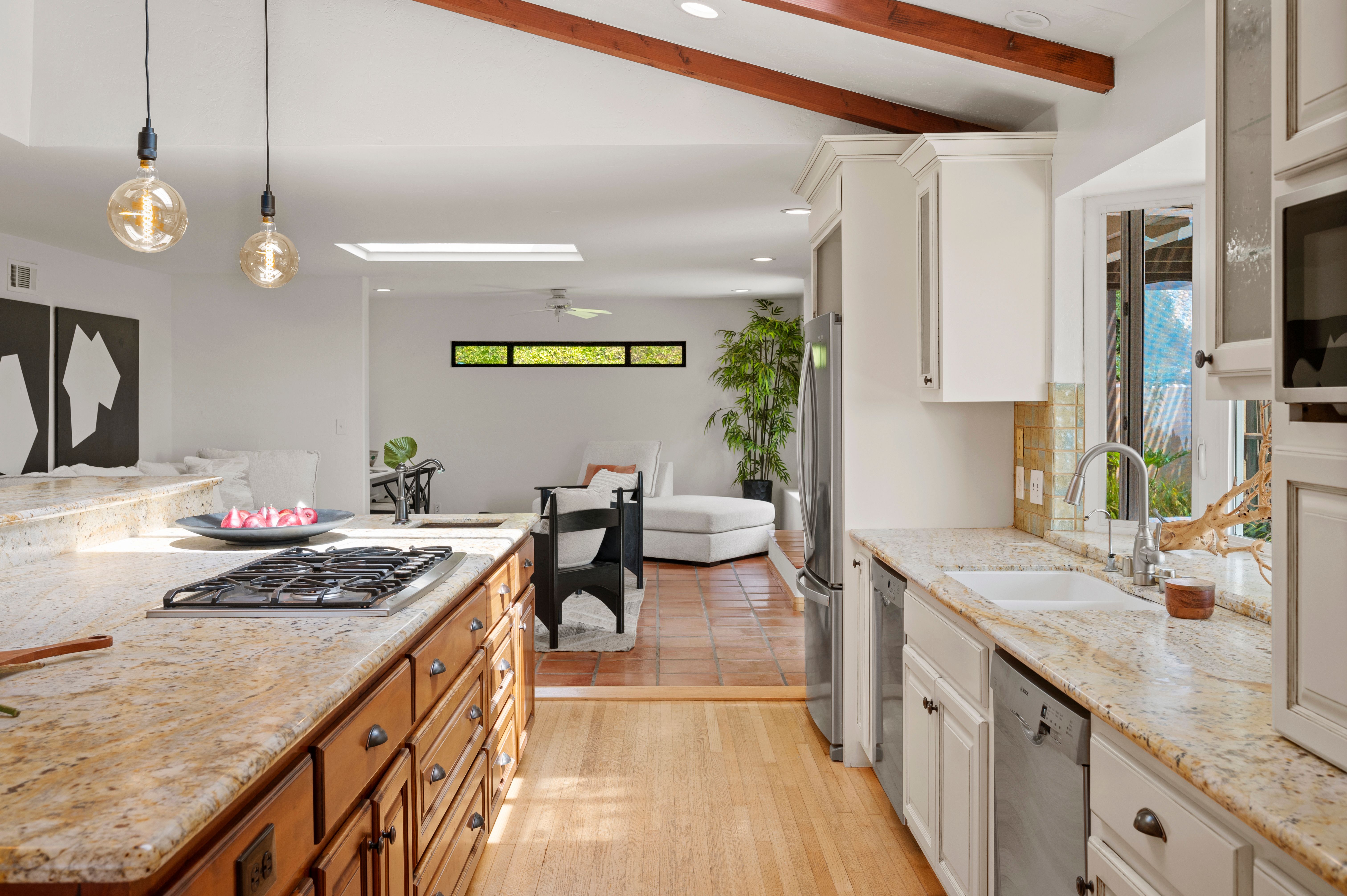 EXQUISITE PRIVATE HILLTOP RETREAT WITH PANORAMIC OCEAN VIEW! This custom-built Muirlands Crest estate offers spectacular coastline and lush canyon views from nearly every window of the home as well as from its expansive private deck. Perfectly situated on a huge 21,000 sf lot at the end of an exclusive five-home private drive, this property is on the market for the first time in 57 years. This open-concept home features formal entry, plenty of oversized windows and sliders, soaring ceilings, gleaming hardwood floors, custom built-ins in each of the generous-sized bedrooms, and a gorgeous chef's kitchen. Cozy up in front of the kiva-style gas FP in the adjacent family room. Step outside onto the sizable, shaded patio with vertical garden. A flexible floor plan offers two primary suites, one on each level. The light-filled upper suite has a roomy open bath, walk-in closet and dressing room, dedicated WFH space, and a sitting area in the sunroom with views of the sparkling coastline waters all the way to Mexico! The lower half of the property boasts a terraced fruit orchard with 30+ mature trees while palm-drenched, drought-tolerant landscaping surrounds the home. Everything is on automated irrigation for easy maintenance. Other features include fully-owned rooftop solar with net positive output, drinking water filtration system, and 2 car garage with dedicated outlet for your EV as well as W/ D hookups. This freshly painted home is move-in ready or can be reimagined to maximize the potential of this truly unique parcel. This is your opportunity to own a glorious piece of SoCal heaven!