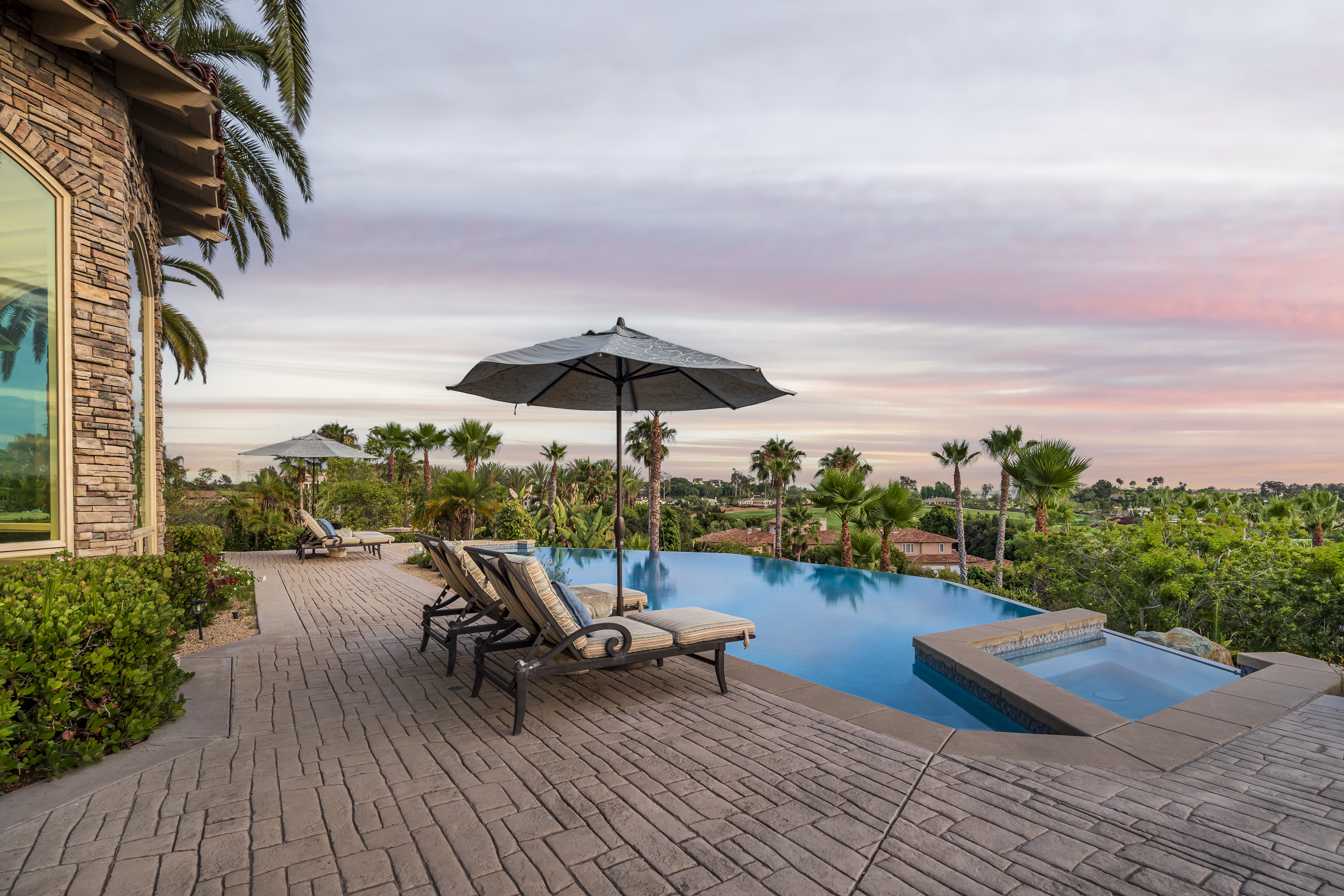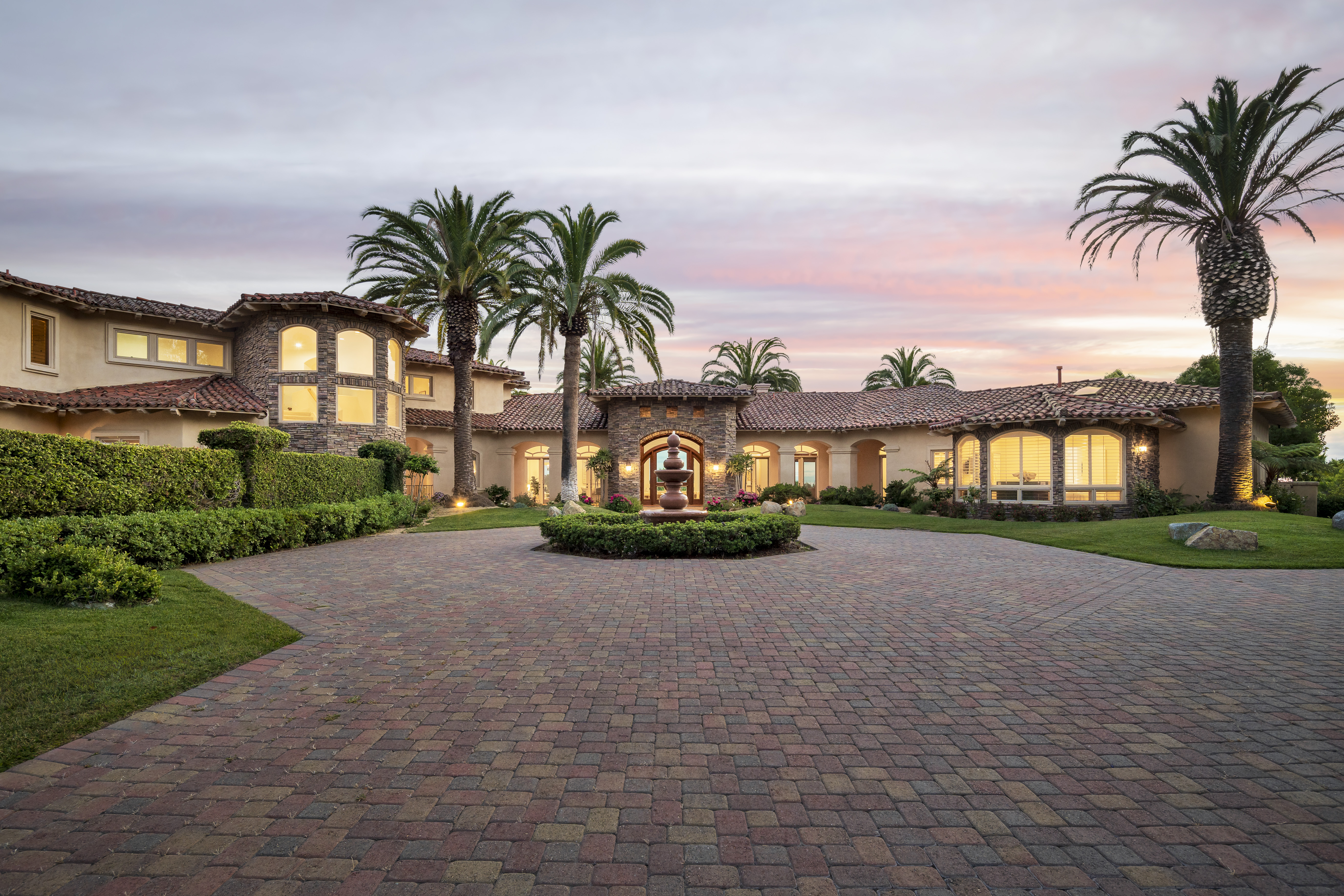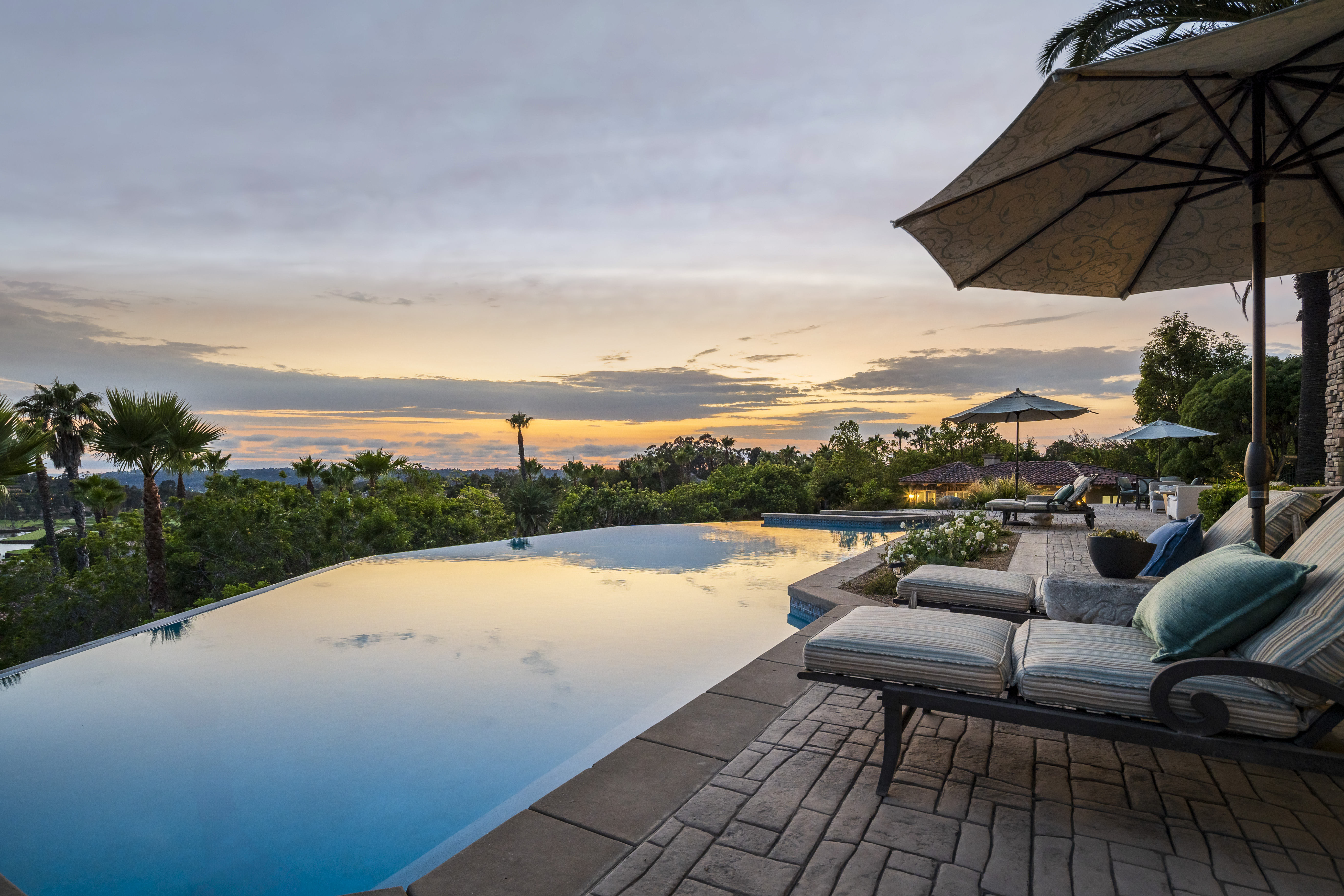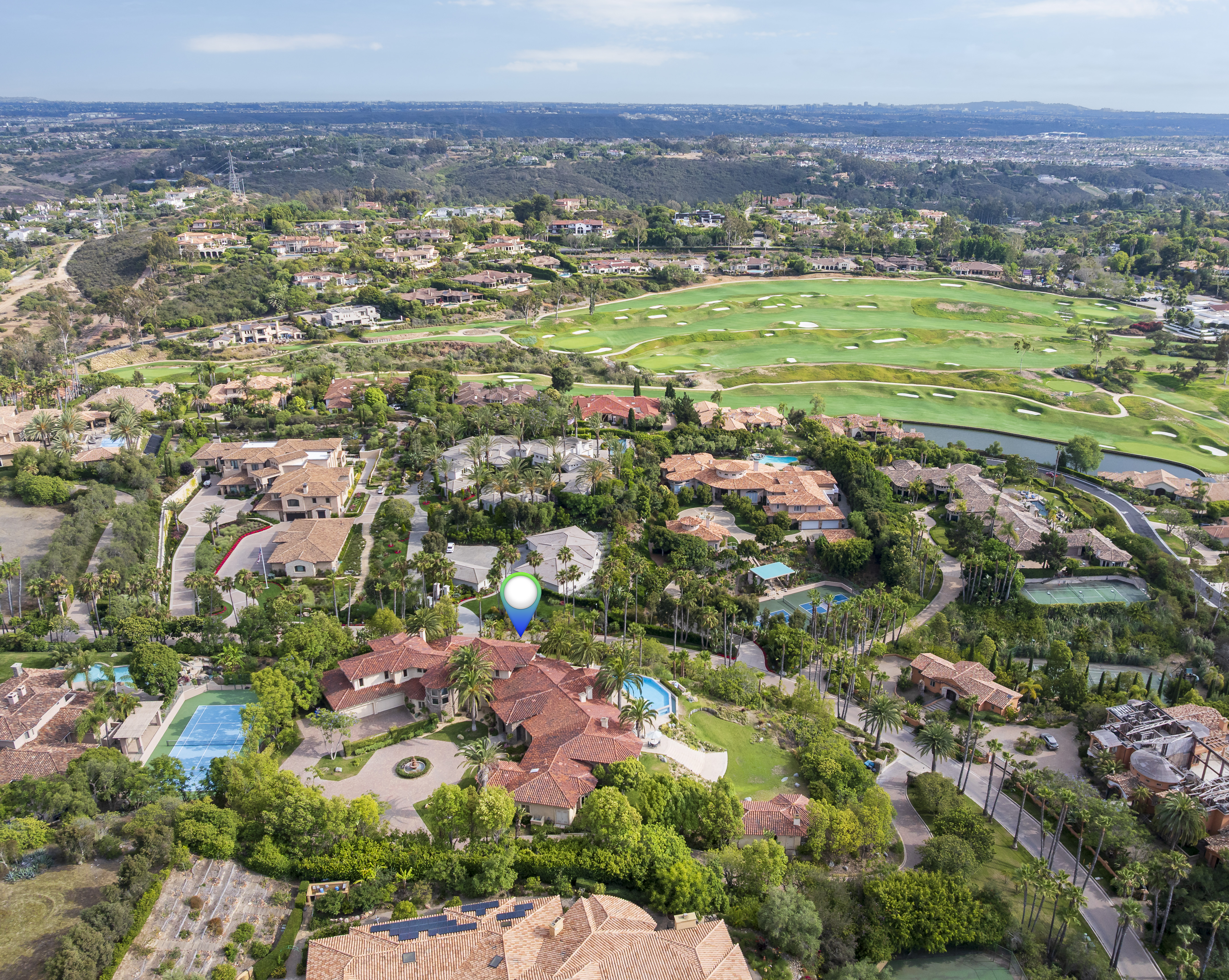 Set on 2.39 acres of lush, tropical grounds, this grand Mediterranean estate offers sweeping views of the RSF Farms Golf Course and beyond. Located within the highly exclusive, guard-gated community of Spyglass, this property is a true sanctuary of privacy, luxury, and timeless elegance. A gated entrance leads to a long, winding driveway culminating in a stately motor court with tranquil fountain. Oversized beveled-glass double doors welcome you into a dramatic foyer that opens to the expansive formal living room, featuring a stately fireplace and panoramic vistas. Adjacent is the formal dining room with seamless access to the resort-style pool and spa, ideal for indoor-outdoor entertaining. The richly appointed wood-paneled office, complete with fireplace, offers an elegant space for work or study. The luxurious primary suite is a private retreat featuring a cozy sitting area with fireplace, an opulent spa-inspired bath, dual dressing rooms, and a versatile adjacent room ideal for a gym, office, or massage space. The recently remodeled chef’s kitchen is a culinary masterpiece, boasting high-end appliances, a spacious island with bar seating, and a casual dining area that flows effortlessly into the expansive family room—accented with custom woodwork, a full bar, and wine cellar. The main level also includes a guest bedroom suite, two powder rooms, a well-equipped laundry room, and direct access to the attached four-car garage. Upstairs, discover four generously sized bedroom suites, most with access to large view balconies, plus a versatile bonus room—perfect as a playroom or lounge. A detached one-bedroom, one-bath guest house offers the same architectural charm and luxurious finishes as the main residence. It features a spacious great room with fireplace, ideal for visitors or extended family stays. Outdoor living is truly elevated with a summer kitchen, outdoor bar, ample seating areas, and a stunning pool and spa surrounded by mature landscaping and manicured grounds. Spyglass Lane features interlocking pavers and an additional gate for enhanced privacy. Perfectly positioned close to major highways, upscale shopping, world-class beaches, and award-winning schools—this is Southern California luxury living at its finest.