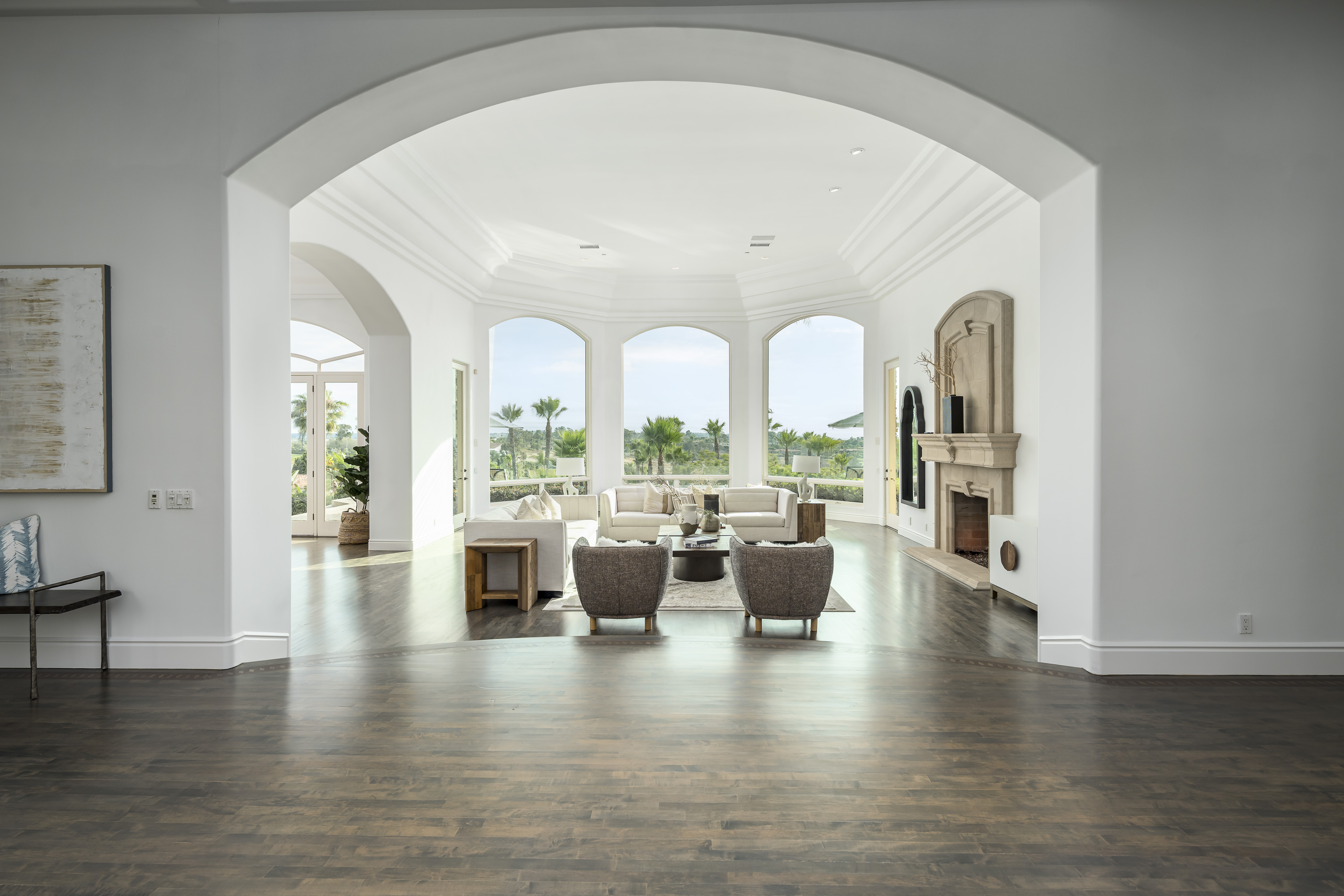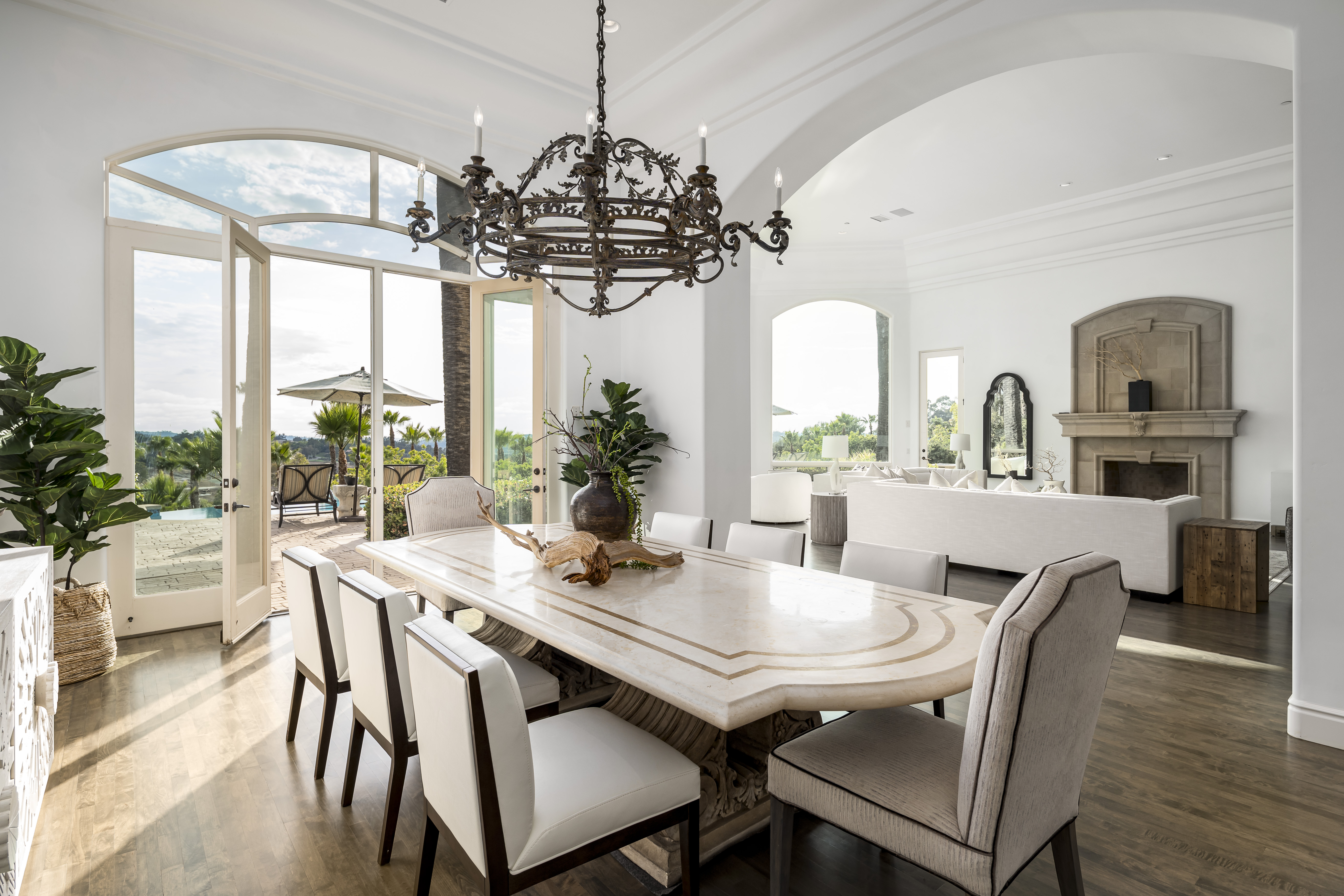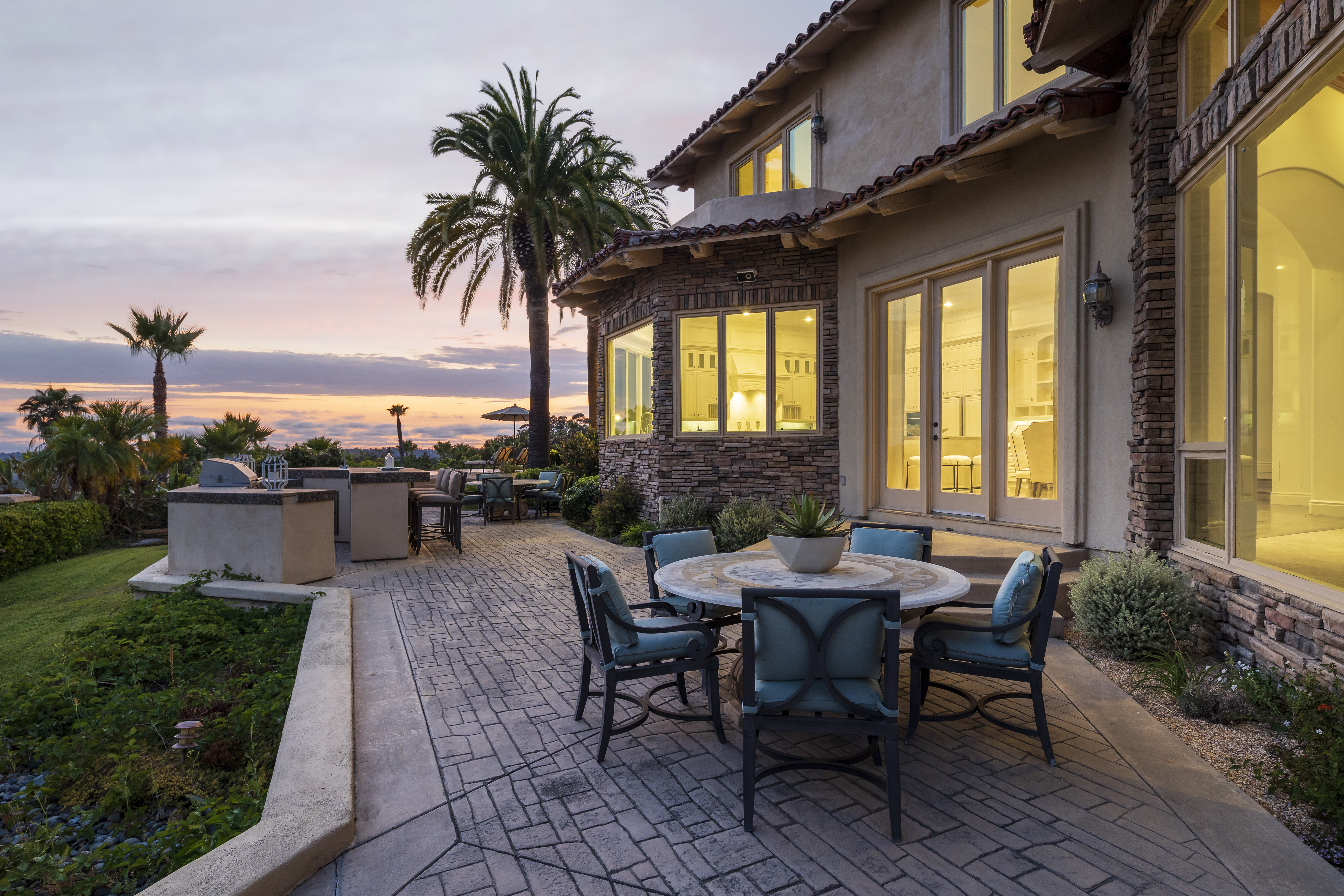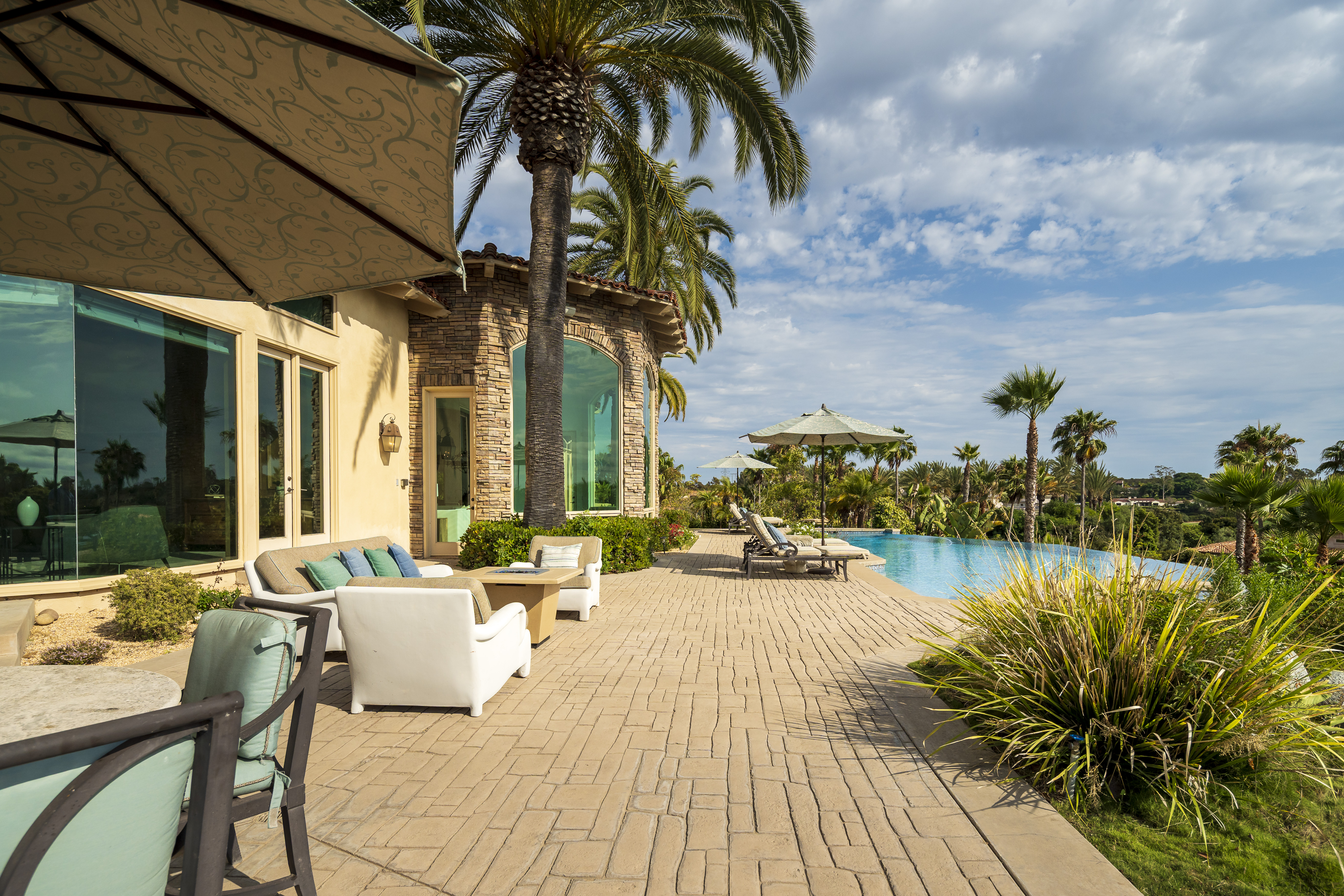 Set on 2.39 acres of lush, tropical grounds, this grand Mediterranean estate offers sweeping views of the RSF Farms Golf Course and beyond. Located within the highly exclusive, guard-gated community of Spyglass, this property is a true sanctuary of privacy, luxury, and timeless elegance. A gated entrance leads to a long, winding driveway culminating in a stately motor court with tranquil fountain. Oversized beveled-glass double doors welcome you into a dramatic foyer that opens to the expansive formal living room, featuring a stately fireplace and panoramic vistas. Adjacent is the formal dining room with seamless access to the resort-style pool and spa, ideal for indoor-outdoor entertaining. The richly appointed wood-paneled office, complete with fireplace, offers an elegant space for work or study. The luxurious primary suite is a private retreat featuring a cozy sitting area with fireplace, an opulent spa-inspired bath, dual dressing rooms, and a versatile adjacent room ideal for a gym, office, or massage space. The recently remodeled chef’s kitchen is a culinary masterpiece, boasting high-end appliances, a spacious island with bar seating, and a casual dining area that flows effortlessly into the expansive family room—accented with custom woodwork, a full bar, and wine cellar. The main level also includes a guest bedroom suite, two powder rooms, a well-equipped laundry room, and direct access to the attached four-car garage. Upstairs, discover four generously sized bedroom suites, most with access to large view balconies, plus a versatile bonus room—perfect as a playroom or lounge. A detached one-bedroom, one-bath guest house offers the same architectural charm and luxurious finishes as the main residence. It features a spacious great room with fireplace, ideal for visitors or extended family stays. Outdoor living is truly elevated with a summer kitchen, outdoor bar, ample seating areas, and a stunning pool and spa surrounded by mature landscaping and manicured grounds. Spyglass Lane features interlocking pavers and an additional gate for enhanced privacy. Perfectly positioned close to major highways, upscale shopping, world-class beaches, and award-winning schools—this is Southern California luxury living at its finest.