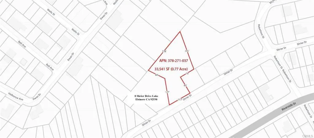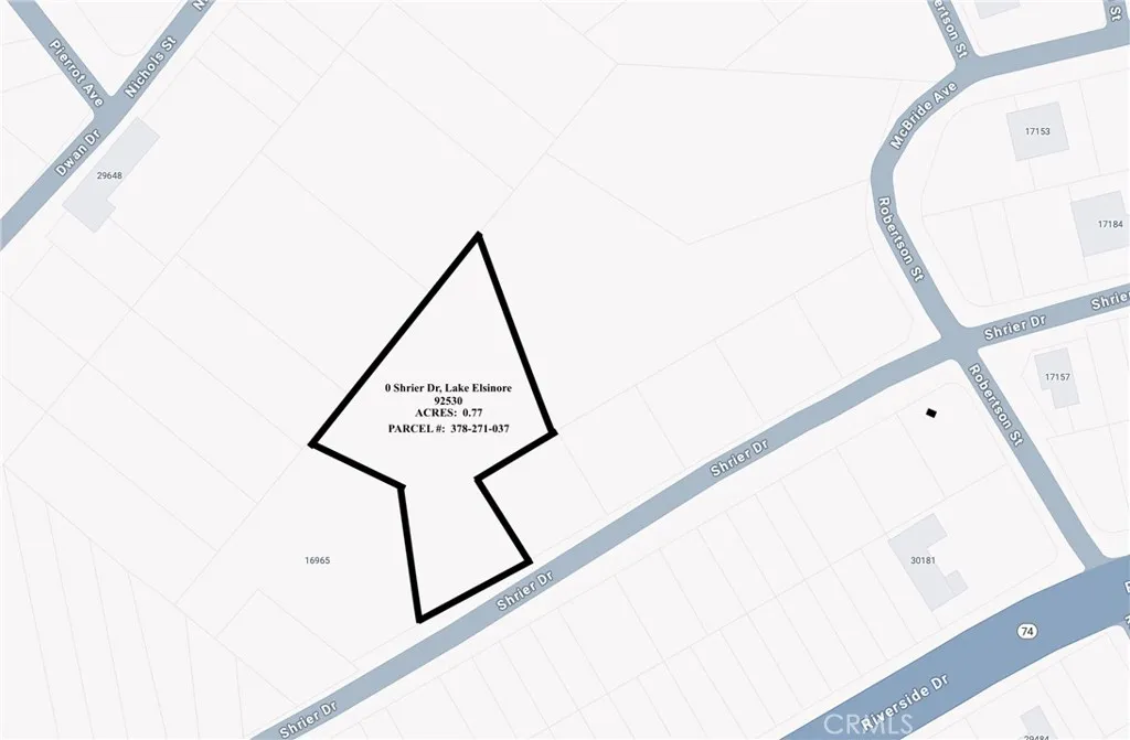 Nestled in the vibrant city of Lake Elsinore, in the heart of Southwest Riverside Count. 0 Shrier Drive offers a rare opportunity to own 33,541 square feet. 0.77 Acres of prime vacant land. Positioned on Robertson Street, this parcel is one of the last remaining large buildable lots in a flourishing family-friendly neighborhood. The property boasts RH (Residential Hillside) zoning, which is perfectly suited for custom-built homes or manufactured residences. Utilities are conveniently accessible in the street, simplifying the development process. Recorded easements along the back and side boundaries still leave ample space for a substantial building site, allowing for versatility and potential. Strategically located off Highway 7, this property provides seamless connectivity to the I-15 freeway, acting as a gateway to the areas numerous amenities and attractions. Situated within a dynamic community experiencing ongoing development, this location offers an ideal setting for both residential and investment purposes. Lake Elsinore, Southern Californias largest natural freshwater lake, is a short distance away, From boating and fishing to water skiing, the lake promises endless fun for families and water sports enthusiasts. A nearby marina off Riverside Drive provides easy access to the lake, ensuring that aquatic adventures are always within reach. Additional recreational options include proximity to a baseball stadium, a motorcycle park, and a local airport. The propertys convenience extends to essential amenities, with schools, churches, and service providers located nearby.