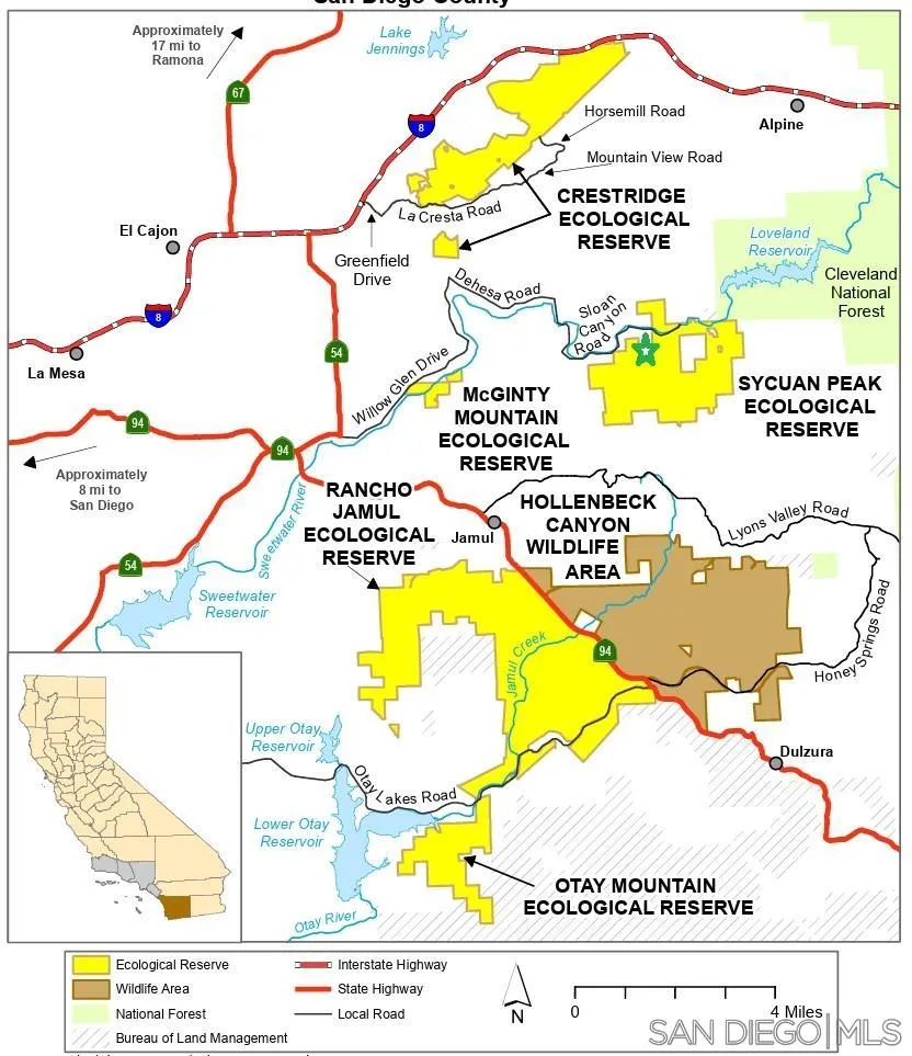85 acres south of Sloane Canyon Rd surrounded by Sycuan Peak Ecological Reserve. Ideal mitigation and/or conservation land with special status species, hermes copper butterfly, coopers hawk and raptor forgaging. Unbuildable, with no legal or practical access. Habitat Assessment available.