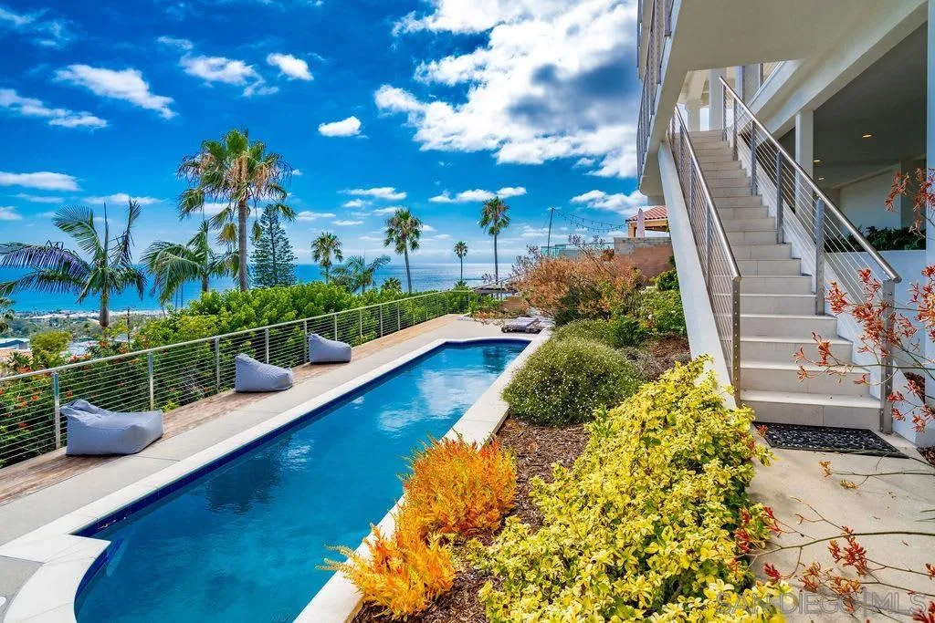 Fully furnished rental – La Jolla Paradise with Ocean Views & Pool Experience the pinnacle of coastal luxury at La Jolla Corona Estates. This multi-level 6BR/6.5BA retreat spans 5,700 sq ft and features panoramic ocean vistas, modern elegance, and resort-style amenities. Enjoy multiple terraces, fire pits, and a sparkling pool surrounded by palms and endless blue skies. The open-concept layout offers two living areas, fine art, a grand piano, and accordion doors that blend indoor and outdoor spaces. The chef’s kitchen boasts stainless appliances, wine fridge, stone island, and bar seating, while the formal dining area seats ten beneath a statement chandelier. Most bedrooms capture ocean views—two queen rooms share a bath upstairs; four ensuite bedrooms downstairs open to a covered terrace. Designed for comfort with Toto bidets, A/C, in-home laundry, and driveway parking. Bask in radiant sunsets and luxury living in one of La Jolla’s most desirable neighborhoods. TOT 629231 | STR-08681L