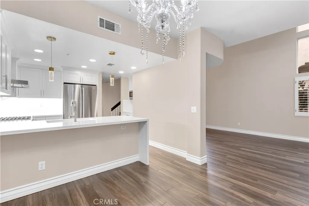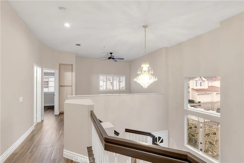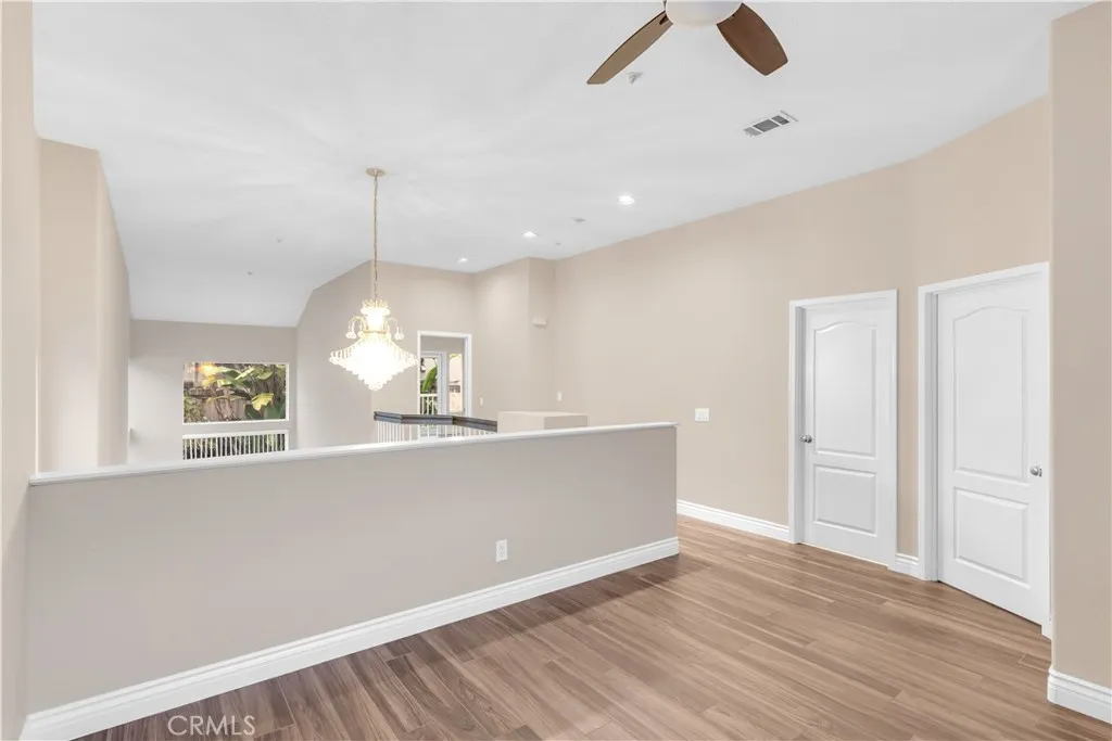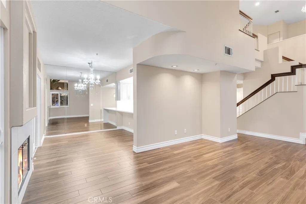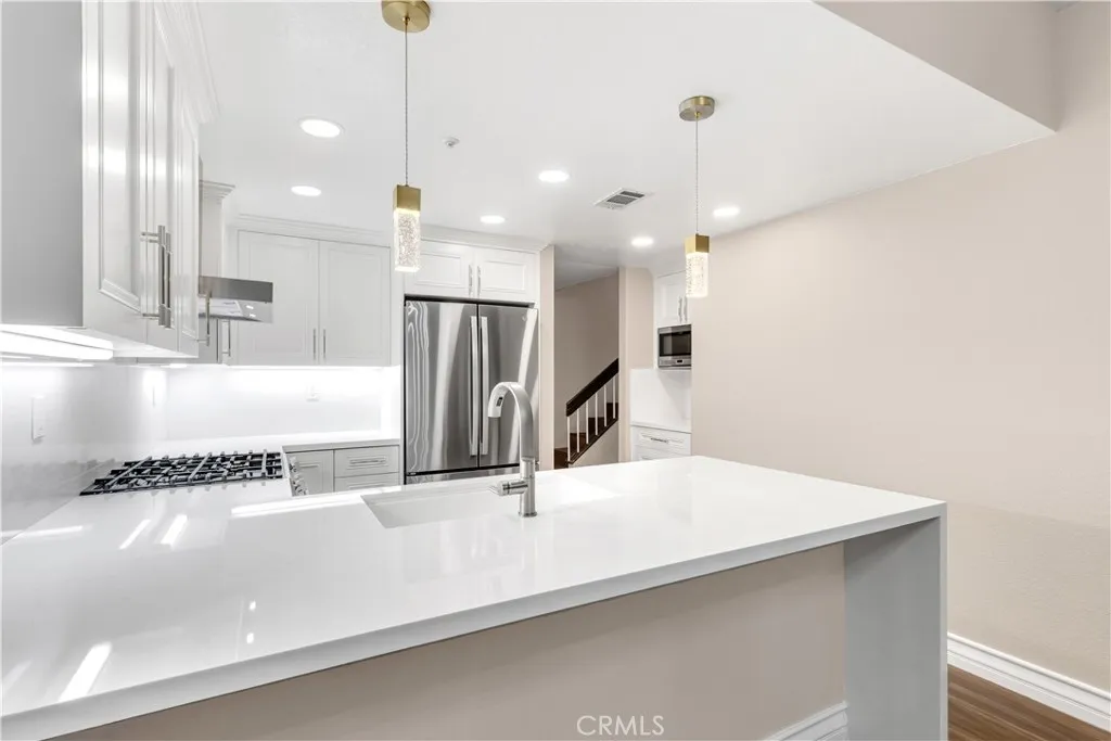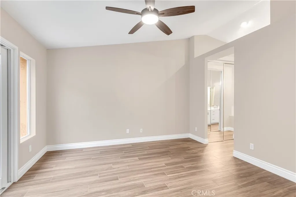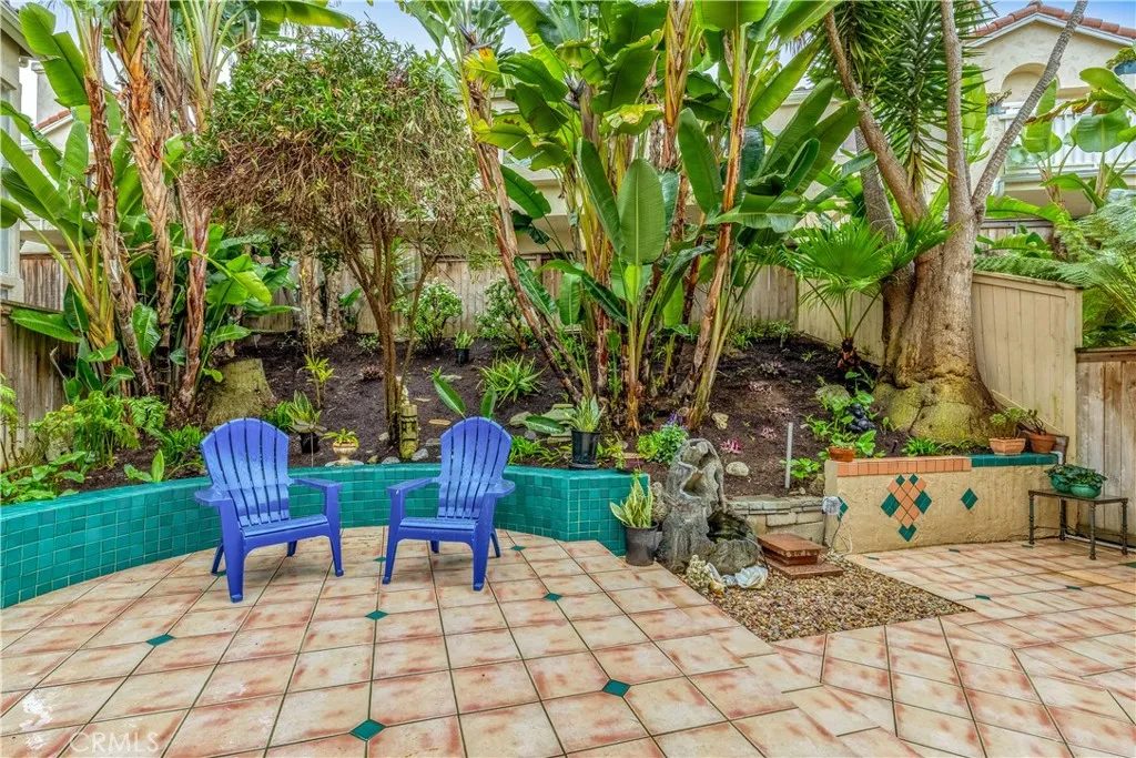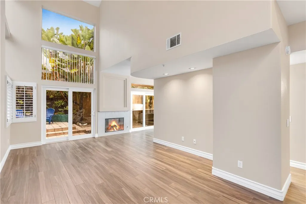 Beautifully upgraded and move in ready end unit condo featuring 1,547 sqft with two bedrooms plus a huge loft, two and a half bathrooms, a two car attached direct access garage, AC and a private spacious wraparound backyard. New interior paint just finished throughout the house in 2026. Twenty foot vaulted ceilings allow plenty of natural light throughout the downstairs living area. Italian porcelain wood style flooring is found throughout the entire house which is very easy to clean and aesthetically stunning. The kitchen was just fully renovated and finished in January 2026 and never been used. This showcase chef's kitchen has quartz countertops with a waterfall edge, custom white cabinetry, a coffee bar area, new pendant lights and a Bosch dishwasher. From the 2026 remodel the Bosch gas stove, GE fridge and a microwave all are brand new and never used. Downstairs is a half bath for guests as well as a laundry closet. Upstairs, you'll find two spacious bedrooms with ceiling fans, two full bathrooms and a large loft. The master bedroom has tile floors, an ensuite master bath, two mirrored closets, a gas fireplace and a balcony overlooking the backyard. The guest bedroom has tile floors and a spacious closet. The large loft also has tile floors. Enjoy the SoCal weather in your backyard oasis with plenty of entertaining space, new landscaping that is maintained by the landlord's gardener. HOA include an ocean view pool & spa. Nearby are hiking trails, LifeTime Fitness, shopping centers and the Rancho San Clemente Sports Park with beach volleyball, basketball courts and a pla