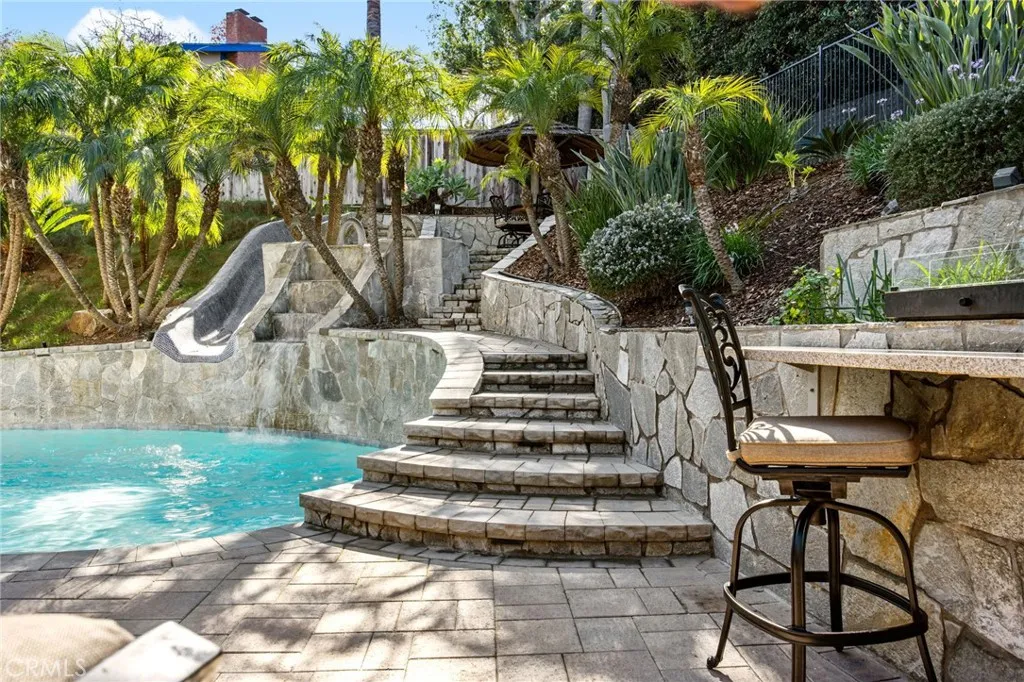 The Bar Was Raised to Top Notch Platinum! This Home is The One, Cul-de-sac Pool Home, 4 Bedrooms, 3 full bathrooms, and 1 outside poolside bathroom with outdoor shower area. Upgraded features throughout include, newer roof, European custom kitchen cabinets and granite countertops, impressive stainless range hood, family room with media room features; surround sound, black-out shades and sound proof built walls. Newer windows, HVAC, 2 water heaters; 1 designated for primary master. A separate spiral staircase entry boasts a library/office space with all built in shelves and desk. Downstairs bedroom has built in desk and queen size murphy bed. Master bedroom and bathroom is extremely spacious, which includes a 2 person tub and vanity area. Side yard has front gate, for easy access to the backyard paradise, you can feel like your on vacation daily; waterfall, slide, palapa bar seating area, firepit, bar seating with countertop, best entertaining setup around. Lush tropical landscaping with the ultimate privacy on this corner lot. You won't find any better location, comfort and privacy like this one! Pride of Ownership shines in each room of this home, approaching 50 years of the family owning, one of kind! With additional bonuses, near by you have top-rated schools, shopping, and dining, this home offers the blend of everything! Finished garage with built in cabinets, ceiling storage racks, attic storage has finished floor and drop down ladder. Home also provides a security system and cameras. Neighborhood has parks, hiking trails, basketball, tennis and pickleball courts. Mus