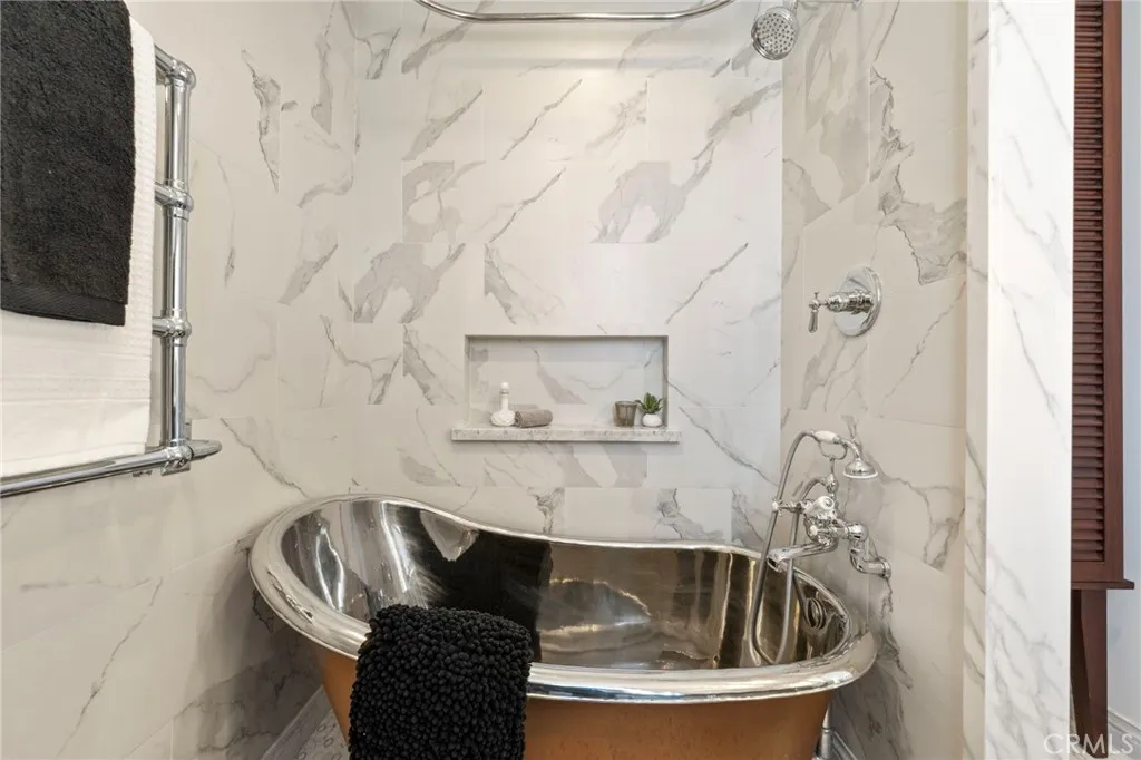 Top-floor corner unit on Naples Island with a private balcony and treetop views, offering a rare blend of privacy, natural light, and coastal living. Nestled in one of Long Beachs most sought-after waterfront communities, this thoughtfully curated residence has been meticulously updated with quality finishes and attention to detail throughout. The custom kitchen (2018) features teak countertops, mahogany shelving, painted wainscoting, and premium appliances including Sub-Zero refrigeration and a Wolf cooktop with hood. A rare 1930s vintage tile backsplash adds character, while a Philippe Starck pendant provides a modern focal point. Rosewood flooring (2017) runs throughout the home, complemented by Milgard double-pane windows (2020) for enhanced comfort and sound insulation. Custom millwork, including a French walnut glass-front bookcase and added linen storage, brings both functionality and design. Both bathrooms were remodeled in 2019. The guest bath features hand-shaped tile, Kohler fixtures, a Toto eco-friendly toilet, and designer wallpaper. The primary suite offers a spa-like setting with porcelain marble finishes, a custom mahogany vanity, Perrin & Rowe fixtures, and a copper/zinc soaking tub, along with a heated towel bar. The expansive private balcony, accessible from both the living room and primary bedroom, creates a seamless indoor-outdoor flow and is ideal for enjoying the peaceful treetop surroundings. Additional features include central heating and AC, in-unit laundry, and a newer water heater (2019). The building is well-maintained and includes one designate