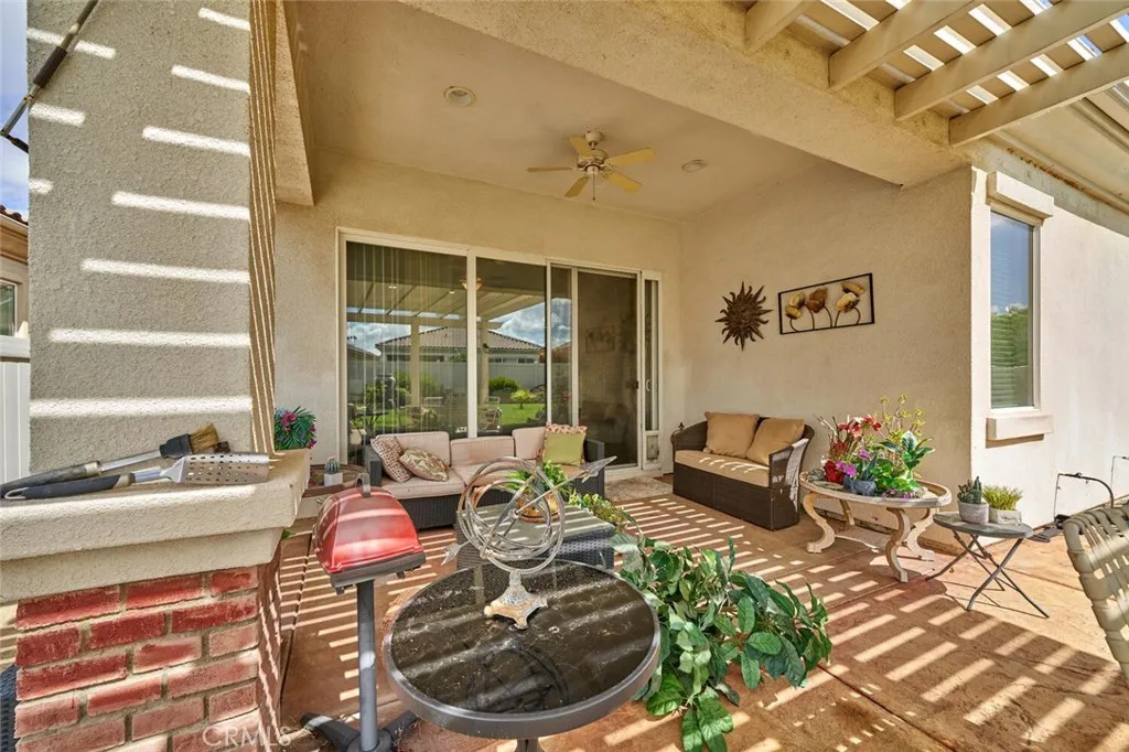 This charming single-story residence presents an exceptional opportunity for an enriched lifestyle within the highly desirable 55+ community of Solera in Beaumont. Perfectly situated on one of Solera's most picturesque streets. The interior features a well-appointed layout, including two comfortable bedrooms, two full bathrooms, and a versatile office/den. Tile and durable laminate flooring extend throughout the main living areas, while the bedrooms provide a cozy retreat with carpeting. At the heart of the home, the kitchen boasts beautifully stained cabinetry, providing ample storage. Step outside to discover a backyard that offers generous space for relaxation, gardening, and entertainment. Internet and basic cable TV are included and paid through the HOA. Home has solar (lease: $166.00 month). Newer air conditioner! Discover the vibrant, resort-style living at Solera. The centerpiece of the community is the clubhouse with a state-of-the -art fitness center, indoor walking tract, tennis and bocce ball courts, a pool and spa, billiards room, library, and versatile meeting/banquet spaces. Residents love the endless social scene: clubs, classes, events, and group activities. Positioned near the I-10, minutes from Cabazon Outlets, Morongo Casino, championship golf and the vibrant energy of Palm Springs. Welcome to the good life!