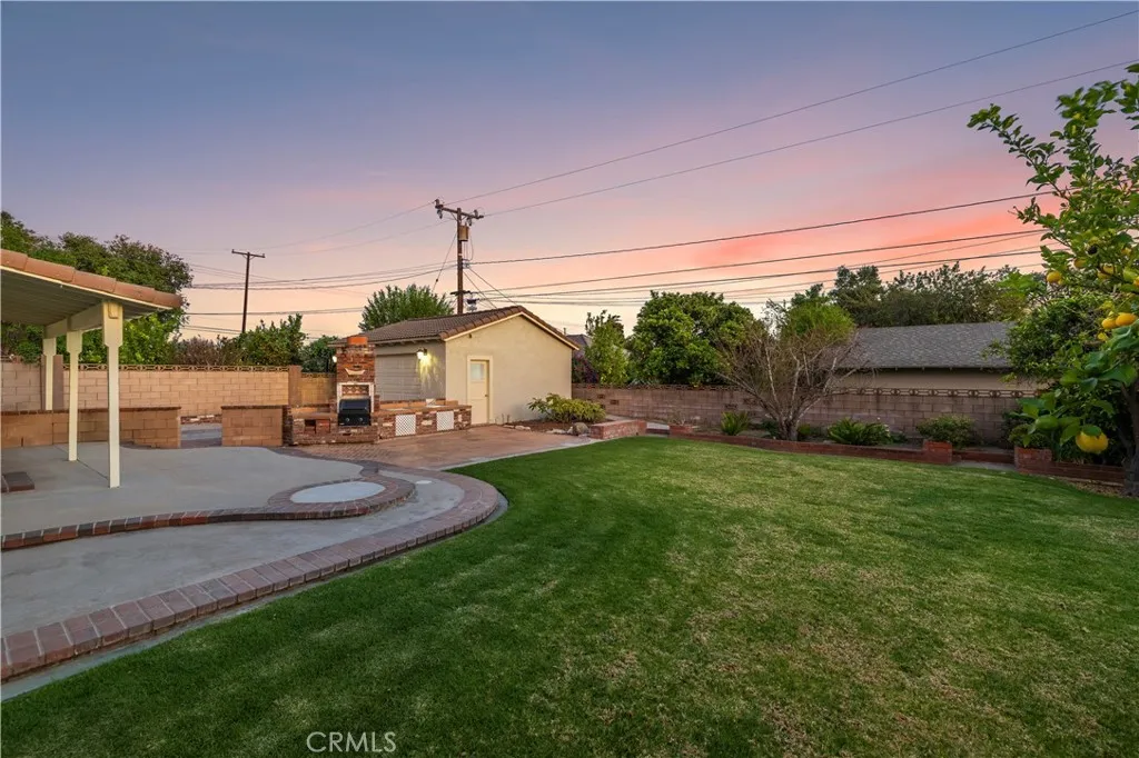 A classic California ranch positioned in a quiet foothill neighborhood in North Glendora. This single-story home presents at the street with a Spanish-style tile roof, brick and wood siding, mature sago palms, and a brick-ribbon driveway leading through a black gated entry to the rear detached two-car garage. The covered brick front porch frames a leaded geometric glass door, opening to wide-plank, wood-patterned tile flooring and crown molding throughout. The living room features refinished original hardwood floors, a floor-to-ceiling white-painted brick fireplace with a thick wood beam mantel, and connects to a glass-enclosed sitting room with three walls of windows framing the front lawn and mountain views. The dining room showcases an exposed wood beam vaulted ceiling, white wainscoting, recessed lighting, and a sliding glass door leading to the rear patio. The kitchen is finished with white cabinetry, quartz countertops, and a subway tile backsplash, and stainless steel appliances including double wall oven, gas cooktop with range hood, dishwasher, a raised tray ceiling with LED lighting, and a peninsula with bar seating. The primary suite offers hardwood floors and an en suite bathroom with a gray shaker double vanity, white quartz countertop, and a frameless glass walk-in shower finished in marble-look subway tile with a mosaic accent border. Additional bedrooms are carpeted and include mirrored closet doors, ceiling fans, and crown molding. The hall bathroom features a vessel sink vanity and a tub and shower combination with a tan tile surround. A dedicated laundry