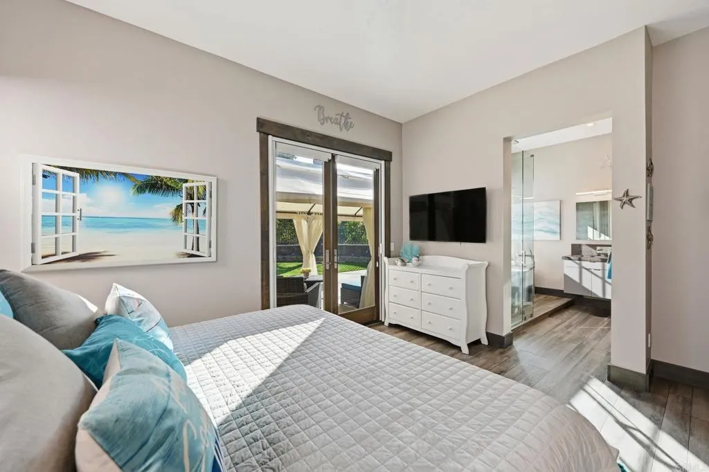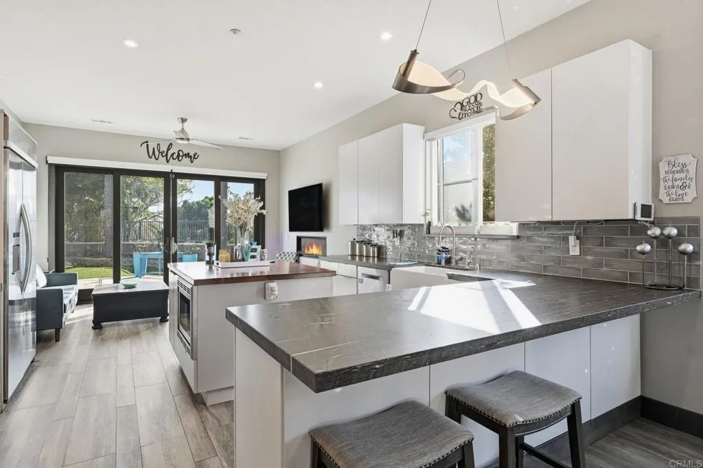 Experience the ultimate coastal California lifestyle in this stunning, fully furnished 3-bedroom, 2-bathroom home, just one mile from the beach. Designed for comfort and style, this home features a spacious primary suite plus two additional queen bedrooms (or a two-bedroom plus office option), all with ample closet space, including a walk-in closet with custom shelving. With high ceilings, ceiling fans, and five large flat screen TVs, the home is both airy and tech-savvy, complete with central air/heat, high-speed WiFi, and an EV charger. Enjoy a private garage gym, one-car garage parking, and an open-concept kitchen with modern stainless steel appliances, making it perfect for both relaxation and remote work. The private backyard oasis, overlooks the Encinitas Ranch Golf Course. Whether youre hosting a barbecue or lounging by one of the multiple fire pits, this space is designed for enjoyment. The backyard also features a covered lounge area, outdoor dining, and plenty of space for yard games and entertainment, all with expansive golf course and sunset views. This modern retreat is the perfect coastal escape, offering a luxurious and comfortable space for families, friends, or remote workers.