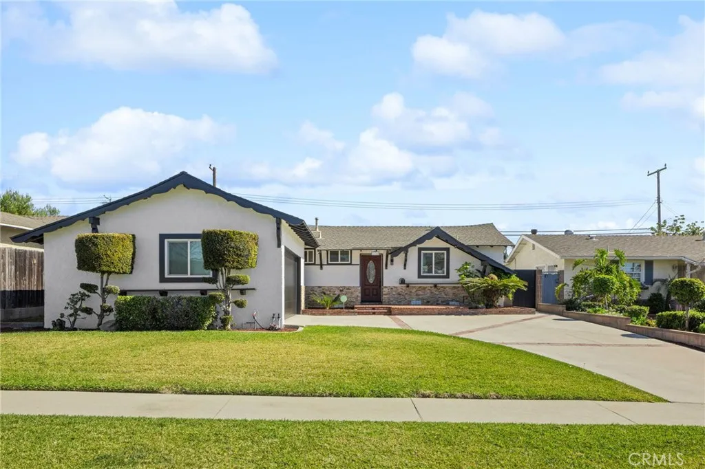 Welcome to this beautifully and thoughtfully remodeled home located in a quiet, family-friendly neighborhood in La Mirada! This turnkey 3-bedroom, 2-bathroom residence sits on a spacious lot and has been craftfully remodeled with modern finishes and attention to detail throughout. The home features new laminate flooring throughout, creating a seamless and stylish look while offering durability and easy maintenance. Double-pane windows provide energy efficiency and allow plenty of natural light to fill the home. The remodeled kitchen showcases granite countertops, ample cabinetry, and a layout designed for both everyday living and entertaining. The primary bathroom has been tastefully renovated with travertine tile and modern bronze finishes, creating a relaxing, spa-like atmosphere. The fireplace has also been beautifully done, serving as a warm and inviting focal point in the living area. Step outside to a large backyard perfect for entertaining, complete with a covered patio ideal for summer BBQs, gatherings, or relaxing evenings outdoors. The yard also features mature fruit trees ready to enjoy, adding charm and character to this wonderful outdoor space. This move-in-ready La Mirada gem offers comfort, style, and spacedont miss the opportunity to make it yours!