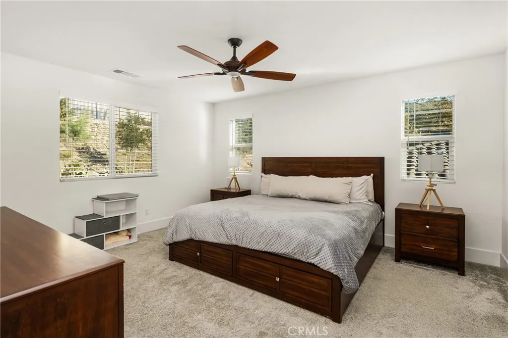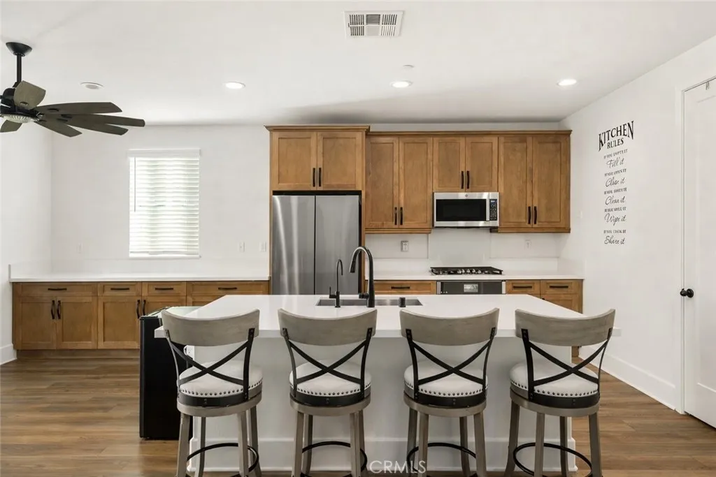 Significantly Reduced. Welcome to Skyview at Terramor, newer construction, energy efficiency, and everyday livability come together in one of the communitys best values. Built in 2022, this home stands out with fully paid, owned solar a rare and meaningful advantage that helps reduce monthly costs from day one. The layout is both functional and flexible, featuring an open-concept great room with fireplace, upgraded flooring, built-in speakers, and wired Ethernet for modern living. The kitchen is thoughtfully upgraded with quartz countertops, GE Profile stainless steel appliances, soft-close cabinetry, and a spacious pantry, all opening seamlessly to the living and dining areas. A first-floor flex room with a closet offers an easy option for a fourth bedroom, office, or guest space. Upstairs, the primary suite includes a walk-in closet and a large walk-in shower, along with two additional bedrooms, including one with its own walk-in closet. A full laundry room with sink and storage adds everyday convenience. The backyard is designed for low maintenance and easy enjoyment, with pavers, artificial turf, and a covered patio with gas hookup ideal for relaxing or entertaining without the upkeep of a larger yard. Additional features include epoxy garage floors, EV charging capability, water softener, drinking water filtration, tankless water heater, and energy-efficient systems throughout. More upgrades than any other home on the market. Located within the guard-gated Terramor community, residents enjoy access to resort-style amenities, parks, trails, dog parks, and regular comm