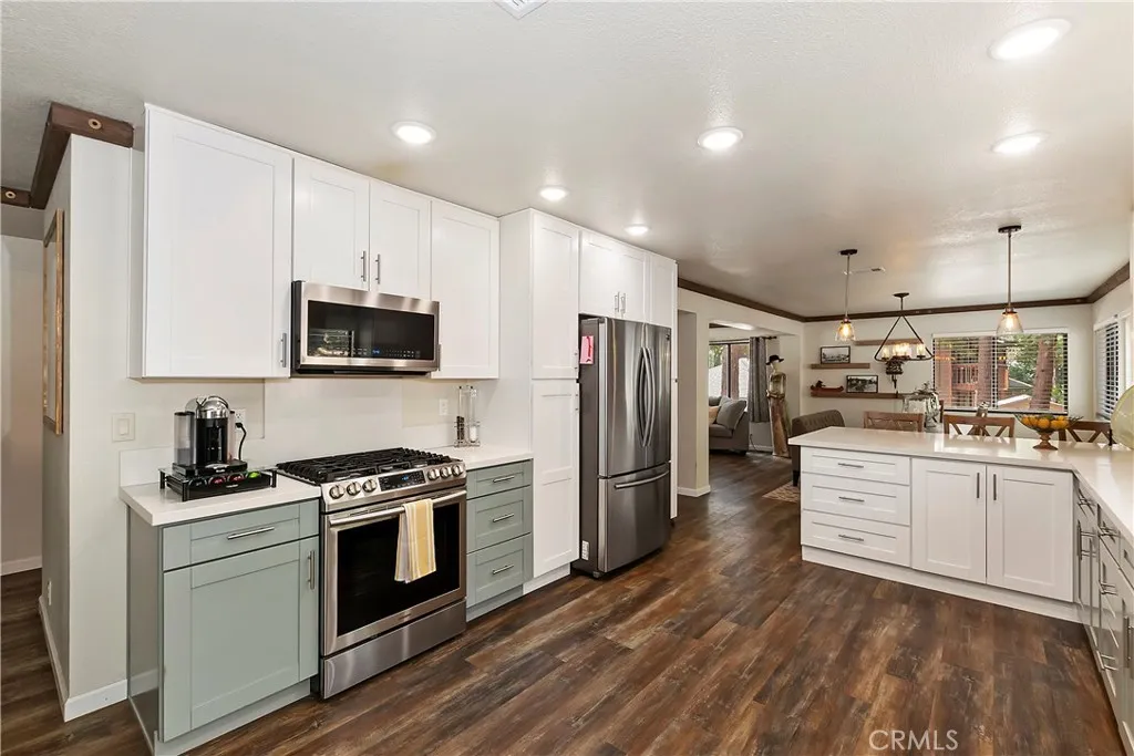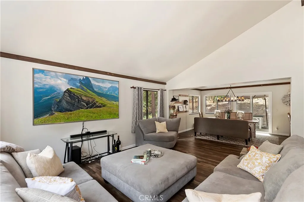 Gorgeous top of the line remodeled home with spacious attached ADU/separate living area on a large level wooded lot. Located in the popular Mile High Park neighborhood with the charming mountain town of Crestline and beautiful Lake Gregory nearby. This home is almost 2700 SQ FT plus 440 SQ FT over sized garage. Features a spacious open floorplan, cozy rustic fireplace in the den, dramatic vaulted ceilings in the main living room area plus amazing top of the line chef's kitchen with granite counters and stainless steel appliances. Upstairs includes a spacious master bedroom with en suite bathroom plus two more large bedrooms and another full bathroom. The separate living area/ADU features 1 bedroom, 1 full bath, kitchen, living room and a private concrete patio area with separate entrance. The single level separate living area/ADU features level entry as well for easy access. Large level front yard plus a huge new concrete patio in the rear for maximum outdoor entertainment space. Tons of parking with the large driveway, garage and additional side parking areas. This home has a very private feel with a large acreage forested area directly behind and big beautiful pines, cedars, and oaks all around. Current owners have put over $80,000 into recent upgrades including, new roof, new A/C, new high efficiency furnace, solar with battery backup, concrete patios, large storage shed and more. This is the ideal mountain dream home you've been waiting for...Make your offer today!