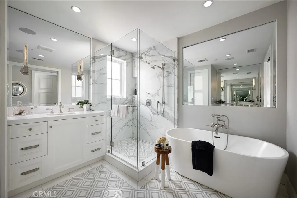 Just steps from the sand in one of Newport Beachs most coveted locations, this impeccably upgraded coastal residence offers refined design, panoramic rooftop views, and effortless seaside living across three thoughtfully designed levels connected by an elevator. This home features 3 ensuite bedrooms plus a versatile office/optional fourth bedroom and 5 bathrooms, complemented by soaring 9-foot ceilings, rich oak flooring, and custom finish carpentry. Expansive sliding doors fill the home with natural light and create seamless indooroutdoor flow, ideal for relaxed daily living or sophisticated entertaining. Two marble-clad fireplaces anchor the living spaces, adding warmth and architectural elegance. The entertainers kitchen is both functional and striking, featuring Sub-Zero refrigeration, a 48 Wolf range, double oven with steamer, built-in Wolf espresso machine, integrated wine refrigerator, custom cabinetry, and natural honed stone and Calacatta Borghini marble countertops with a statement mosaic marble backsplash. The upper level serves as a true indooroutdoor retreat, opening to dual rooftop decks with sweeping views of the Pacific Ocean, Catalina Island, city lights, Fashion Island, and Saddleback Mountain. A covered entertaining area with built-in buffet, sink, and enclosed wine refrigerator, plus a private spa, provides an ideal setting for sunset relaxation or comfortably entertaining a large party in luxury. Additionally, the third level includes a bonus/flex room, perfect for a media room, gym, game room, or private lounge, offering extra versatility separate from