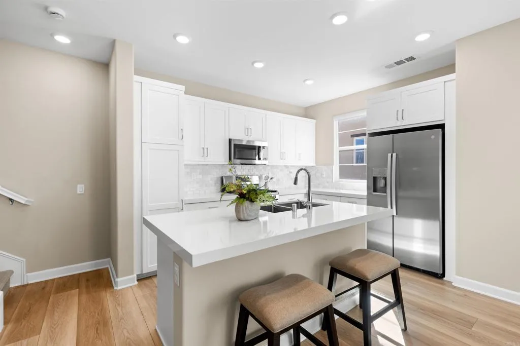 Seller Entertaining offers between $679,900-710,000 Best Price 3 Bedroom Townhome with upgrades through out. Welcome to this beautifully move in ready residence in San Marcos. Better than New Construction, this home offers modern finishes, thoughtful upgrades, and turnkey convenience including car charger in garage. The bright open concept kitchen features crisp white shaker cabinetry, quartz counter tops, stainless steel appliances, upgraded backsplash with subway tile and a spacious island. The natural light highlights the larger wide luxury plank flooring and contemporary recessed lighting throughout. This desirable end unit offers a great layout features a bedroom and full bathroom on the main living area ideal for roommates, guests, or multi generational living, or private office. The thoughtful floor plan provides separation and privacy between living spaces, making it functional and flexible for today's lifestyle. Paid solar! electric vehicle compatible, Low electric 2 car garage, gated community with quick access to highway 78, and 15. This tucked away end unit townhome has only one neighbor to the left away from main street noise with direct access to home from garage. Dont miss opportunity