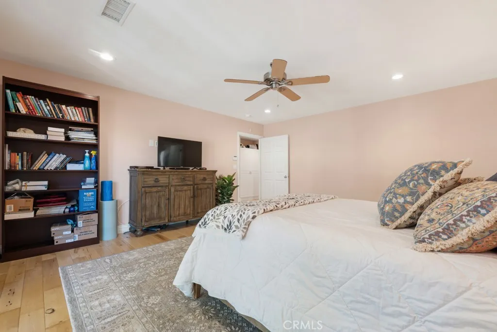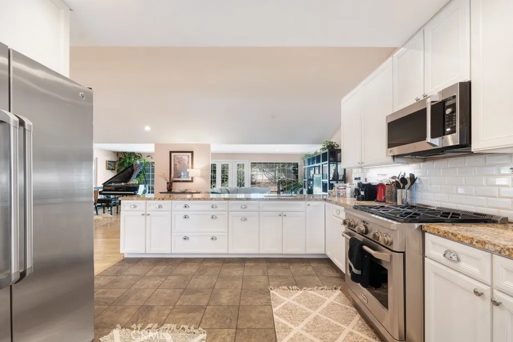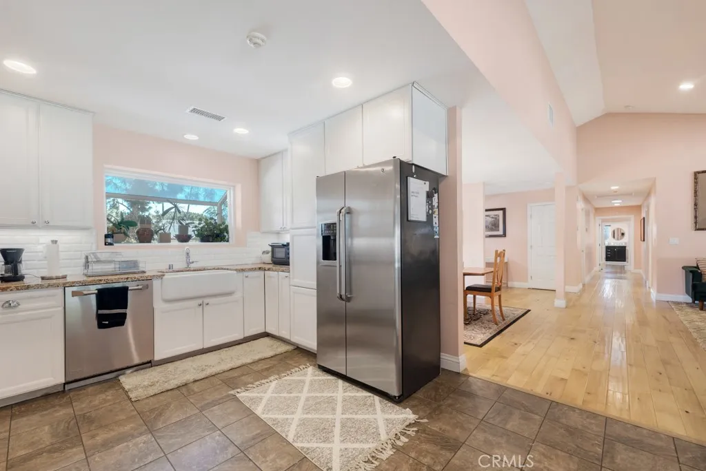 Nestled in the highly sought-after Knollwood Country Club Estates, this beautiful single-story estate offers 4 bedrooms, 3 bathrooms, 2,687 sq ft of living space, and sits on a rare 0.38-acre flat lot surrounded by tall, lush trees that create a private and tranquil setting, with a backyard ready for your vision. Stepping inside, the home is filled with abundant natural light and showcases recessed lighting and beautiful hardwood white oak flooring throughout. A welcoming foyer with a coat storage closet opens to a spacious open floor plan featuring vaulted ceilings and a wood-burning stove fireplace. The formal dining area showcases bay windows overlooking the front yard. The kitchen flows seamlessly into the living room and features large granite countertops, countertop seating, abundant cabinetry, a farmers sink, and essential appliances. The living room offers excellent natural light from large windows facing the backyard, with a subtle architectural divider creating a sense of separation and defined living spaces, along with multiple venting French doors that open to the backyard patio for effortless indoor-outdoor flow. The private bedroom wing includes a large primary suite with French doors to its own patio, an ensuite bathroom with dual vanity, soaking tub, walk-in shower, and an expansive custom walk-in closet featuring two separate rooms, skylights, and direct backyard access. Two guest bedrooms share a Jack-and-Jill bathroom, ideal for siblings or shared living, while the third bedroom across the hall is well-suited for an office or guest suite. The full hallway