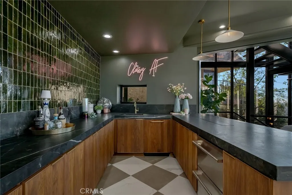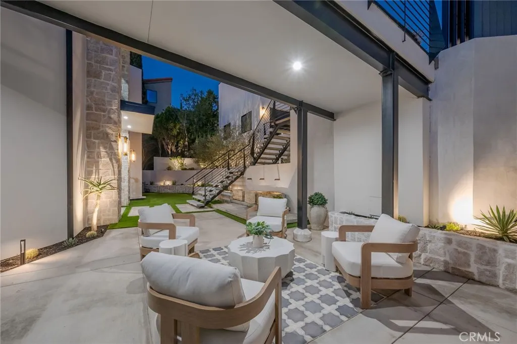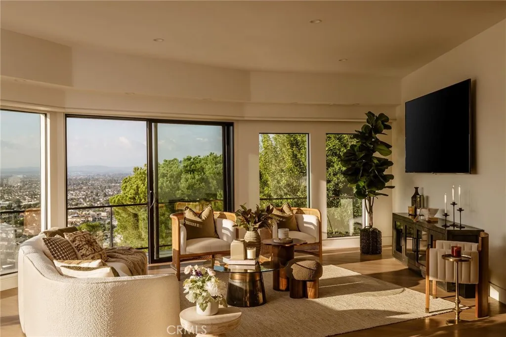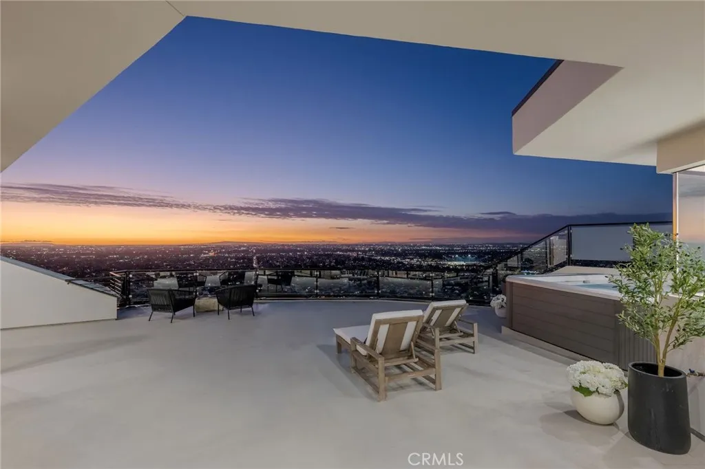 Welcome to The Halo House a one-of-a-kind trophy estate perched in the coveted hills of North Tustin, California, where 180 panoramic views stretch from Catalina Island across the Long Beach Port to the Downtown Los Angeles skyline. Enjoy nightly Disneyland fireworks, best experienced from your private hot tub under the stars. The main living level is designed for elevated everyday living and entertaining. The chefs kitchen features white oak cabinetry, quartzite waterfall countertops, full backsplash, and a complete JennAir appliance suite, plus a workstation sink. A hidden butlers pantry offers a second dishwasher, wall oven, steam oven, microwave, beverage fridge, and abundant storageideal for hosting. Walls of glass open to a view deck, creating seamless indoor-outdoor living with dramatic scenery as your backdrop. The primary suite occupies its own private level, delivering a true resort experience. Step onto a 1,200-sq-ft view deck with spa-style hot tub, travertine firepit, and lounge areas overlooking ocean, city, and sunset views. Inside, the suite includes floor-to-ceiling sliding glass doors, a dedicated office, and a spa-inspired bath with dual vanities, heated floors, and a freestanding soaking tub. The custom walk-in closet features its own washer/dryer combo and LG clothing steamer. A coffee bar and beverage fridge complete this exceptional retreat. The lower level is an entertainers dream, anchored by a full custom bar with fluted walnut cabinetry, dramatic black quartzite countertops, ice maker, dishwasher, fridge, and restaurant-style sink trough with gla