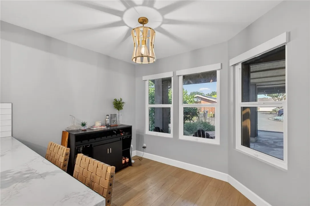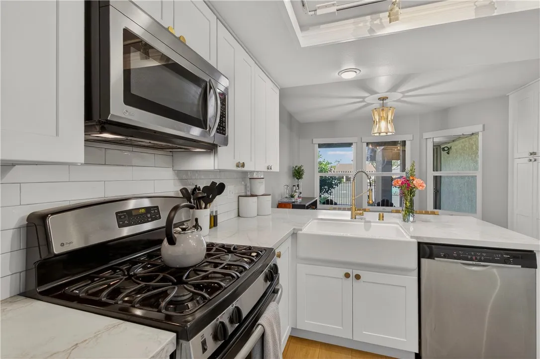 Tustin School District* Single Story* No Common Walls* 2 Car Garage* This home has it all! Enter through your gated courtyard and the impressive double doors reveal a bright and open floorplan with LVP white oak style floors throughout. The kitchen has been remodeled with crisp white cabinetry, quartz counter tops, a breakfast bar and modern details. The stunning primary suite features vaulted ceilings, 2 closets, en-suite bathroom with dual sinks, and separate shower and bathtub. The oversized secondary bedroom has dual closets and close proximity to the second full bathroom. The large living room and dining space flow seamlessly to the outdoor patio and private backyard with mature landscaping and citrus trees. The location within the community cant be beat with the corner lot and cul-de-sac with ample parking IN ADDITION to your 2 car garage. HOA amenities include a pool, spa, and central grassy area.
