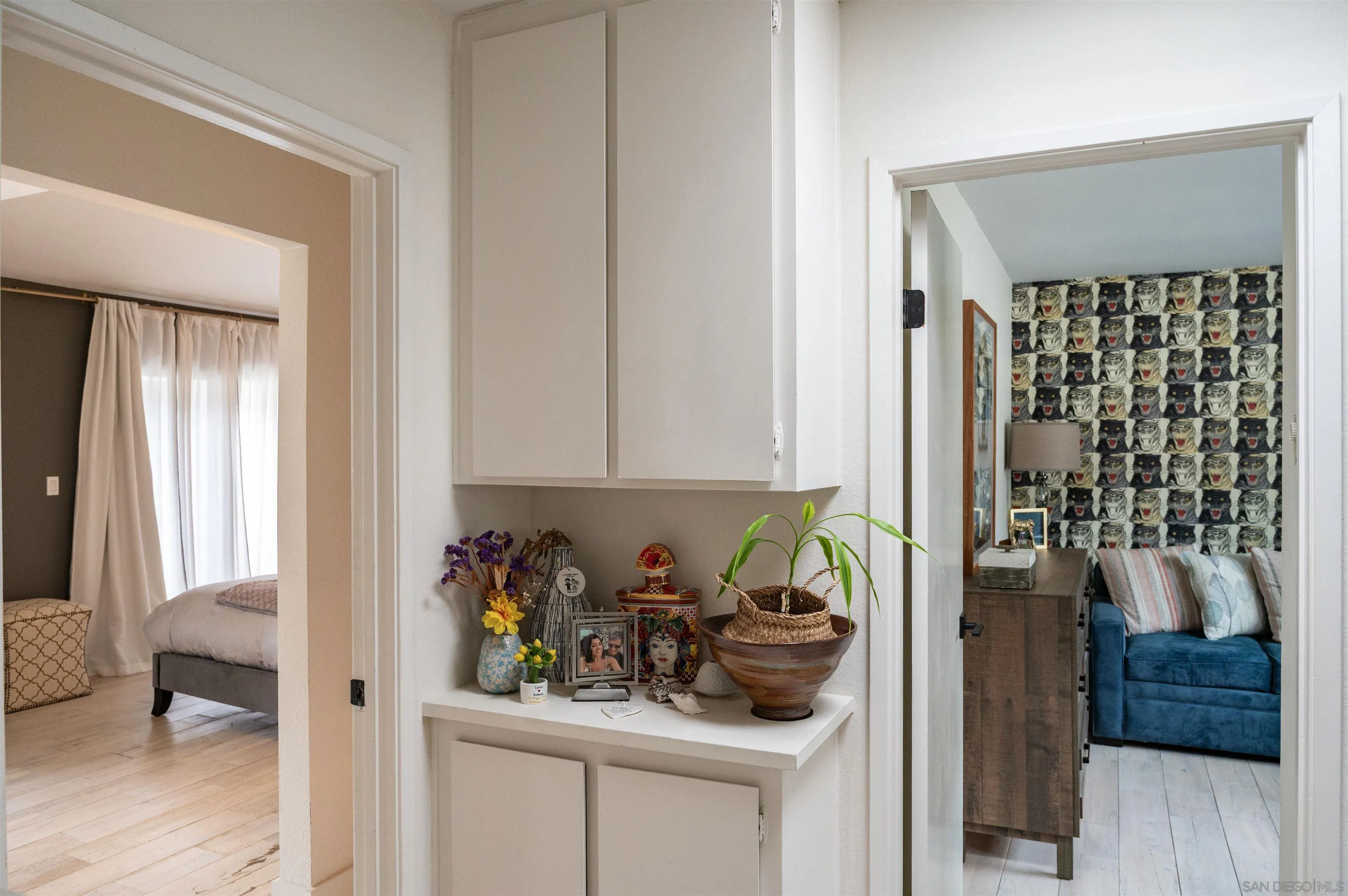 Welcome to your stay in San Diego! The rental period offered is a fixed term for min of 30 days from December 20, 2025 - January 20, 2026 OR June 1, 2026 - August 15, 2026. Enjoy al-fresco dining, or lounging on the patio, complete with plush patio furniture and beautiful plants. Sip your morning coffee and have breakfast at the outdoor marble table under a turquoise umbrella on the patio with a few culinary herbs and container fruit trees. As you step inside, you'll be greeted by an open and spacious living area with plenty of natural light. The updated kitchen features stainless steel appliances, including dishwasher, white cabinets, gray countertops, and plenty of storage space with additional pantries. The open kitchen leads seamlessly into the dining room, living room, and patio for a great flow! There are two bedrooms, one is a spacious primary with high ceilings, an ensuite bathroom, and two balconies, and the second room is cozy with a luxury sofa bed with upgraded, stylish, and comfortable foam mattress. Gucci Tiger wallpaper imported from Italy adds a creative flare. The guest bathroom is updated with wood detailing and modern touches, such as a wide contemporary white sink and stylish wood vanity. Two stylish desks are conveniently located on both levels for a comfortable work from home option. Other features of this stunning townhome include laundry as well as stylish lights for ambiance. Located in a beautifully landscaped complex complete with pool, hot tub, sauna, and tennis courts. Minutes from USD, centrally located, close to San Diego destinations!