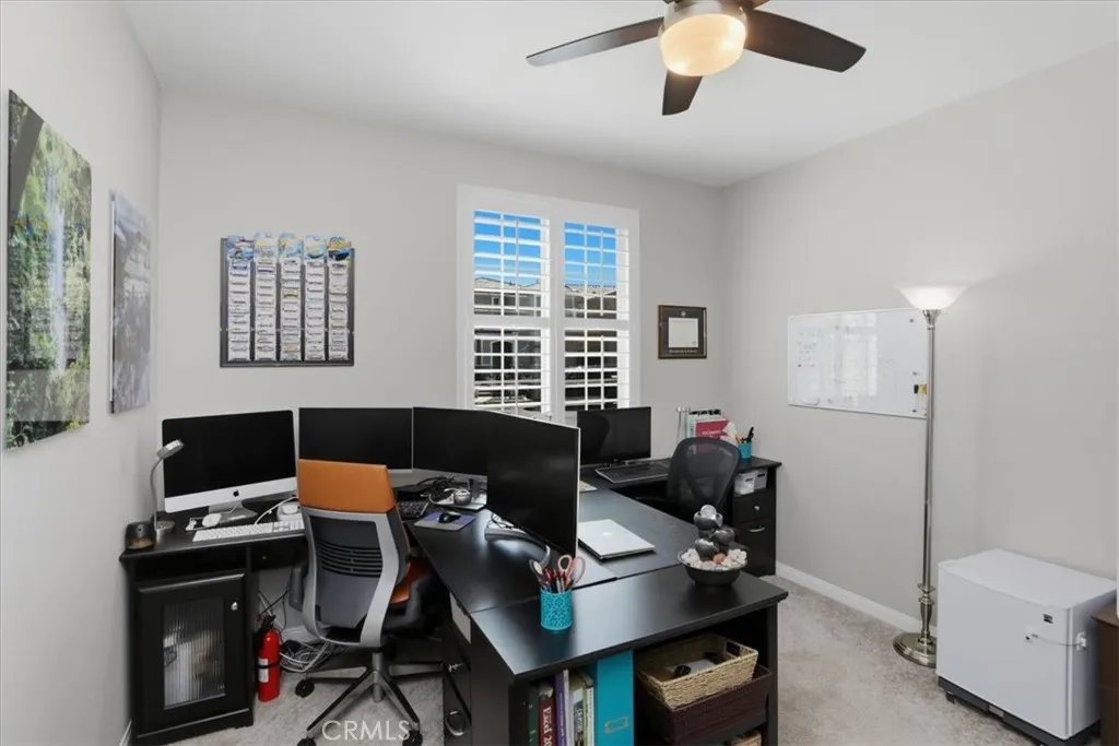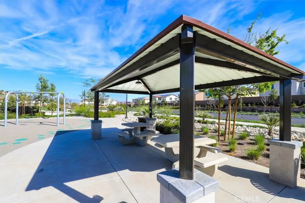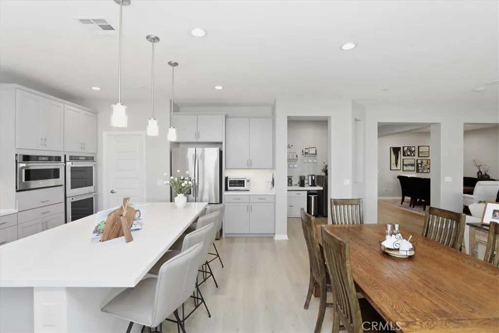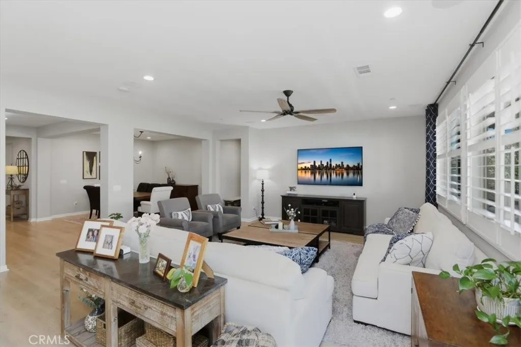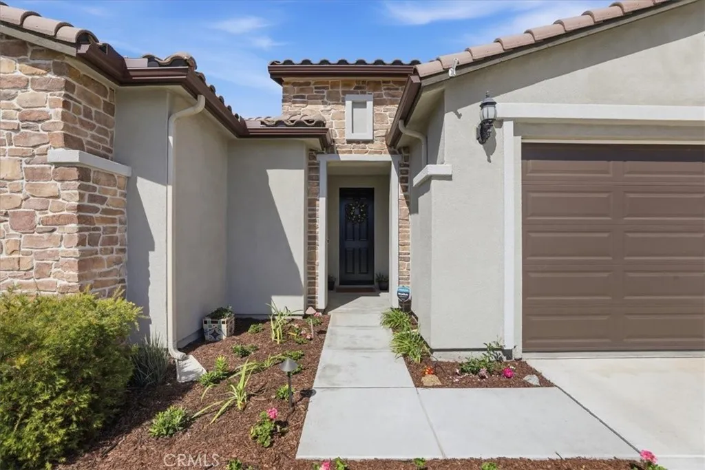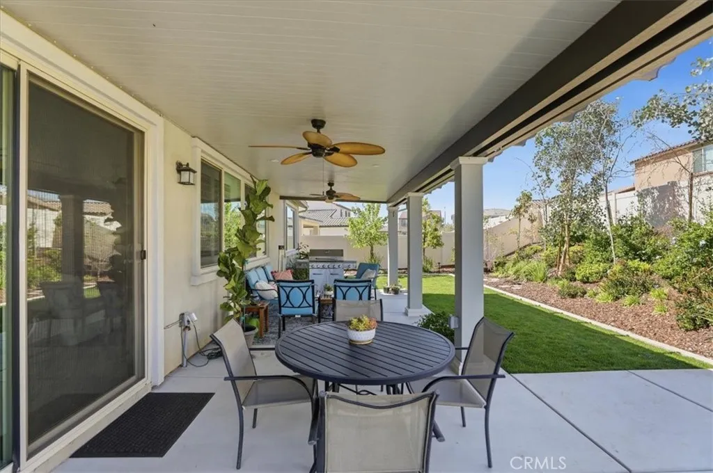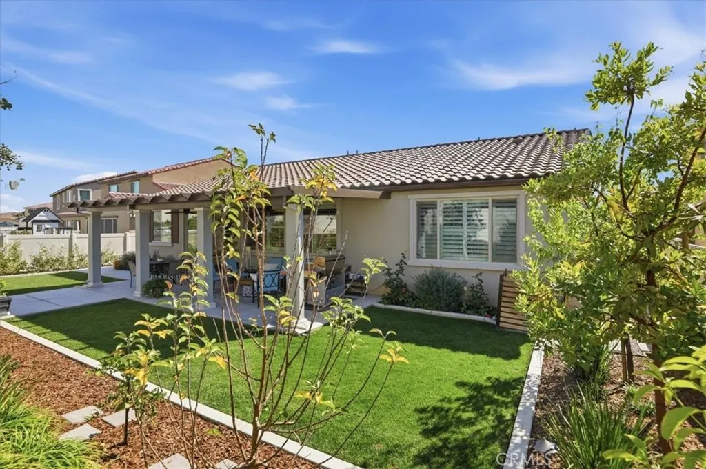 Welcome to this beautifully upgraded single-story home located in a sought-after newer gated community of Highland Grove. Less than 3 years old, Offering 2,550 square feet of thoughtfully designed living space, this spacious residence features four bedrooms and three full bathrooms, perfectly blending comfort and functionality. The open and inviting floor plan includes a formal living room and a formal dining room, ideal for entertaining guests or hosting special gatherings. At the heart of the home is a stunning upgraded kitchen showcasing elegant quartz countertops and backsplash, premium stainless steel KitchenAid appliances, and abundant cabinetry, pendant lighting, porcelain farm sink, under cabinet accent lights and pantrydesigned to impress even the most discerning chef. The living room is perfect place to unwind, very spacious and equipped with 5.1 speaker system. The private primary suite is a true retreat, featuring a spa-like bathroom with luxurious finishes, dual vanities, frameless shower, soaking tub and a spacious walk-in closet complete with custom built-ins for optimal organization. Additional highlights include a three-car tandem garage offering ample parking and storage space, along with modern upgrades throughout the home that enhance both style and convenience. Other amenities include ceiling fans, walk-in closets in secondary bedrooms, tech center currently used as a coffee bar, plantation shutters, drapes, 9 ft ceilings, integrated smart home technology and energy efficient designs to include a solar system with a battery, tankless water heater, three