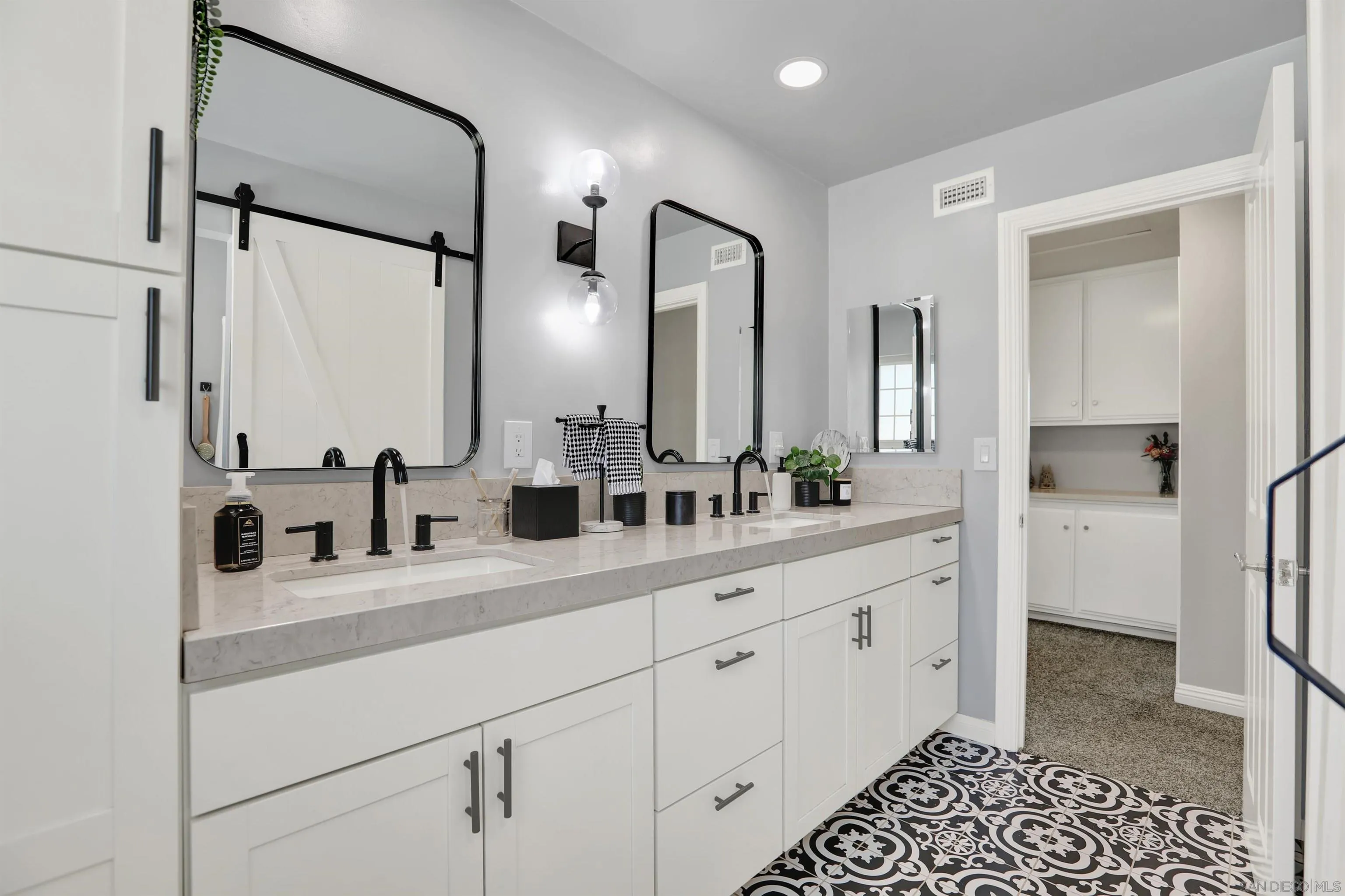 Exceptional Southwest Poway location in the highly sought-after Poway Portals neighborhood; set on a peaceful 1/3 acre, cul-de-sac lot. This inviting split-level home features a gorgeous “Farmhouse” kitchen w/huge island, ample storage and opens up to the 23’x23’ great room. Durable/easy-maintenance Tile flooring throughout the entire main level. The Primary Bedroom & spacious Living Room (at the mid-level) feature high ceilings, large picture windows bringing in abundant natural light, and a striking white brick fireplace. The Primary Bath has been updated w/herringbone tile floors, white cabinetry, mirrored triple closet doors, separate shower/toilet room w/Barn Door for privacy. The Upper-Level houses all three secondary bedrooms and Bathroom; featuring fun black & white tile floors, dual sinks, ample storage & another space-saving Barn Door. Additional upgrades include: Freshly painted interior & exterior, brand new concrete driveway, brand new HVAC System, Newer Roof & Fully PAID-FOR Solar, resurfaced (pebble-finish) Pool w/Baja Shelf, Newer Pool Equipment, Dual-Pane Windows, Whole House Fan, Ceiling fans in All Bedrooms & Family Room. The spacious backyard offers low-maintenance landscaping; Artificial Turf, raised planters w/drip irrigation, Vinyl Fencing, several entertaining areas; including a large Gazebo to escape the Sun. Ample parking; including room for your Boat and/or RV (w/clean-out).