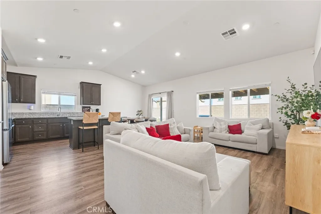 Built in 2023, this 3 bedroom, 2 bath home offers approximately 1,600 sq ft of living space in Victorville. The floor plan features a long entry leading to an open living area. The kitchen includes granite countertops, center island with seating, and stainless steel appliances. PAID OFF solar, and $15,000 upgraded patio and backyard. Bedrooms are spacious, including a primary suite. The property offers an oversized backyard with potential for outdoor use or future improvements. Additional features include smart home technology, LED recessed lighting, and a tankless water heater.