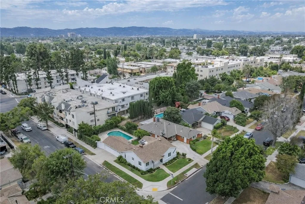 Welcome to this beautifully remodeled single-story 3bedroom home on a desirable corner lot in Van Nuys. Bright and open, the home features recessed lighting, new flooring, and a statement floor-to-ceiling stone fireplace. The updated kitchen showcases shaker cabinetry, quartz countertops with a matching backsplash, and built-in stainless steel appliances. All three bedrooms are generously sized with ample closet space, and the primary suite offers a walk-in closet and an en-suite bath with a dual sink vanity and sleek glass walk-in shower. Outside, enjoy a private backyard retreat complete with a sparkling pool ideal for summer gatherings. A charming breezeway patio with access from both the kitchen and primary suite creates a private outdoor sitting area, perfect for morning coffee. The detached 2 car garage offers incredible ADU potential with its own separate entrance, plus additional space to expand, an excellent opportunity for future rental income or multi generational living. This turnkey property blends comfort, style, and investment potential in one exceptional package.