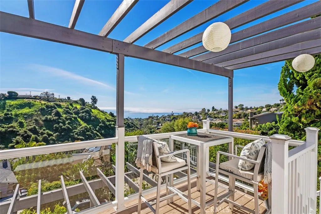 Enjoy panoramic ocean and hillside views from every level in this highly upgraded 5-bedroom, 4-bath home in the sought-after Temple Hills neighborhood of Laguna Beach. Situated on a large street-to-street lot, this property blends coastal style with modern comfort. This home is Day 1 move-in condition. The interior features European white oak floors, high ceilings, and exposed wood beams that fill the home with great natural light. Expansive sliding glass doors on each level open to multiple decks and patios, creating effortless indoor/outdoor living. The gourmet kitchen includes Thermador appliances, custom cabinetry with quartz counters, and Italian porcelain tile, seamlessly connecting to the dining and living areas with ocean-view access. The primary suite offers panoramic views, a fireplace, and a private deck, while the secondary bedrooms include a separate-entrance suite ideal for guests or extended family. A bonus/media/game room with its own deck adds flexibility for entertaining or work. Additional features include owned solar, air conditioning and heating, tankless hot water heater, custom built-ins, dual laundry hookups, and two 2-car garages with epoxy floors. Quiet and private, yet moments from downtown Lagunas beaches, shops, and restaurants, this is coastal living at its best. Don't forget to check out the video and 3-D walkthrough!