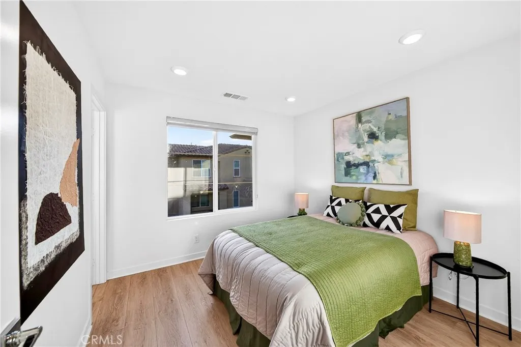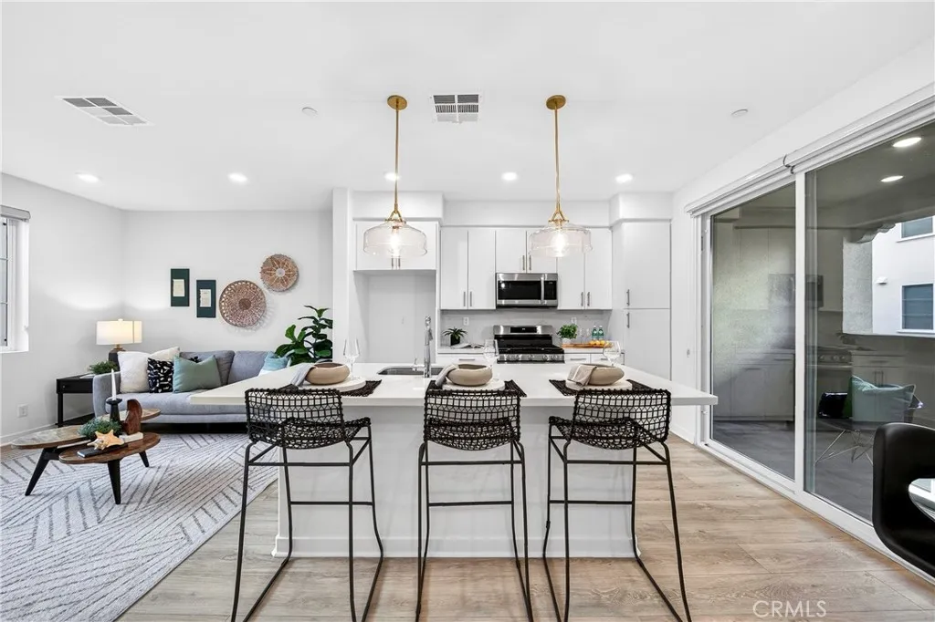 Nestled in the highly sought-after "Laurel Walk" community by Olson Homes, this stunning "Clementine" model townhouse offers the perfect blend of modern luxury and sustainable living. Built in 2022, this turnkey residence features 2 spacious bedrooms, 2.5 bathrooms, and a bright, open-concept floor plan designed for both comfort and style. A standout financial advantage of this home is the fully paid-off solar system, providing significant monthly energy savings. The interior has been thoughtfully upgraded with premium laminate flooring throughout the entire home, offering a sleek, carpet-free environment that is both durable and easy to maintain. The chef-inspired kitchen, anchored by a large center island, flows seamlessly into the airy living area and a private outdoor deck. For added comfort, a whole-house water softener system has been professionally installed to ensure high-quality water and longevity for all appliances. Upstairs, two primary-style suites each offer private ensuite bathrooms and walk-in closets. Complete with a two-car attached garage and located just minutes from the 5 freeway, local shopping, and La Miradas premier parks, this home combines sophisticated modern upgrades with ultimate energy efficiency.