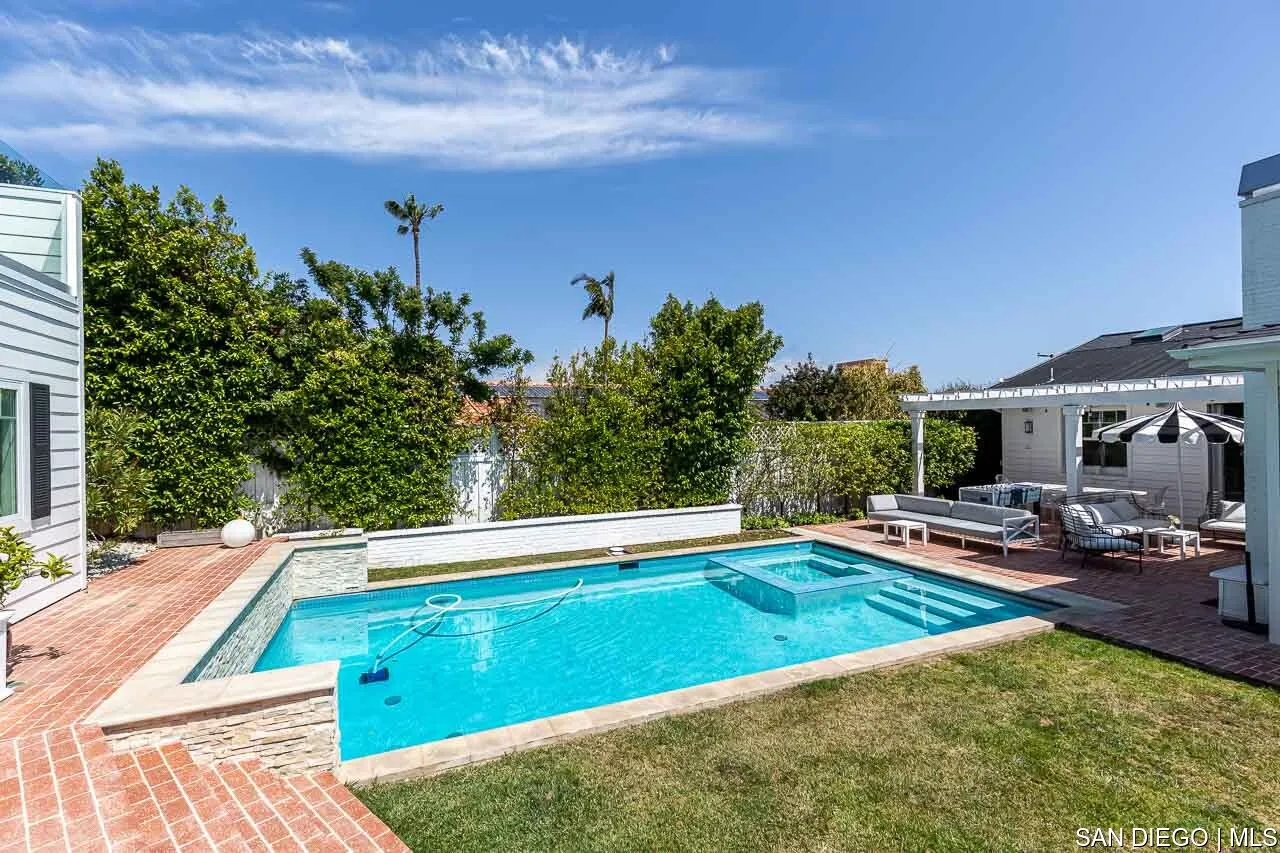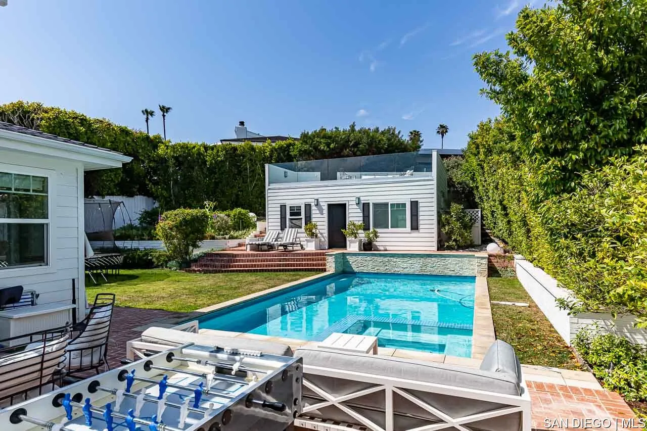 Beautiful and serene single-level new construction (built 2015) in the lovely Muirlands. Clean and contemporary interior with 9-ft ceilings, open floor plan, Duchateau hardwood floors throughout, and large pocket doors in living room that open to large backyard with pool, jacuzzi, BBQ, grassy yard and separate guest house with rooftop deck with ocean views looking south. Never before rented; one month minimum, with preference for 12-month lease; available September 12, 2025. Located within Bird Rock Elementary and La Jolla High School districts. Renter pays all utilities but owner pays for cleaning service twice a month. Main house is 4 bed 2 1/2 bath and detached guest house behind pool is 1 bed 1 bath. Listing broker has ownership interest in LLC owner.