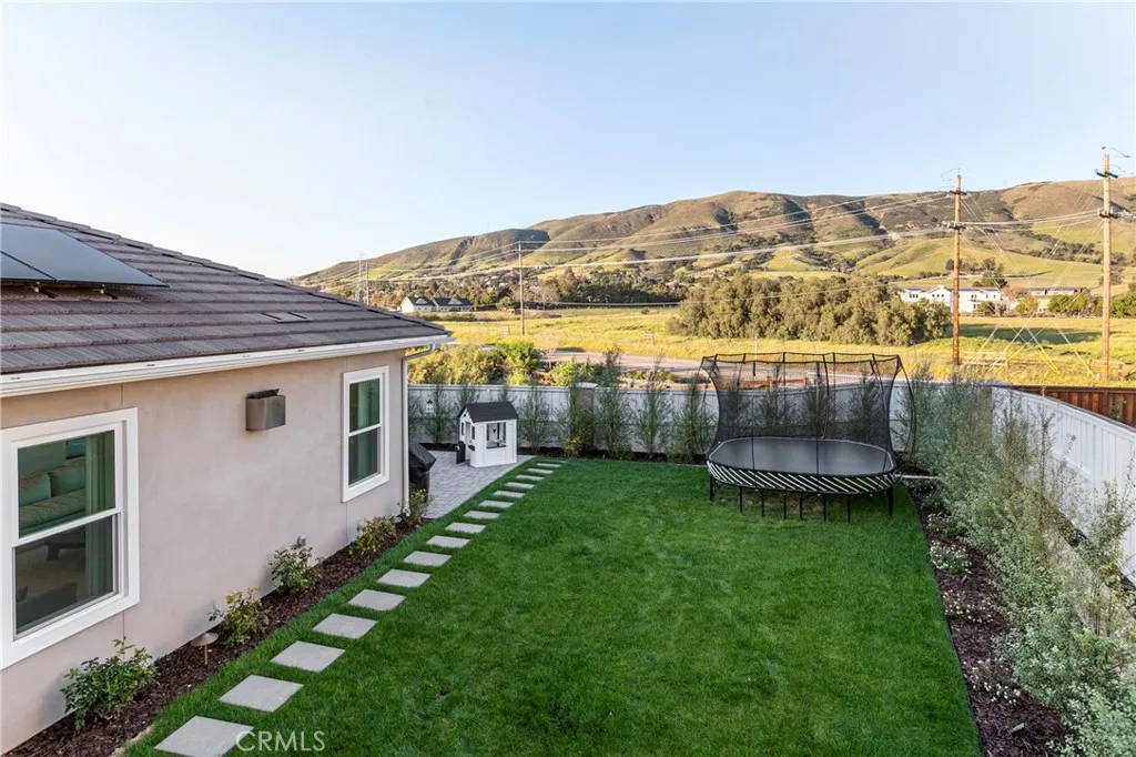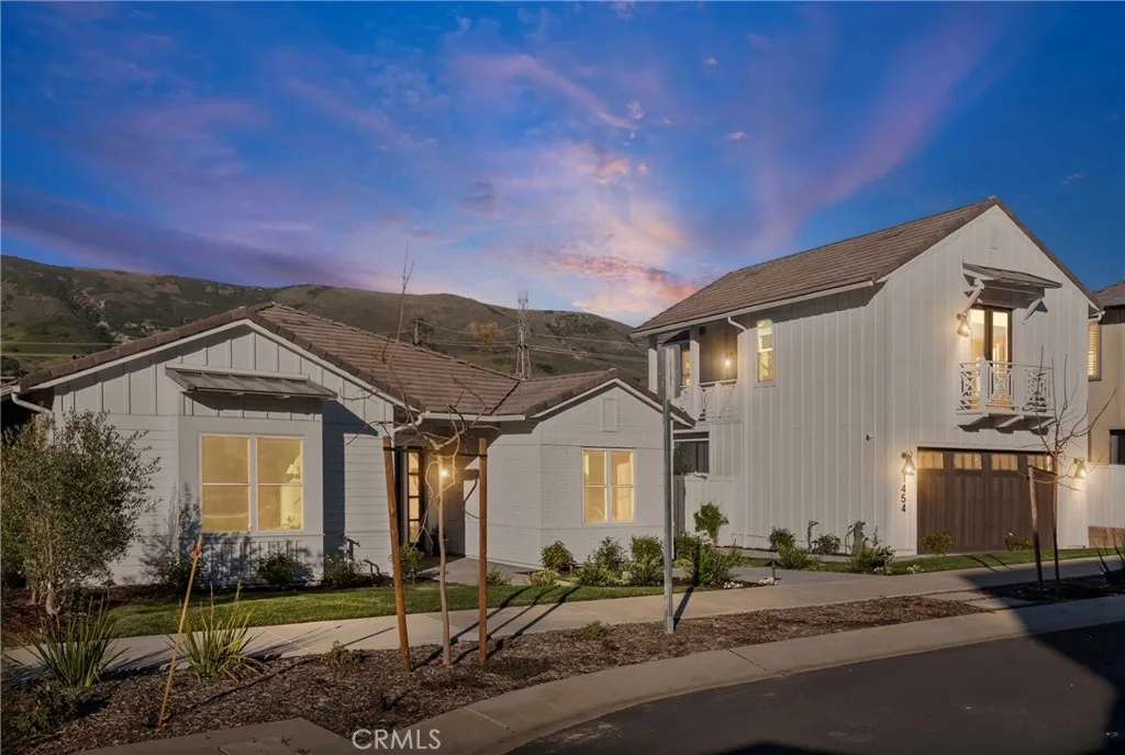 Luxurious Single-Level living in the prestigious Enclave at Righetti Ranch, one of San Luis Obispos most sought-after communities. Completed in 2025, this nearly new single-level residence showcases exceptional craftsmanship, tall ceilings, European oak flooring, and sweeping panoramic hillside views. The primary residence offers approximately 3,063 square feet with three bedrooms, a dedicated office, and three-and-a-half bathrooms, thoughtfully designed for comfort and elevated living. A detached 684 square-foot carriage home above the three-car tandem garage provides a fully independent one-bedroom residence with private balcony, kitchen, and laundry; ideal for guests, multigenerational living, or income potential. At the heart of the home, a gourmet kitchen features honed marble countertops, a generous island with stainless-steel farmhouse sink, premium JennAir appliances including a six-burner cooktop with griddle, and a built-in Sub-Zero refrigerator. A secondary prep kitchen enhances entertaining with double JennAir ovens, beverage refrigerator, secondary sink, and oversized walk-in pantry. The expansive great room offers a gas fireplace, custom drapery, and large sliding glass doors opening to the landscaped backyard with covered paver patio, lawn, and private, tree-lined setting. The luxurious primary suite features panoramic views, dual walk-in closets, and a beautifully appointed bathroom with freestanding soaking tub, oversized dual-head shower, and marble finishes. Two additional bedrooms offer en-suite baths and walk-in closets, while the office provides flexib