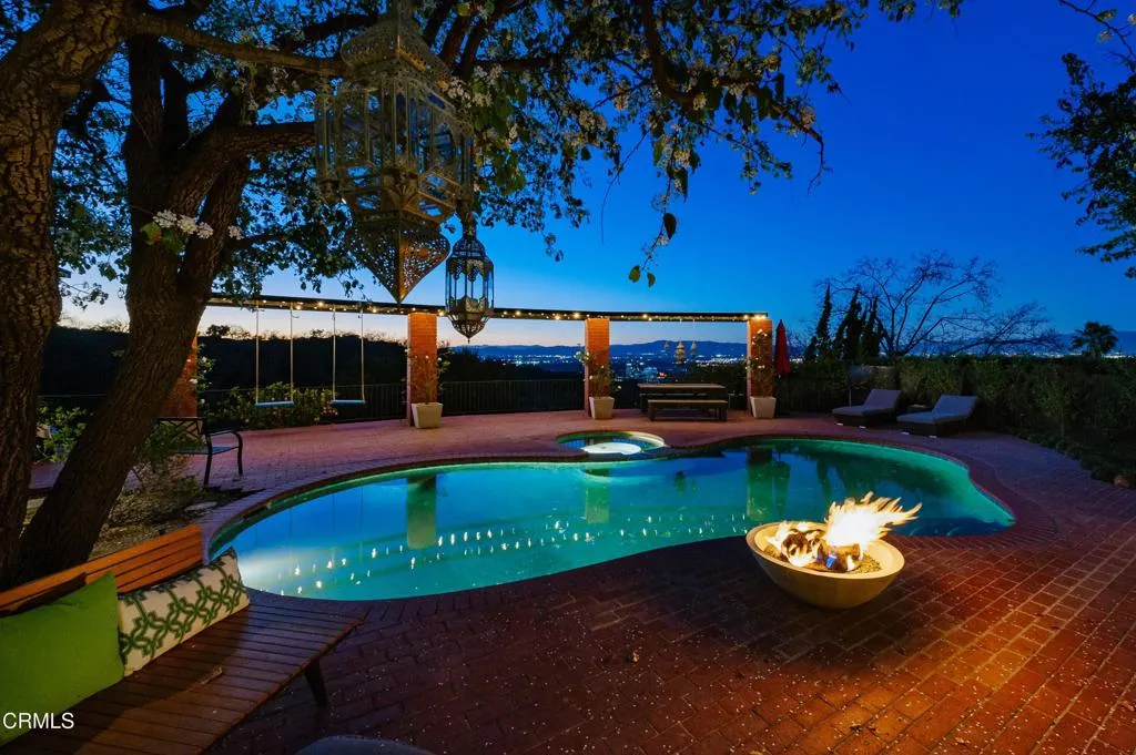 Enjoy the ease of single-story living in this charming home tucked away on a quiet, private cul-de-sac street. Perfectly located for convenient access to the Westside and the popular shops and restaurants along Ventura Blvd, the home offers a relaxed Valley lifestyle paired with serene canyon preserve views and sparkling city lights in the distance.Inside, the thoughtfully designed floor plan features open, spacious rooms that take full advantage of the beautiful surroundings. The living room, complete with a fireplace, opens to a welcoming front patio with a fire pit--an ideal setting for casual gatherings or peaceful evenings outdoors. The kitchen features stainless steel appliances and a center island and flows easily into the dining area and sun room for effortless entertaining. A large additional family room provides flexible space for everyday living, relaxing, or hosting guests.The primary suite is generously sized and positioned to capture the tranquil views. It includes a large walk-in closet and a well-appointed bathroom with dual sinks, a soaking tub, and an oversized walk-in shower. The backyard creates a true retreat with a large pool and spa overlooking the canyon, while a grassy area offers room for play.A wonderful combination of privacy, views, and location, this home offers comfortable living in a beautifully peaceful setting.