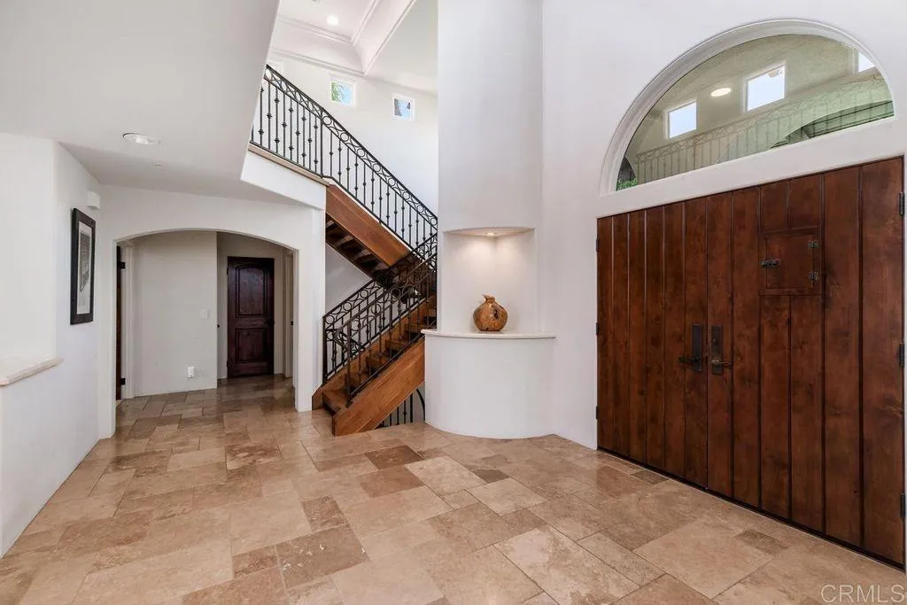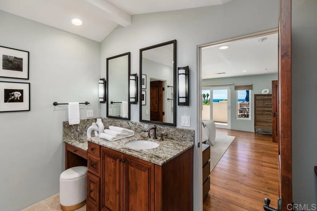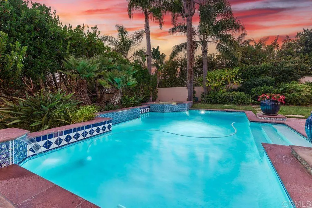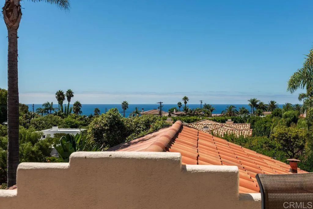 Elegant Mediterranean Villa with Riviera-Style Ambiance in Cardiffs Coveted Composer District! This residence offers ocean views, lush gardens, pool/jacuzzi with waterfall features. Timeless Architectural Highlights: stone columns flank the double door entry that opens to soaring ceilings, oversized crown molding. Dramatic staircase with wrought iron railings & wood plank steps lead to the mezzanine with ocean views & the soaring entry area...other highlights include art niches and perfectly placed windows bringing in natural light. The rich wood plank floors and tumbled travertine stone offers warmth and elegance. Main floor living offers stone surround fireplaces, open beam ceiling, custom cabinetry and arched windows. The Formal Dining Room is next to the custom designed kitchen, with abundant granite countertop, glass front cabinetry w/ custom hardware and high end appliances. The heart of the home kitchen opens to the family room with open beam ceilings, built in entertainment wall (find the seahorse handles!) Sliding glass door leads to an entertainment deck perfect for indoor outdoor entertaining and a staircase to the pool and gardens. The main floor has a guest bedroom with a charming bay window seat near main level bathroom. Upstairs off the mezzanine is the spacious primary suite and deck with amazing ocean and coastline views. The suite includes a luxurious primary bath plus a large customized walk-in closet. Downstairs are two bedrooms with walk-in closets sharing a Hollywood Jack & Jill bath...Billiards/Game room w/fireplace, and a built-in office area, temper