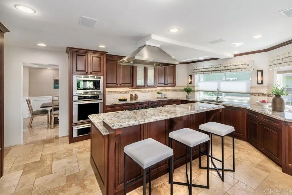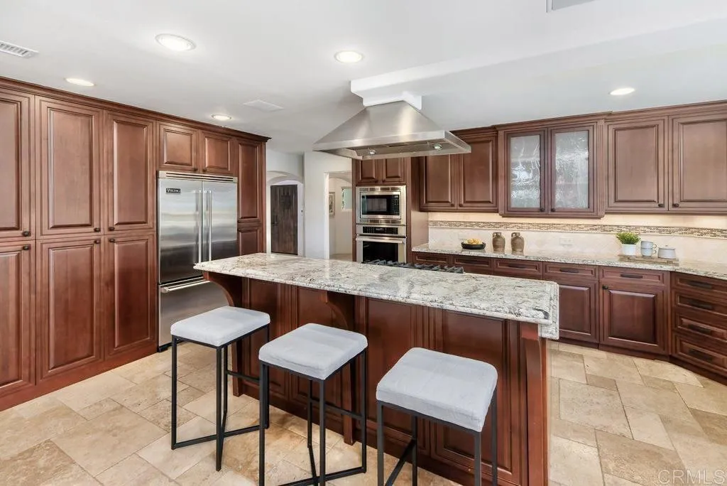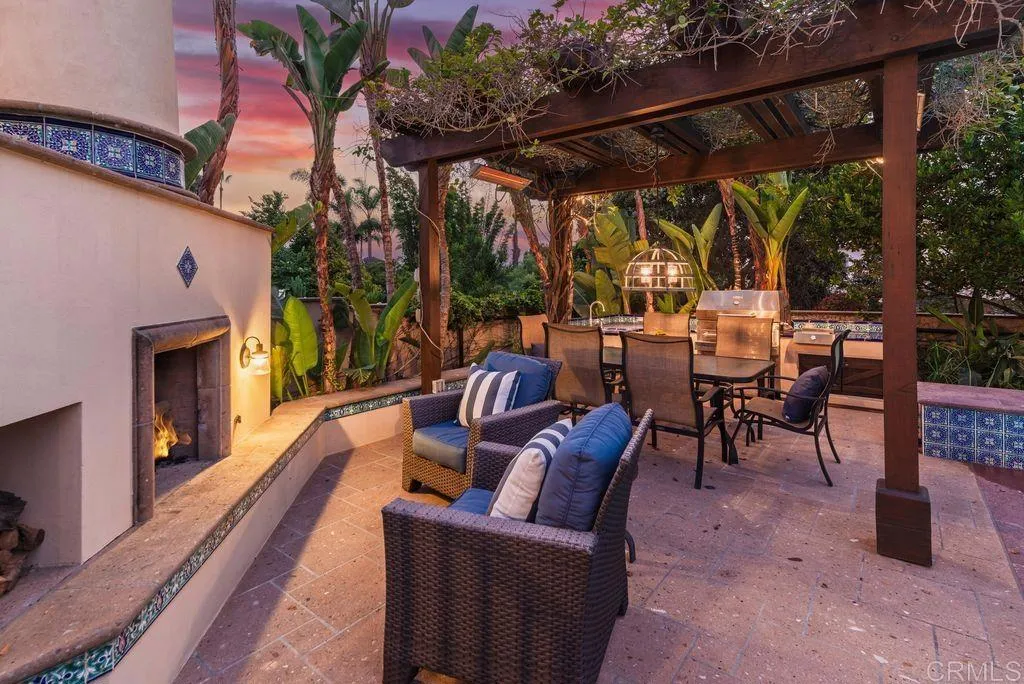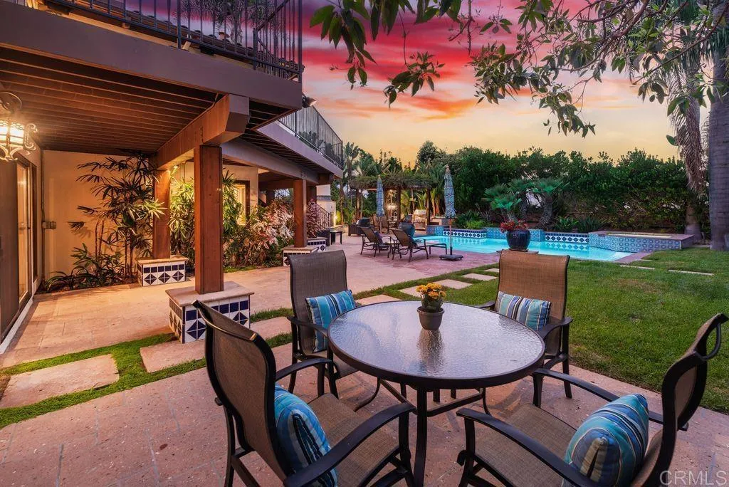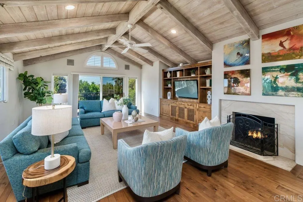 Elegant Mediterranean Villa with Riviera-Style Ambiance in Cardiffs Coveted Composer District! This residence offers ocean views, lush gardens, pool/jacuzzi with waterfall features. Timeless Architectural Highlights: stone columns flank the double door entry that opens to soaring ceilings, oversized crown molding. Dramatic staircase with wrought iron railings & wood plank steps lead to the mezzanine with ocean views & the soaring entry area...other highlights include art niches and perfectly placed windows bringing in natural light. The rich wood plank floors and tumbled travertine stone offers warmth and elegance. Main floor living offers stone surround fireplaces, open beam ceiling, custom cabinetry and arched windows. The Formal Dining Room is next to the custom designed kitchen, with abundant granite countertop, glass front cabinetry w/ custom hardware and high end appliances. The heart of the home kitchen opens to the family room with open beam ceilings, built in entertainment wall (find the seahorse handles!) Sliding glass door leads to an entertainment deck perfect for indoor outdoor entertaining and a staircase to the pool and gardens. The main floor has a guest bedroom with a charming bay window seat near main level bathroom. Upstairs off the mezzanine is the spacious primary suite and deck with amazing ocean and coastline views. The suite includes a luxurious primary bath plus a large customized walk-in closet. Downstairs are two bedrooms with walk-in closets sharing a Hollywood Jack & Jill bath...Billiards/Game room w/fireplace, and a built-in office area, temper