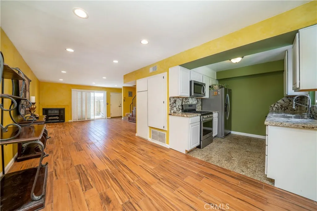 WOW! NOW REDUCED! California Living at its finest in this updated townhouse, just south of the famed Ventura Blvd with all its shopping and fine restaurants! The gated security entrance leads you to this cozy 8 unit boutique building offering a quieter more community-like feel than a larger complex. AND, a lower than normal monthly HOA fee. The double door entry opens to light and airy floor plan with laundry IN THE UNIT! The living room and dining area boasts easy to care for Italian woodgrain tile and newer recessed lighting; it's warmed by the fireplace and feeds out to the private patio via the sliding glass door and its plantation shutters. The updated kitchen with newer appliances and fixtures, and ample granite counters will make any home-chef happy! The downstairs powder room has a new toilet and new fixtures. Primary Bedroom #1 contains a sizable walk-in closet. The larger Primary Bedroom #2 also has more than ample closet space. The main bathroom has been updated with an oversized tub and chic fixtures. In the rear of the complex lies a unique paved backyard perfect for BBQ's or social gatherings. Don't forget the VERY LOW HOA!